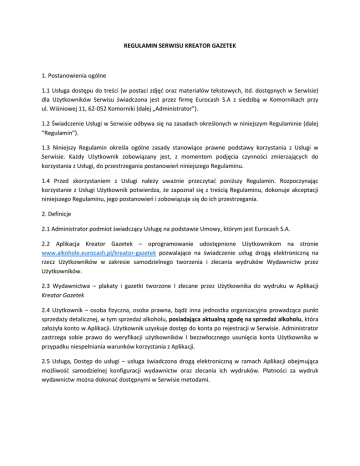REGULAMIN SERWISU KREATOR GAZETEK 1. Postanowienia ogólne 1.1 Usługa dostępu do treści (w postaci zdjęć oraz materiałów tekstowych, itd. dostępnych w Serwisie) dla Użytkowników Serwisu świadczona jest przez firmę Eurocash S.A z siedzibą w Komornikach przy ul. Wiśniowej 11, 62-052 Komorniki (dalej „Administrator”). 1.2 Świadczenie Usługi w Serwisie odbywa się na zasadach określonych w niniejszym Regulaminie (dalej “Regulamin”). 1.3 Niniejszy Regulamin określa ogólne zasady stanowiące prawne podstawy korzystania z Usługi w Serwisie. Każdy Użytkownik zobowiązany jest, z momentem podjęcia czynności zmierzających do korzystania z Usługi, do przestrzegania postanowień niniejszego Regulaminu. 1.4 Przed skorzystaniem z Usługi należy uważnie przeczytać poniższy Regulamin. Rozpoczynając korzystanie z Usługi Użytkownik potwierdza, że zapoznał się z treścią Regulaminu, dokonuje akceptacji niniejszego Regulaminu, jego postanowień i zobowiązuje się do ich przestrzegania. 2. Definicje 2.1 Administrator podmiot świadczący Usługę na podstawie Umowy, którym jest Eurocash S.A. 2.2 Aplikacja Kreator Gazetek – oprogramowanie udostępnione Użytkownikom na stronie www.alkohole.eurocash.pl/kreator-gazetek pozwalające na świadczenie usług drogą elektroniczną na rzecz Użytkowników w zakresie samodzielnego tworzenia i zlecania wydruków Wydawnictw przez Użytkowników. 2.3 Wydawnictwa – plakaty i gazetki tworzone I zlecane przez Użytkownika do wydruku w Aplikacji Kreator Gazetek 2.4 Użytkownik – osoba fizyczna, osoba prawna, bądź inna jednostka organizacyjna prowadząca punkt sprzedaży detalicznej, w tym sprzedaż alkoholu, posiadająca aktualną zgodę na sprzedaż alkoholu, która założyła konto w Aplikacji. Użytkownik uzyskuje dostęp do konta po rejestracji w Serwisie. Administrator zastrzega sobie prawo do weryfikacji użytkowników I bezzwłocznego usunięcia konta Użytkownika w przypadku niespełniania warunków korzystania z Aplikacji. 2.5 Usługa, Dostęp do usługi – usługa świadczona drogą elektroniczną w ramach Aplikacji obejmująca możliwość samodzielnej konfiguracji wydawnictw oraz zlecania ich wydruków. Płatności za wydruk wydawnictw można dokonać dostępnymi w Serwisie metodami. 3. Zasady dostępu do Usługi w Aplikacji 3.1 Rejestracja w Aplikacji następuje poprzez serwis www.alkohole.eurocash.pl/kreator-gazetek. Użytkownik podczas rejestracji podaje numer NIP, który podlega weryfikacji Administratora. Weryfikacja dotyczyć będzie w szczególności tego, czy dana jednostka organizacyjna prowadzi sprzedaż detaliczną alkoholu I posiada wszystkie niezbędne zgody (wszystkie przewidziane w polskim prawie) na sprzedaż alkoholu konsumentom. 3.2 Użytkownik może samodzielnie skonfigurować Wydawnictwo: zadecydować o konfiguracji Plakatu oraz /lub Gazetki, formacie Wydawnictwa (dotyczy Plakatów). Może dodać do Wydawnictwa produkty wybrane wcześniej przez Administratora. W przypadku produktów objętych retrorabatem, Użytkownik nie może samodzielnie skonfigurować cen produktów w Wydawnictwie. 3.3 Użytkownik po skonfigurowaniu Wydawnictwa otrzymuje plik przygotowany do jego wydruku. Użytkownik może wydrukować Wydawnictwo samodzielnie bądź zlecić jego wydruk poprzez Aplikację. 3.4 Użytkownik co do zasady zleca wydruk Wydawnictw przez Aplikację na własny koszt. Koszt wydruku poprzez Aplikację może zostać zmniejszony w drodze dodania do Wydawnictwa produktów i reklam dofinansowujących wydruk w Aplikacji. 3.5 Wszystkie podawane ceny wydruku Wydawnictw są cenami brutto określanymi zgodnie z obowiązującymi przepisami. 3.6 W ramach Usługi dostępne są następujące Wydawnictwa: - Gazetki Reklamowe: Wydawnictwa kilkustronnicowe, zawierające produkty pochodzące z Katalogu produktów udostępnionego przez Administratora w Aplikacji I reklamy udostępnione przez Administratora w Aplikacji - Plakaty - Wydawnictwa jednostronicowe, zawierające produkty pochodzące z Katalogu produktów udostępnionego przez Administratora w Aplikacji I reklamy udostępnione przez Administratora w Aplikacji 3.7 Administrator dostarcza w Aplikacji domyślnie zapisy prawne niezbędne do spełnienia wymogów aktualnie obowiązujących przepisów prawnych. Użytkownik oświadcza, iż przyjmuje do wiadomości, iż jest zobowiązany do samodzielnego dostosowania zapisów prawnych znajdujących się na Wydawnictwach. Za powyższe działania jak i zaniechania Użytkownik ponosi pełną i wyłączną odpowiedzialność Warunkiem przyjęcia Zlecenia do wydruku w Aplikacji jest prawidłowe opłacenie zamówienia. Administrator może zwrócić się w tym celu do Użytkownika z prośbą o przesłanie potwierdzenia przelewu celem weryfikacji płatności. 3.8 Użytkownikowi, który opłacił wydruk Wydawnictwa w Aplikacji zostanie wystawiona Faktura VAT za wydruk. 3.9 Dostarczenie Wydawnictw do Użytkownika zamawiającego wydruk w Aplikacji, następuje najpóźniej w ciągu 7 dni roboczych od dnia zlecenia wydruku. Każdorazowo Użytkownik zlecający wydruk widzi w Aplikacji termin realizacji zlecenia przed ostatecznym wysłaniem zamówienia do wydruku. Dla uniknięcia wątpliwości strony zgodnie postanawiają, iż Administrator nie ponosi odpowiedzialności za działanie firm kurierskich. 3.10 Użytkownik zlecający Wydruk obowiązany jest do podania prawidłowych danych kontaktowych i adresu dostawy zamówienia podczas zlecania wydruku Wydawnictwa. Za nieprawidłowy adres dostawy I problemy z tym związane , w tym opóźnienie dostawy zamówienia, odpowiada Użytkownik. 3.11 Użytkownik ma prawo zrezygnować z zamówienia tylko jeśli zamówiona gazetka lub plakat nie zostały jeszcze zlecone do wydruku. 3.12 Takie Zamówienie przed zleceniem do wydruku zostaje anulowane I nie jest realizowane. Opłacona kwota zostaje Użytkownikowi zwrócona na wskazane przez niego konto w ciągu 14 dni roboczych. W przypadku gdy