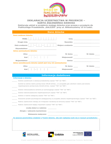 DEKLARACJA UCZESTNICTWA W PROJEKCIE – KARTA ZGŁOSZENIA DZIECKA Deklaruję udział w projekcie mojego dziecka oraz proszę o przyjęcie do Publicznego Przedszkola „GALILEO” przy ul. Billewiczówny 15 w Łodzi. Dane dziecka Dane osobowe dziecka: PESEL Imię Drugie imię Nazwisko Data urodzenia - - Miejsce urodzenia Obywatelstwo Adres zamieszkania dziecka: Ulica Nr domu Kod - Nr lokalu Miejscowość Województwo Gmina Adres zameldowania dziecka (jeżeli jest inny niż zamieszkania) Ulica Nr domu Kod - Nr lokalu Miejscowość Informacje dodatkowe Informacje o dziecku: Dziecko uczestniczyło w edukacji przedszkolnej (wpisać "TAK" lub "NIE") Dochód na członka rodziny poniżej kwoty 539,00 zł/mies., a w przypadku gdy członkiem rodziny jest dziecko niepełnosprawne poniżej kwoty 623,00 zł/mies. (wpisać "TAK" lub "NIE") Dziecko rodzica/opiekuna samotnie je wychowującego (wpisać "TAK" lub "NIE") Dziecko rodziców/opiekunów niepełnosprawnych (wpisać "TAK" lub "NIE") Dziecko w rodzinie zastępczej (wpisać "TAK" lub "NIE") Orzeczenie poradni psychologiczno-pedagogicznej (w przypadku dziecka niepełnosprawnego) (wpisać "TAK" lub "NIE") Rodzice /opiekunowie należący do mniejszości narodowej lub etnicznej (wpisać "TAK" lub "NIE") Rodzice /opiekunowie będący migrantami (wpisać "TAK" lub "NIE") Liczba dzieci w rodzinie: Alergie / zalecenia żywieniowe: Wskazania medyczne: Co jeszcze powinniśmy wiedzieć o Twoim dziecku, aby jak najlepiej czuło się w naszym przedszkolu: Projekt współfinansowany przez Unię Europejską w ramach Europejskiego Funduszu Społecznego Pobyt dziecka w placówce: Godziny pobytu dziecka w przedszkolu: od do Śniadanie (wpisać "TAK" lub "NIE") Śniadanie II (wpisać "TAK" lub "NIE") Obiad (wpisać "TAK" lub "NIE") Podwieczorek (wpisać "TAK" lub "NIE") Dane rodziców / prawnych opiekunów Dane matki / prawnej opiekunki dziecka Imię Nazwisko Telefony kontaktowe Email PESEL Nr dowodu osobistego Wykształcenie matki Wiek rodzica w momencie zapisania dziecka do placówki Adres zamieszkania, jeśli inny niż adres dziecka Ulica Kod Nr domu - Nr lokalu Miejscowość Dane ojca / prawnego opiekuna dziecka Nazwisko Imię Telefony kontaktowe Email PESEL Nr dowodu osobistego Wykształcenie ojca Wiek rodzica w momencie zapisania dziecka do placówki Adres zamieszkania, jeśli inny niż adres dziecka Ulica Kod Nr domu - Nr lokalu Miejscowość Projekt współfinansowany przez Unię Europejską w ramach Europejskiego Funduszu Społecznego Status osoby na rynku pracy w chwili przystąpienia do projektu: bezrobotna (w tym osoba długotrwale bezrobotna), nieaktywna zawodowo (w tym osoba ucząca się lub kształcąca się), pracująca. Matka Ojciec Nazwa i adres zakładu pracy matki/opiekunki Nazwa i adres zakładu pracy ojca/opiekuna Matka/opiekunka - wybrać jedną z opcji: rolnik samozatrudnienie zatrudniony w administracji publicznej duże przedsiębiorstwo średnie przedsiębiorstwo małe przedsiębiorstwo mikroprzedsiębiorstwo Ojciec/opiekun - wybrać jedną z opcji: rolnik samozatrudnienie zatrudniony w administracji publicznej duże przedsiębiorstwo średnie przedsiębiorstwo małe przedsiębiorstwo mikroprzedsiębiorstwo Oświadczam, że dane przedłożone w niniejszym podaniu są zgodne ze stanem faktycznym. Niniejszym przyjmuję do wiadomości i wyrażam zgodę na przetwarzanie moich i mojego dziecka danych osobowych zawartych w niniejszym podaniu, w systemach informatycznych w celu przeprowadzenia procedury rekrutacji do przedszkola. Wyrażam także zgodę na wykorzystywanie wizerunku mojego dziecka przez Fundację Familijny Poznań do promocji działalności przedszkola. Przetwarzanie danych odbywać się będzie zgodnie z ustawą o ochronie danych osobowych (Dz. U. z 2002 r. Nr 101, poz. 926 z późniejszymi zmianami). Oświadczam, iż przyjmuję do wiadomości, że: 1) spełniam kryteria kwalifikowalności uprawniające do udziału w projekcie „Dołącz do Familijnych Przedszkolaków!” realizowanego w ramach Programu Operacyjnego Kapitał Ludzki, Priorytet IX. Rozwój wykształcenia i kompetencji w regionach, Działanie 9.1. Wyrównywanie szans edukacyjnych i zapewnienie wysokiej jakości usług edukacyjnych świadczonych w systemie oświaty, Podziałanie 9.1.1. Zmniejszanie nierówności w stopniu upowszechnienia edukacji przedszkolnej, 2) administratorem moich danych osobowych jest Minister Rozwoju Regionalnego pełniący funkcję Instytucji Zarządzającej dla Programu Operacyjnego Kapitał Ludzki, mający siedzibę przy ul. Wspólnej 2/4, 00-926 Warszawa, 3) podstawę prawną przetwarzania moich danych osobowych stanowi art. 23 ust. 1 pkt 2 lub art. 27 ust 2 pkt 2 ustawy z dnia 29 sierpnia 1997r. o ochronie danych osobowych (tekst jednolity: Dz. U. z 2002r. Nr 101, poz. 926, z późn. zm.) – dane osobowe są niezbędne dla realizacji Programu Operacyjnego Kapitał Ludzki, 4) moje dane osobowe będą przetwarzane wyłącznie w celu udzielenia wsparcia, realizacji Projektu „Dołącz do Familijnych Przedszkolaków!”, ewaluacji, kontroli, monitoringu i sprawozdawczości w ramach Programu Operacyjnego Kapitał Ludzki (PO KL), 5) moje dane osobowe zostały powierzone do przetwarzania Instytucji Pośredniczącej – Urząd Marszałkowski w Łodzi, ul. Traugutta 21/23, Łódź; beneficjentowi realizującemu projekt, Fundacja Familijny Poznań, ul. Staszica 15, 60-526 Poznań oraz podmiotom, które na zlecenie beneficjenta uczestniczą w realizacji projektu. Moje dane osobowe mogą zostać udostępnione firmom badawczym realizującym na zlecenie Instytucji Zarządzającej PO KL, Instytucji Pośredniczącej lub beneficjenta badania ewaluacyjne w ramach POKL oraz specjalistycznym firmom realizującym na zlecenie Instytucji Zarządzającej PO KL lub Instytucji Pośredniczącej kontrole w ramach PO KL, 6) podanie danych jest dobrowolne, lecz odmowa ich podania jest równoznaczna z brakiem możliwości udzielenia wsparcia w ramach Projektu, 7) mam 