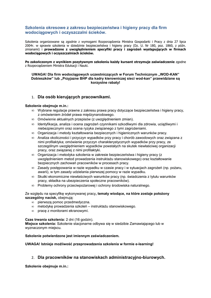 Szkolenia okresowe z zakresu bezpieczeństwa i higieny pracy dla firm wodociągowych i oczyszczalni ścieków. Szkolenia organizowane są zgodnie z wymogami Rozporządzenia Ministra Gospodarki i Pracy z dnia 27 lipca 2004r. w sprawie szkolenia w dziedzinie bezpieczeństwa i higieny pracy (Dz. U. Nr 180, poz. 1860, z późn. zmianami) i prowadzone z uwzględnieniem specyfiki pracy i zagrożeń występujących w firmach wodociągowych i oczyszczalniach ścieków. Po zakończonym z wynikiem pozytywnym szkoleniu każdy kursant otrzymuje zaświadczenie zgodne z Rozporządzeniem Ministra Edukacji i Nauki. UWAGA! Dla firm wodociągowych uczestniczących w Forum Technicznym „WOD-KAN” Dobieszków” lub „Przyjazne BHP dla kadry kierowniczej sieci wod-kan” przewidziane są korzystne rabaty! 1. Dla osób kierujących pracownikami. Szkolenie obejmuje m.in.: • Wybrane regulacje prawne z zakresu prawa pracy dotyczące bezpieczeństwa i higieny pracy, z omówieniem źródeł prawa międzynarodowego. • Omówienie aktualnych przepisów (z uwzględnieniem zmian). • Identyfikacja, analiza i ocena zagrożeń czynnikami szkodliwymi dla zdrowia, uciążliwymi i niebezpiecznymi oraz ocena ryzyka związanego z tymi zagrożeniami. • Organizacja i metody kształtowania bezpiecznych i higienicznych warunków pracy. • Analiza okoliczności i przyczyn wypadków przy pracy i chorób zawodowych oraz związana z nimi profilaktyka; omówienie przyczyn charakterystycznych wypadków przy pracy, ze szczególnym uwzględnieniem wypadków powstałych na skutek niewłaściwej organizacji pracy, oraz związanej z nimi profilaktyki. • Organizacja i metodyka szkolenia w zakresie bezpieczeństwa i higieny pracy (z uwzględnieniem metod prowadzenia instruktażu stanowiskowego) oraz kształtowanie bezpiecznych zachowań pracowników w procesach pracy. • Zasady postępowania w razie wypadku w czasie pracy i w sytuacjach zagrożeń (np. pożaru, awarii), w tym zasady udzielania pierwszej pomocy w razie wypadku. • Skutki ekonomiczne niewłaściwych warunków pracy (np. świadczenia z tytułu warunków pracy, składka na ubezpieczenia społeczne pracowników). • Problemy ochrony przeciwpożarowej i ochrony środowiska naturalnego. Ze względu na specyfikę wykonywanej pracy, tematy wiodące, na które zostaje położony szczególny nacisk, obejmują: • pierwszą pomoc przedmedyczna. • metodykę prowadzenia szkoleń – instruktażu stanowiskowego. • pracę z monitorami ekranowymi. Czas trwania szkolenia: 2 dni (16 godzin). Miejsce szkolenia: Szkolenie stacjonarne odbywa się w siedzibie Zamawiającego lub w wyznaczonym miejscu. Szkolenie potwierdzone jest imiennym zaświadczeniem. UWAGA! Istnieje możliwość przeprowadzenia szkolenia w formie e-learning! 2. Dla pracowników na stanowiskach administracyjno-biurowych. Szkolenie obejmuje m.in.: • • • • Wybrane regulacje prawne z zakresu prawa pracy dotyczące bezpieczeństwa i higieny pracy. Postęp w zakresie oceny zagrożeń czynnikami występującymi w procesach pracy oraz w zakresie metod ochrony przed zagrożeniami dla zdrowia i życia pracowników. Problemy związane z organizacją stanowisk pracy biurowej, z uwzględnieniem zasad ergonomii, w tym stanowisk wyposażonych w urządzenia biurowe. Postępowanie w razie wypadków i w sytuacjach zagrożeń (np. pożaru, awarii), w tym zasady udzielania pierwszej pomocy w razie wypadku. Ze względu na specyfikę wykonywanej pracy, tematy wiodące, na które zostaje położony szczególny nacisk, obejmują: • pierwszą pomoc przedmedyczna. • pracę z monitorami ekranowymi. Czas trwania szkolenia: 1 dzień (8 godzin). Miejsce szkolenia: Szkolenie stacjonarne odbywa się w siedzibie Zamawiającego lub w wyznaczonym miejscu. Szkolenie potwierdzone jest imiennym zaświadczeniem. UWAGA! Istnieje możliwość przeprowadzenia szkolenia w formie e-learning! 3. Dla osób zatrudnionych na stanowiskach robotniczych. Szkolenie obejmuje m.in.: • Regulacje prawne z zakresu bezpieczeństwa i higieny pracy, z uwzględnieniem przepisów związanych z wykonywaną pracą. • Zagrożenia czynnikami występującymi w procesach pracy oraz zasady i metody likwidacji lub ograniczenia oddziaływania tych czynników na pracowników - z uwzględnieniem zmian w technologii, organizacji pracy i stanowisk pracy, stosowania środków ochrony zbiorowej i indywidualnej, wprowadzenia nowych urządzeń, sprzętu i narzędzi pracy. • Zasady postępowania w razie wypadku w czasie pracy i w sytuacjach zagrożeń (np. pożaru, awarii), w tym zasady udzielania pierwszej pomocy w razie wypadku. • Okoliczności i przyczyny charakterystycznych dla wykonywanej pracy wypadków przy pracy oraz związana z nimi profilaktyka. Ze względu na specyfikę wykonywanej pracy, tematy wiodące, na które zostaje położony szczególny nacisk, obejmują: • dźwiganie. • prace szczególnie niebezpieczne: • wykopy, • studnie, • oczyszczalnie, • prace na wysokości, • maszyny drogowe, • czynniki biologiczne. Czas trwania szkolenia: 1 dzień (8 godzin). Miejsce szkolenia: Szkolenie stacjonarne odbywa się w siedzibie Zamawiającego lub w wyznaczonym miejscu. Szkolenie potwierdzone jest imiennym zaświadczeniem. Szczegółowe informacje oraz zapisy: Koordynator szkoleń: Zbigniew Dobrynin Tel. +48 501 401 620 Email: [email protected]