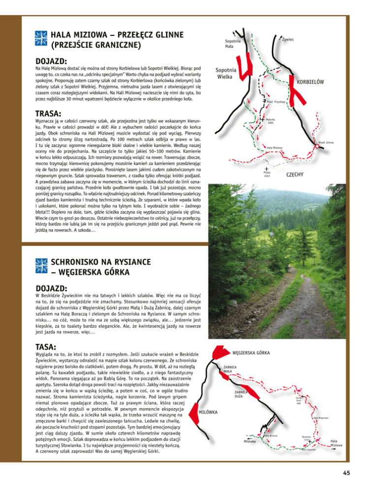 Hala Miziowa – Przełęcz Glinne (przejście graniczne) Żywiec Sopotnia Mała Dojazd: Na Halę Miziową dostać się można od strony Korbielowa lub Sopotni Wielkiej. Biorąc pod uwagę to, co czeka nas na „odcinku specjalnym” Warto chyba na podjazd wybrać warianty spokojne. Proponuję zatem czarny szlak od strony Korbierlowa (końcówka zielonym) lub zielony szlak z Sopotni Wielkiej. Przyjemna, nietrudna jazda lasem z otwierającymi się czasem coraz rozleglejszymi widokami. Na Hali Miziowej nacieszcie się nimi do syta, bo przez najbliższe 30 minut wpatrzeni będziecie wyłącznie w okolice przedniego koła. Sopotnia Wielka KORBIELÓW Przeł. Przysłopy Trasa: Malorka 1005 Wyznacza ją w całości czerwony szlak, ale przejezdna jest tylko we wskazanym kierunku. Prawie w całości prowadzi w dół! Ale z wybuchem radości poczekajcie do końca jazdy. Obok schroniska na Hali Miziowej musicie wydostać się pod wyciąg. Pierwszy odcinek to stromy ślizg nartostradą. Po 100 metrach szlak odbija w prawo w las. I tu się zaczyna: ogromne nieregularne bloki skalne i wielkie kamienie. Według naszej oceny nie do przejechania. Na szczęście to tylko jakieś 50–100 metrów. Kamienie w końcu lekko odpuszczają. Ich rozmiary pozwalają wsiąść na rower. Trawersując zbocze, mocno trzymając kierownicę pokonujemy mozolnie kamień za kamieniem przedzierając się de facto przez wielkie piarżysko. Porośnięte lasem jakimś cudem zakotwiczonym na niepewnym gruncie. Szlak sprowadza trawersem, z rzadka tylko oferując krótki podjazd. A prawdziwa zabawa zaczyna się w momencie, w którym ścieżka dochodzi do linii oznaczającej granicę państwa. Przednie koło gwałtownie opada. I tak już pozostaje, mocno poniżej granicy rozsądku. To właśnie najtrudniejszy odcinek. Ponad kilometrowy szaleńczy zjazd bardzo kamienista i trudną technicznie ścieżką. Ze szparami, w które wpada koło i uskokami, które pokonać można tylko na tylnym kole. I wyobraźcie sobie – żadnego błota!!! Dopiero na dole, tam, gdzie ścieżka zaczyna się wypłaszczać pojawia się glina. Wiecie czym to grozi po deszczu. Ostatnie niebezpieczeństwo to celnicy, już na przełęczy, którzy bardzo nie lubią jak im się na przejściu granicznym jeździ pod prąd. Pewnie nie jeżdżą na rowerach. A szkoda… Przeł. Glinne Hala Miziowa Pilsko 1557 CZECHY Schronisko na Rysiance – Węgierska Górka Dojazd: W Beskidzie Żywieckim nie ma łatwych i lekkich szlaków. Więc nie ma co liczyć na to, że się na podjeździe nie zmachamy. Stosunkowo najmniej sensacji oferuje dojazd do schroniska z Węgierskiej Górki przez Małą i Dużą Żabnicę, dalej czarnym szlakiem na Halę Boraczą i zielonym do Schroniska na Rysiance. W samym schronisku… no cóż, może to nie ma ze sobą większego związku, ale… jedzenie jest kiepskie, za to toalety bardzo eleganckie. Ale, że kwintesencją jazdy na rowerze jest jazda na rowerze, więc… Tasa: Wygląda na to, że ktoś to zrobił z rozmysłem. Jeśli szukacie wrażeń w Beskidzie Żywieckim, wystarczy odnaleźć na mapie szlak koloru czerwonego. Ze schroniska najpierw przez boisko do siatkówki, potem drogą. Po prostu. W dół, aż na rozległą polanę. Tu kawałek podjazdu, takie niewielkie siodło, a z niego fantastyczny widok. Panorama sięgająca aż po Babią Górę. To na początek. Na zaostrzenie apetytu. Szeroka dotąd droga powoli traci na rozpiętości. Jakby niezauważalnie zmienia się w końcu w wąską ścieżkę, a potem w coś, co w ogóle trudno nazwać. Stroma kamienista ścieżynka, nagie korzenie. Pod lewym gripem niemal pionowo opadające zbocze. Tuż za prawym ściana, która raczej odepchnie, niż przytuli w potrzebie. W pewnym momencie ekspozycja MILÓWKA staje się na tyle duża, a ścieżka tak wąska, że trzeba wrzucić maszynę na zmęczone barki i chwycić się zawieszonego łańcucha. Ledwie na chwilę, ale poczucie kruchości pod stopami pozostaje. Tym bardziej emocjonujący jest ciąg dalszy zjazdu. W sumie około czterech kilometrów naprawdę potężnych emocji. Szlak doprowadza w końcu lekkim podjazdem do stacji turystycznej Słowianka. I tu największe przyjemności się niestety kończą. A czerwony szlak zaprowadzi Was do samej Węgierskiej Górki. WĘGIERSKA GÓRKA ŻABNICA MAŁA ŻABNICA DUŻA Suchy Groń 868 Hala Wieprzska Hala Boracza Milówka Rysianka 1332 Hala Miziowa Hala Lipowska 45