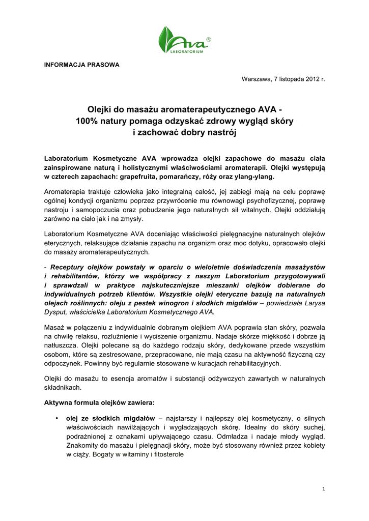INFORMACJA PRASOWA Warszawa, 7 listopada 2012 r. Olejki do masażu aromaterapeutycznego AVA 100% natury pomaga odzyskać zdrowy wygląd skóry i zachować dobry nastrój Laboratorium Kosmetyczne AVA wprowadza olejki zapachowe do masażu ciała zainspirowane naturą i holistycznymi właściwościami aromaterapii. Olejki występują w czterech zapachach: grapefruita, pomarańczy, róży oraz ylang-ylang. Aromaterapia traktuje człowieka jako integralną całość, jej zabiegi mają na celu poprawę ogólnej kondycji organizmu poprzez przywrócenie mu równowagi psychofizycznej, poprawę nastroju i samopoczucia oraz pobudzenie jego naturalnych sił witalnych. Olejki oddziałują zarówno na ciało jak i na zmysły. Laboratorium Kosmetyczne AVA doceniając właściwości pielęgnacyjne naturalnych olejków eterycznych, relaksujące działanie zapachu na organizm oraz moc dotyku, opracowało olejki do masaży aromaterapeutycznych. - Receptury olejków powstały w oparciu o wieloletnie doświadczenia masażystów i rehabilitantów, którzy we współpracy z naszym Laboratorium przygotowywali i sprawdzali w praktyce najskuteczniejsze mieszanki olejków dobierane do indywidualnych potrzeb klientów. Wszystkie olejki eteryczne bazują na naturalnych olejach roślinnych: oleju z pestek winogron i słodkich migdałów – powiedziała Larysa Dysput, właścicielka Laboratorium Kosmetycznego AVA. Masaż w połączeniu z indywidualnie dobranym olejkiem AVA poprawia stan skóry, pozwala na chwilę relaksu, rozluźnienie i wyciszenie organizmu. Nadaje skórze miękkość i dobrze ją natłuszcza. Olejki polecane są do każdego rodzaju skóry, dedykowane przede wszystkim osobom, które są zestresowane, przepracowane, nie mają czasu na aktywność fizyczną czy odpoczynek. Powinny być regularnie stosowane w kuracjach rehabilitacyjnych. Olejki do masażu to esencja aromatów i substancji odżywczych zawartych w naturalnych składnikach. Aktywna formuła olejków zawiera: • olej ze słodkich migdałów – najstarszy i najlepszy olej kosmetyczny, o silnych właściwościach nawilżających i wygładzających skórę. Idealny do skóry suchej, podrażnionej z oznakami upływającego czasu. Odmładza i nadaje młody wygląd. Znakomity do masażu i pielęgnacji skóry, może być stosowany również przez kobiety w ciąży. Bogaty w witaminy i fitosterole 1 • • • • • • • • • • olej z pestek winogron – natłuszcza i wygładza skórę, chroni przed wolnymi rodnikami i zanieczyszczeniami środowiska. Bogaty w witaminy E i F, niezbędne nienasycone kwasy tłuszczowe NNKT oraz fitosterole olej z nasion słonecznika – zawiera nienasycone kwasy tłuszczowe (m.in. kwas oleinowy i linolowy), białko, fitosterole, błonnik, witaminy A, B, E, PP i z grupy B oraz potas, cynk, żelazo, fosfor i wapń. Odbudowuje ochronną warstwę lipidową skóry, regeneruje, wygładza i uelastycznienia naturalny eteryczny olejek pomarańczowy - relaksuje, odmładza, uspokaja naturalny olejek eteryczny grapefruit - odświeża, odmładza, działa stymulująco na mikrokrążenie naturalny eteryczny olejek różany – oczyszcza, uspokaja i odmładza skórę naturalny eteryczny olejek ylang-ylang – afrodyzjak, o działaniu przeciwstresowym i pobudzającym naturalny eteryczny olejek rozmarynowy – antyoksydant, działa pobudzająco i antyseptycznie fitosterole – wzmacniają naturalną powłokę lipidową, zapobiegają utracie wody i nawilżają. Wykazują silne działanie przeciwzapalne, regenerująco-kojące i immunostymulujące witaminę E – neutralizuje wolne rodniki, odpowiada za sprężystość i elastyczność skóry, zapobiega jej przedwczesnemu starzeniu. Poprawia ukrwienie skóry i jej koloryt witaminę F – zmniejsza napięcie warstwy rogowej skóry, zmiękcza ją i nawilża. Sposób użycia wszystkich czterech olejków powinien przebiegać następująco: wlej kilka kropel olejku w zagłębienie dłoni i masując rozsmaruj na ciele okrężnymi ruchami. Najlepszy efekt uzyskamy lekko podgrzewając olej w dłoniach przed wykonaniem masażu. Masowanie całego ciała zaczynamy od dolnych partii idąc ku górze długimi, pewnymi pociągnięciami. Kolejnym etapem jest masaż skóry okrężnymi ruchami, który spowoduje wchłonięcie olejku. Maksymalny efekt masażu uzyskuje się wykonując go po ciepłej kąpieli. Energetyzujący olejek do masażu GRAPEFRUIT - rewitalizuje, dodaje energii poj. 500 ml, cena sugerowana 45,00 zł Zawiera naturalny eteryczny olejek grapefruitowy otrzymywany ze skórek owoców, uprawianych nad Morzem Śródziemnym o właściwościach uspokajających, tonizujących i odmładzających skórę. Bazą olejku do masażu jest naturalny olej z pestek winogron, bogaty w fitosterole oraz witaminy E i F. Dodatek oleju ze słodkich migdałów zapewnia miłe odczucie miękkiej i sprężystej skóry. Dobrze rozprowadza się na skórze, stopniowo się wchłaniając, nadaje podczas masażu właściwy poślizg. Poprawia elastyczność skóry pozostawiając na niej naturalny, cytrusowy zapach. Polecany do wykonania profesjonalnego masażu aromaterapeutycznego techniką głaskania i rozcierania, masażu reflektorycznego stóp oraz tajskiego masażu nóg. Relaksujący olejek do masażu POMARAŃCZA – relaksuje i uspokaja poj. 500 ml, cena sugerowana 45,00 zł 2 Zawiera naturalny eteryczny olejek pomarańczowy otrzymywany przez wyciskanie ze skórek owoców drzewa pomarańczy słodkiej uprawianych na południu Włoch i Sycylii. Ma działanie łagodnie uspokajające, rozgrzewające i odmładzające. Bazuje na naturalnym oleju ze słodkich migdałów bogatym w witaminę E zwaną witaminą młodości, niezbędne nienasycone kwasy tłuszczowe odpowiedzialne za przepuszczalność skóry. Dodatek oleju z pestek winogron zapewnia miłe odczucie miękkiej i sprężystej skóry. Dobrze rozprowadza się na skórze, delikatnie natłuszcza, wchłaniając się stopniowo nadaje podczas masażu właściwy