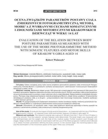 NR 60 ANT ROP OM OT OR YK A 2012 OCENA ZWIĄZKÓW PARAMETRÓW POSTAWY CIAŁA ZMIERZONYCH FOTOGRAMETRYCZNĄ METODĄ MOIRE’A Z WYBRANYMI CECHAMI SOMATYCZNYMI I ZDOLNOŚCIAMI MOTORYCZNYMI KRAKOWSKICH DZIEWCZĄT W WIEKU 14 LAT EVALUATION OF THE RELATION BETWEEN BODY POSTURE PARAMETERS AS MEASURED WITH THE USE OF THE MOIRE PHOTOGRAMMETRIC METHOD WITH SOMATIC FEATURES AND MOTOR SKILLS OF KRAKOW’S GIRLS AGED 14 Robert Walaszek* * dr, Zakład Odnowy Biologicznej AWF Kraków Słowa kluczowe: metoda Moire’a, zdolności motoryczne, wysokość ciała, masa ciała Key words: Moire photogrammetric method, motor skills, body height, body weight STRESZCZENIE • SUMMARY - - - - - Cel pracy. Celem niniejszej pracy była ocena związków parametrów postawy ciała zmierzonych fotogrametryczną metodą Moire’a z wybranymi cechami somatycznymi i zdolnościami motorycznymi krakowskich dziewcząt w wieku 14 lat. Materiał i metoda. Badaniami objęto grupę 140 dziewcząt uczęszczających do pierwszych klas pięciu krakowskich gimnazjów. Najpierw dokonano pomiaru cech somatycznych. Pomiar wysokości ciała przyprowadzono za pomocą antropometru a pomiaru masy ciała przy użyciu wagi lekarskiej. Dalsze badania przebiegały dwuetapowo. Pierwszy etap obejmował badanie metodą projekcyjną Moire’a, dzięki której uzyskano 14 parametrów określających postawę ciała, a w drugim – przeprowadzono test równowagi marszowej i badanie szybkości ruchów kończyn górnych. Wyniki. Po przeprowadzonych badaniach stwierdzono istotne korelacje między wieloma parametrami badanymi metodą Moire’a i wybranymi zdolnościami motorycznymi badanych dziewcząt. Wnioski. Zauważono, że wysokość ciała i masa ciała badanych dziewcząt wpływają w istotny sposób na niektóre z parametrów postawy ciała zmierzonych metodą fotogrametryczną. Aim of the study. To evaluate the impact of body posture parameters – as measured with the use of the Moire photogrammetric method – on selected motor skills and somatic features of Krakow’s girls aged 14. Material and methods. The research material was a group of 140 girls from the 1st form of five of Kraków’s grammar schools. First the subjects’ somatic features were determined. The body height was measured with the anthropometer and the weight with the help of the medical scales. Further research went through two stages. Stage number one included an examination with the use of the Moire projection method which allowed us to obtain fourteen parameters defining the body posture. In the second stage, the marching balance test, and the examination of the movement speed of the upper limbs was conducted. – 49 – Robert Walaszek Results. Following all the examinations, significant correlations were ascertained between many of the parameters measured with the use of the Moire method and the selected motor skills of the subjects. Conclusions. It was also observed that the body height and body weight of the examined girls significantly influenced some of the body posture parameters as measured with the photogrammetric method. - - - - - Wstęp Wady postawy ciała, zwłaszcza wśród dzieci i młodzieży to zjawisko od lat budzące niepokój badaczy [1, 2], które dotyczy 3–15% różnych populacji [3]. Od wielu lat różnie rozwija się penetracja badawcza ukierunkowana na odkrywanie czynników negatywnie oddziałujących na rozwój młodego człowieka. Wady postawy ciała nie tylko bowiem zaburzają harmonijny rozwój dziecka, ale także mogą wpływać negatywnie na wiele cech determinujących zdolności osobnicze młodych ludzi. Wielu polskich naukowców zajmowało się do tej pory oceną wad postawy i ich leczeniem [4, 5, 6, 7, 8, 9]. Zaproponowali oni wiele sposobów oceny wad postawy ciała, w tym m.in. metodę fotogrametryczną Moire’a. W ślad za wcześniej wymienionymi autorami podążali inni badacze, którzy do oceny postawy ciała używali wyżej wymienionej metody [10, 11, 12, 13]. Drzał-Grabiec przeprowadziła w 2009 roku ciekawe badania, których celem było porównanie dwóch metod oceny postawy ciała, tj. badania lekarskiego i badania fotogrametrycznego z wykorzystaniem zjawiska mory projekcyjnej [12]. Po uzyskaniu wyników z obu etapów badań autorka obliczyła liczbowy i procentowy rozkład wad postawy w badanej populacji oraz obliczyła ich procentowa zgodność. Zbieżność diagnozy lekarskiej i wyników badania fotogrametrycznego występowała prawie u 30% badanych. Metoda Moire’a okazała się nieinwazyjna i może być podstawą do zaplanowania programu rehabilitacji, a powtarzanie badania raz w roku może umożliwić ocenę progresji lub regresji rozpoznanej wcześniej wady. W metodzie tej analizie poddawanych jest aż kilkadziesiąt parametrów oceniających stan kręgosłupa, miednicy i kończyn dolnych we wszystkich płaszczyznach, dzięki czemu można uzyskać dokładny przestrzenny wgląd w badaną sylwetkę dziecka. W 2004 roku Mrozkowiak opublikował pracę, której celem była krytyczna ocena wykorzystania metody projekcyjnej Moire’a do oceny postawy ciała dzieci oraz zwrócenie uwagi na najbardziej istotne momenty w technice i metodyce tego badania [10]. Po przebadaniu 200 losowo wybranych osobników w różnych kategoriach wiekowych okazało się, że badanie jest dokładne i szybkie, a uzyskane wyniki są wiarygodne tylko przy zachowaniu bezwzględnej standaryzacji badania. Do ekspertów w dziedzinie antropomotoryki, którzy badali zagadnienia zdolności motorycznych dzieci i młodzieży, można przede wszystkim zaliczyć Szopę [15], Mleczkę [16], Raczka [17], Żaka [18] i Ljacha [19]. Szczególnie przydatne w kontekście niniejszej pracy wydają się prace naukowe Żaka [20, 22], który badał zależności między wybranymi zdolnościami motorycznymi a cechami somatycznymi. Niestety niewielu autorów badało związki między postawą ciała a zdolnościami motorycznymi. Jedynie kilku badaczy zajmowało się tą pro