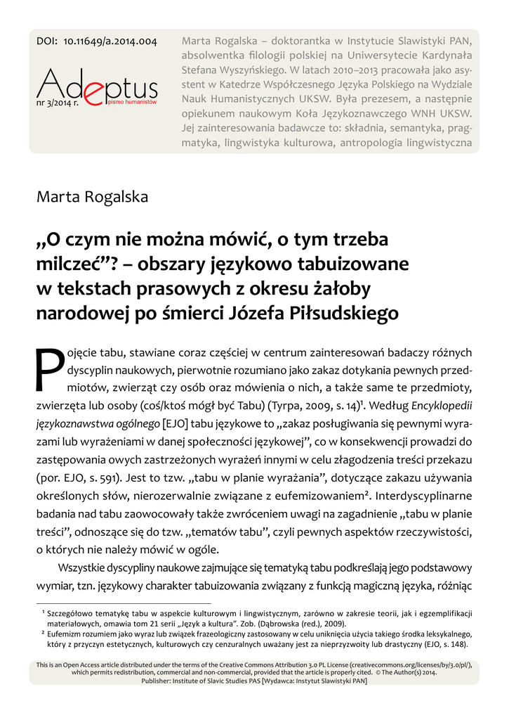 DOI: 10.11649/a.2014.004 nr 3/2014 r. Marta Rogalska – doktorantka w Instytucie Slawistyki PAN, absolwentka filologii polskiej na Uniwersytecie Kardynała Stefana Wyszyńskiego. W latach 2010–2013 pracowała jako asystent w Katedrze Współczesnego Języka Polskiego na Wydziale Nauk Humanistycznych UKSW. Była prezesem, a następnie opiekunem naukowym Koła Językoznawczego WNH UKSW. Jej zainteresowania badawcze to: składnia, semantyka, pragmatyka, lingwistyka kulturowa, antropologia lingwistyczna Marta Rogalska „O czym nie można mówić, o tym trzeba milczeć”? – obszary językowo tabuizowane w tekstach prasowych z okresu żałoby narodowej po śmierci Józefa Piłsudskiego P ojęcie tabu, stawiane coraz częściej w centrum zainteresowań badaczy różnych dyscyplin naukowych, pierwotnie rozumiano jako zakaz dotykania pewnych przedmiotów, zwierząt czy osób oraz mówienia o nich, a także same te przedmioty, zwierzęta lub osoby (coś/ktoś mógł być Tabu) (Tyrpa, 2009, s. 14)1. Według Encyklopedii językoznawstwa ogólnego [EJO] tabu językowe to „zakaz posługiwania się pewnymi wyrazami lub wyrażeniami w danej społeczności językowej”, co w konsekwencji prowadzi do zastępowania owych zastrzeżonych wyrażeń innymi w celu złagodzenia treści przekazu (por. EJO, s. 591). Jest to tzw. „tabu w planie wyrażania”, dotyczące zakazu używania określonych słów, nierozerwalnie związane z eufemizowaniem2. Interdyscyplinarne badania nad tabu zaowocowały także zwróceniem uwagi na zagadnienie „tabu w planie treści”, odnoszące się do tzw. „tematów tabu”, czyli pewnych aspektów rzeczywistości, o których nie należy mówić w ogóle. Wszystkie dyscypliny naukowe zajmujące się tematyką tabu podkreślają jego podstawowy wymiar, tzn. językowy charakter tabuizowania związany z funkcją magiczną języka, różniąc 1Szczegółowo tematykę tabu w aspekcie kulturowym i lingwistycznym, zarówno w zakresie teorii, jak i egzemplifikacji materiałowych, omawia tom 21 serii „Język a kultura”. Zob. (Dąbrowska (red.), 2009). 2Eufemizm rozumiem jako wyraz lub związek frazeologiczny zastosowany w celu uniknięcia użycia takiego środka leksykalnego, który z przyczyn estetycznych, kulturowych czy cenzuralnych uważany jest za nieprzyzwoity lub drastyczny (EJO, s. 148). This is an Open Access article distributed under the terms of the Creative Commons Attribution 3.0 PL License (creativecommons.org/licenses/by/3.0/pl/), which permits redistribution, commercial and non-commercial, provided that the article is properly cited. © The Author(s) 2014. Publisher: Institute of Slavic Studies PAS [Wydawca: Instytut Slawistyki PAN] Marta Rogalska „O czym nie można mówić, o tym trzeba milczeć”? … się głównie w zakresie motywacji (przyczyn) powstawania tabu. Upatrywano ich kolejno w motywacjach silnie religijnych (tzw. tabu pierwotne), psychologicznych (tabu jako prastary zakaz narzucony z zewnątrz, np. przez jakiś autorytet, i skierowany przeciw najsilniejszym żądzom człowieka (zob. Freud, 1993, s. 53), towarzyskich, moralnych, społecznych, etycznych i etykietalnych (tabu nowożytne), by w XX w. zaowocować np. zjawiskiem poprawności politycznej (PC – political correctness) (zob. Szymoniak, 2009, s. 106). W kontekście żałoby narodowej po śmierci Józefa Piłsudskiego – otaczanego już za życia swoistym kultem, w którego podtrzymywaniu nierzadko wykorzystywano mechanizmy tabuizacji – warte przytoczenia wydają się również rozważania Mircei Eliadego: „Na ogół jest lub staje się tabu każdy przedmiot, czynność lub osoba, która ma w sobie jakąś siłę o mniej lub więcej określonej naturze na skutek własnego sposobu bycia [podkreślenie moje – M.R.] albo nabywa ją w wyniku jakiegoś przełamania płaszczyzny ontologicznej” (Eliade, 1966, s. 21). Wprowadzenie samego słowa tabu do języków europejskich (nie ma ono adekwatnego odpowiednika w żadnym z nich) zaowocowało kolejnymi zmianami znaczeniowymi i przeniesieniem najbardziej wyrazistego komponentu znaczeniowego, czyli „nietykalności”, na znaczenie przenośne – „zakazane”, tzn. „nietykalne słowem”, a także oderwaniem od pierwotnego kontekstu religijno-magicznego. Etyczno-lingwistyczny nakaz (a właściwie zakaz) Wittgensteinowski zawarty w tytule tekstu zwraca także uwagę na kwestię niezmiernie istotną w kontekście tabu, mianowicie na przemilczenie. Okazuje się bowiem, że – przynajmniej w przypadku interesującego mnie zagadnienia żałoby narodowej – milczenie absolutne wcale nie jest pożądane. Do tego wątku powrócę w dalszej kolejności. Na potrzeby moich analiz przyjmuję możliwie szeroką definicję tabu zaproponowaną przez Annę Dąbrowską: „tabu jest zjawiskiem kulturowym obejmującym wszystko to, co jest objęte zakazem społecznym (czasem również prawnym); są to zachowania, których nie należy praktykować, i tematy, jakich nie należy poruszać w danej społeczności (nie wypada o nich mówić), ponieważ są uznawane za wstydliwe, niebezpieczne, kontrowersyjne, przykre lub niemoralne.” (Dąbrowska, 2008, s. 175). W niniejszym artykule chciałabym zająć się jednym z podstawowych obszarów, który od zawsze podlegał tabuizacji, czyli tabu związanym z mówieniem o śmierci. Moim zamiarem nie jest jednak rozważanie śmierci w wymiarze ogólnoludzkim, a jedynie w kontekście żałoby narodowej. Odmienny jest wtedy przede wszystkim charakter uroczystości żałobnej – zmienia się z prywatnej na oficjalną o państwowym i międzynarodowym zasięgu, co w konsekwencji sprawia, że obszary tabuizacji podlegają wzmocnionym (bo również instytucjonalno-prawnym) restrykcjom, a każde słowo drukowane na szpaltach gazet poddawane jest ustawicznej społecznej „cenzurze”. Moje rozważania chciałabym oprzeć 52 Marta Rogalska „O czym nie można mówić, o tym trzeba milczeć”? … na przykładzie 