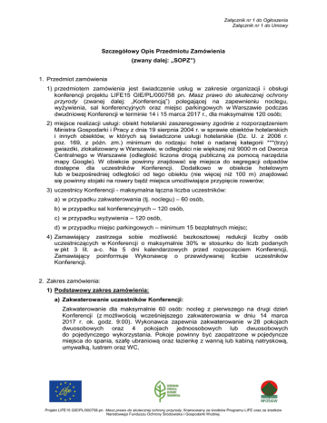 Załącznik nr 1 do Ogłoszenia Załącznik nr 1 do Umowy Szczegółowy Opis Przedmiotu Zamówienia (zwany dalej: „SOPZ”) 1. Przedmiot zamówienia 1) przedmiotem zamówienia jest świadczenie usług w zakresie organizacji i obsługi konferencji projektu LIFE15 GIE/PL/000758 pn. Masz prawo do skutecznej ochrony przyrody (zwanej dalej: „Konferencją”) polegającej na zapewnieniu noclegu, wyżywienia, sal konferencyjnych oraz miejsc parkingowych w Warszawie podczas dwudniowej Konferencji w terminie 14 i 15 marca 2017 r., dla maksymalnie 120 osób; 2) miejsce realizacji usługi: obiekt hotelarski zaszeregowany zgodnie z rozporządzeniem Ministra Gospodarki i Pracy z dnia 19 sierpnia 2004 r. w sprawie obiektów hotelarskich i innych obiektów, w których są świadczone usługi hotelarskie (Dz. U. z 2006 r. poz. 169, z późn. zm.) minimum do rodzaju: hotel o nadanej kategorii ***(trzy) gwiazdki, zlokalizowany w Warszawie, w odległości nie większej niż 9000 m od Dworca Centralnego w Warszawie (odległość liczona drogą publiczną za pomocą narzędzia mapy Google). W obiekcie powinny znajdować się miejsca do segregacji odpadów dostępne dla uczestników Konferencji. Dodatkowo w obiekcie hotelowym lub w bezpośredniej odległości od tego obiektu (nie więcej niż 100 m) znajdować się powinny stojaki na rowery bądź miejsca umożliwiające przypięcie rowerów; 3) uczestnicy Konferencji - maksymalna łączna liczba uczestników: a) w przypadku zakwaterowania (tj. noclegu) – 60 osób, b) w przypadku sal konferencyjnych – 120 osób, c) w przypadku wyżywienia – 120 osób, d) w przypadku miejsc parkingowych – minimum 15 bezpłatnych miejsc; 4) Zamawiający zastrzega sobie możliwość bezkosztowej redukcji liczby osób uczestniczących w Konferencji o maksymalnie 30% w stosunku do liczb podanych w pkt 3 lit. a-c. Na 5 dni kalendarzowych przed rozpoczęciem Konferencji, Zamawiający poinformuje Wykonawcę o przewidywanej liczbie uczestników Konferencji. 2. Zakres zamówienia: 1) Podstawowy zakres zamówienia: a) Zakwaterowanie uczestników Konferencji: Zakwaterowanie dla maksymalnie 60 osób: nocleg z pierwszego na drugi dzień Konferencji (z możliwością wcześniejszego zakwaterowania w dniu 14 marca 2017 r. ok. godz. 9:00). Wykonawca zapewnia zakwaterowanie w 28 pokojach dwuosobowych oraz 4 pokojach jednoosobowych lub dwuosobowych do pojedynczego wykorzystania. Pokoje powinny być zaopatrzone w pojedyncze miejsca do spania, szafę ubraniową oraz łazienkę z wanną lub kabiną natryskową, umywalką, lustrem oraz WC, Projekt LIFE15 GIE/PL/000758 pn. Masz prawo do skutecznej ochrony przyrody, finansowany ze środków Programu LIFE oraz ze środków Narodowego Funduszu Ochrony Środowiska i Gospodarki Wodnej. Załącznik nr 1 do Ogłoszenia Załącznik nr 1 do Umowy b) Sale konferencyjne: Wykonawca zapewni 3 sale konferencyjne w budynku hotelu, w którym zakwaterowani będą uczestnicy Konferencji (lub w innym budynku przynależnym do hotelu w odległości nie większej niż 500 metrów od hotelu, w którym zakwaterowani będą uczestnicy Konferencji) – 1 sala konferencyjna dla 120 osób oraz 2 sale konferencyjne dla 40 osób, umożliwiające pracę w trzech niezależnych grupach w tym samym czasie. Sale będą dostępne przez dwa dni Konferencji w godz. 09:00 - 18.00. Sale konferencyjne powinny być dostosowane do przeprowadzenia Konferencji w formie: wykładu, tj. ustawienie miejsc w kształcie podkowy (stoły i krzesła) oraz stołu prezydialnego na minimum 3 miejsca przy stole – dopuszczalne w dwóch mniejszych salach konferencyjnych, tj. w dwóch salach dla 40 osób; wykładu, tj. ustawienia teatralnego oraz stołu prezydialnego na minimum 3 miejsca przy stole – dopuszczalne wyłącznie w największej sali konferencyjnej, tj. sali dla 120 osób. Każde ustawienie w każdej z sal konferencyjnych musi umożliwić widoczność ekranu do projekcji z każdego miejsca. Każda sala konferencyjna będzie wyposażona w: odpowiednie nagłośnienie (w tym 2 bezprzewodowe mikrofony), komputer, projektor multimedialny, dostęp do Internetu (przepustowość łącza powinna umożliwić realizację tzw. transmisji na żywo), ekran lub białą ścianę do projekcji, flipchart z blokiem papierowym i pisakami. Wszystkie sale konferencyjne powinny posiadać dobre oświetlenie, zaciemnienie oraz klimatyzację. W trakcie Konferencji Wykonawca zapewni wsparcie techniczne, obejmujące w szczególności: przygotowanie techniczne sal konferencyjnych (w tym aranżację i zmianę aranżacji sali zgodnie z zapotrzebowaniem Zamawiającego) wraz z odpowiednim wyposażeniem oraz zapleczem umożliwiającym przeprowadzenie Konferencji, obsługę techniczną sprzętu, w tym sprawdzenie poprawności jego działania przed rozpoczęciem Konferencji, usuwanie usterek pojawiających się w trakcie trwania Konferencji, c) Wyżywienie dla uczestników Konferencji: śniadanie - (w liczbie 1, w drugim dniu Konferencji dla maksymalnie 60 osób, serwowane w miejscu zakwaterowania uczestników) – szwedzki stół: jasne i ciemne pieczywo, masło, wędliny, deska serów, twarożek, jogurty, mleko, płatki zbożowe, dżem, owoce, warzywa, ciepły posiłek (tj. jajecznica, jajka gotowane, parówki lub kiełbaski na ciepło itp.), kawa z ekspresu, herbata z dodatkami (tj. cukier, słodzik, mleko, cytryna), woda mineralna (gazowana i niegazowana) w szklanych butelkach bądź szklanych dzbankach; obiad – (w liczbie 2, w pierwszym oraz drugim dniu Konferencji dla maksymalnie 120 osób, serwowane w miejscu Konferencji, jeśli będzie ono inne niż miejsce zakwaterowania uczestników Konferencji) - szwedzki stół: minimum 2 zupy do wyboru, minimum 2 dania główne mięsne do wyboru oraz minimum jedno danie główne wegetariańskie, ziemniaki/frytki/makaron/ryż, zestaw surówek, deser, kawa, herbata z dodatkami (tj. cukier, słodzik, mleko, cytryna), soki, woda mineralna (gazowana i niegazowana) w szklanyc