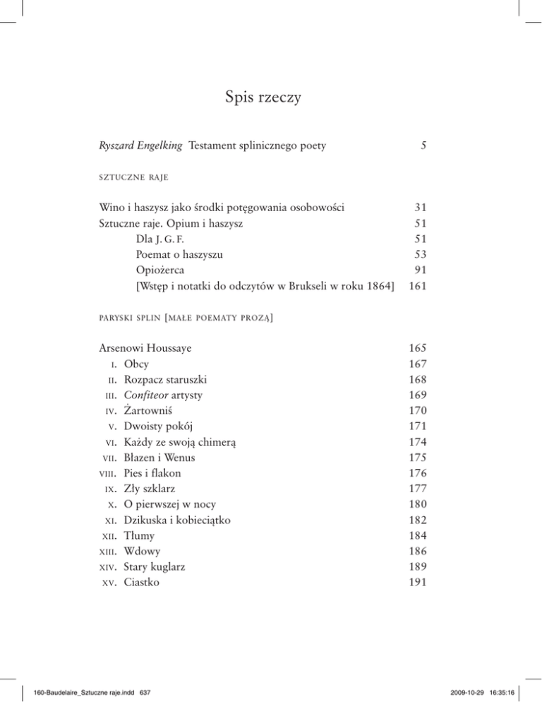 Spis rzeczy Ryszard Engelking Testament splinicznego poety 5 SZTUCZNE RAJE Wino i haszysz jako środki potęgowania osobowości Sztuczne raje. Opium i haszysz Dla J. G. F. Poemat o haszyszu Opiożerca [Wstęp i notatki do odczytów w Brukseli w roku 1864] PARYSKI SPLIN [ MAŁE POEMATY PROZĄ ] Arsenowi Houssaye II . Obcy II . Rozpacz staruszki III . Confiteor artysty IV . Żartowniś V . Dwoisty pokój VI . Każdy ze swoją chimerą VII . Błazen i Wenus VIII . Pies i flakon IX . Zły szklarz X . O pierwszej w nocy XI . Dzikuska i kobieciątko XII . Tłumy XIII . Wdowy XIV . Stary kuglarz XV . Ciastko 160-Baudelaire_Sztuczne raje.indd 637 31 51 51 53 91 161 165 167 168 169 170 171 174 175 176 177 180 182 184 186 189 191 2009-10-29 16:35:16 XVI . XVII . XVIII . XIX . xx. XXI . XXII . XXIII . XXIV . XXV . XXVI . XXVII . XXVIII . XXIX . XXX . XXXI . XXXII . XXXIII . XXXIV . XXXV . XXXVI . XXXVII . XXXVIII . XXXIX . XL . XLI . XLII . XLIII . XLIV . XLV . XLVI . XLVII . 160-Baudelaire_Sztuczne raje.indd 638 Zegar Kula ziemska we włosach Zaproszenie do podróży Zabawka biednego Dary wróżek Kuszenie albo Eros, Plutus i Sława Zmierzch Samotność Plany Piękna Dorota Oczy biednych Bohaterska śmierć Fałszywy pieniądz Wielkoduszny gracz Sznur Powołania Tyrs Upijajcie się Już! Okna Pragnę malować Łaski Księżyca Która jest prawdziwa? Rasowy koń Lustro Port Portrety kochanek Szarmancki strzelec Obłoki i zupa Cmentarz i strzelnica Utrata aureoli Panna Skalpel 193 194 195 198 200 203 207 209 211 213 215 217 221 223 227 231 235 237 238 240 241 242 243 244 245 246 247 252 253 254 255 256 2009-10-29 16:24:35 XLVIII . Anywhere out of the world – Gdziekolwiek poza świat XLIX . Bijmy biednych! L . Dobre psy [Aneks] [Szkic dedykacji] [Spisy zamierzonych poematów] [Plany i notatki] 260 262 265 269 269 270 276 SZKICE I NOWELA Wybór pocieszających maksym o miłości Panna Fanfarlo Cnoty zabawki [Spisy tytułów i projekty powieści i nowel] 283 290 318 325 DZIENNIKI INTYMNE Race [Higiena] Moje serce obnażone [Myśli z albumu] [Aforyzmy] Listy śledziennika [Notatki biobibliograficzne] KOMENTARZ I PRZYPISY Bibliografia Indeks osób i postaci 160-Baudelaire_Sztuczne raje.indd 639 (przełożył Tomasz Swoboda) 341 361 369 404 405 406 408 413 618 622 2009-10-29 16:24:35