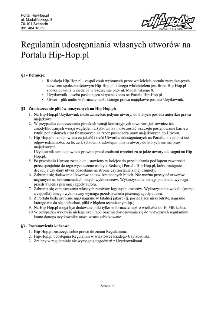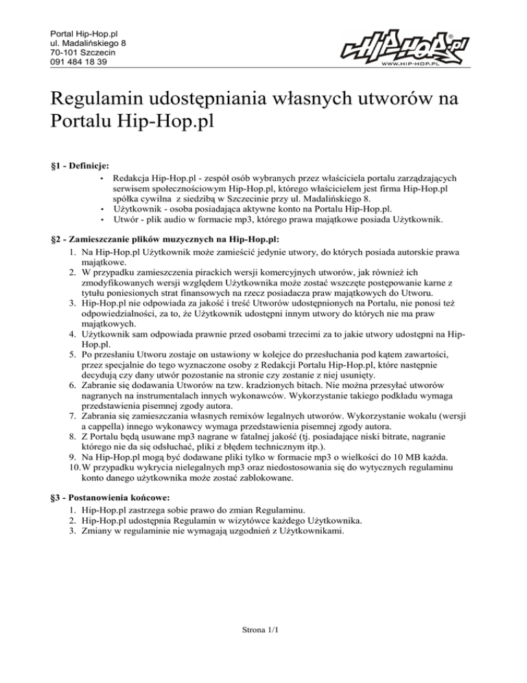 Portal Hip-Hop.pl ul. Madalińskiego 8 70-101 Szczecin 091 484 18 39 Regulamin udostępniania własnych utworów na Portalu Hip-Hop.pl §1 - Definicje: Redakcja Hip-Hop.pl - zespół osób wybranych przez właściciela portalu zarządzających serwisem społecznościowym Hip-Hop.pl, którego właścicielem jest firma Hip-Hop.pl spółka cywilna z siedzibą w Szczecinie przy ul. Madalińskiego 8. • Użytkownik - osoba posiadająca aktywne konto na Portalu Hip-Hop.pl. • Utwór - plik audio w formacie mp3, którego prawa majątkowe posiada Użytkownik. • §2 - Zamieszczanie plików muzycznych na Hip-Hop.pl: 1. Na Hip-Hop.pl Użytkownik może zamieścić jedynie utwory, do których posiada autorskie prawa majątkowe. 2. W przypadku zamieszczenia pirackich wersji komercyjnych utworów, jak również ich zmodyfikowanych wersji względem Użytkownika może zostać wszczęte postępowanie karne z tytułu poniesionych strat finansowych na rzecz posiadacza praw majątkowych do Utworu. 3. Hip-Hop.pl nie odpowiada za jakość i treść Utworów udostępnionych na Portalu, nie ponosi też odpowiedzialności, za to, że Użytkownik udostępni innym utwory do których nie ma praw majątkowych. 4. Użytkownik sam odpowiada prawnie przed osobami trzecimi za to jakie utwory udostępni na HipHop.pl. 5. Po przesłaniu Utworu zostaje on ustawiony w kolejce do przesłuchania pod kątem zawartości, przez specjalnie do tego wyznaczone osoby z Redakcji Portalu Hip-Hop.pl, które następnie decydują czy dany utwór pozostanie na stronie czy zostanie z niej usunięty. 6. Zabranie się dodawania Utworów na tzw. kradzionych bitach. Nie można przesyłać utworów nagranych na instrumentalach innych wykonawców. Wykorzystanie takiego podkładu wymaga przedstawienia pisemnej zgody autora. 7. Zabrania się zamieszczania własnych remixów legalnych utworów. Wykorzystanie wokalu (wersji a cappella) innego wykonawcy wymaga przedstawienia pisemnej zgody autora. 8. Z Portalu będą usuwane mp3 nagrane w fatalnej jakość (tj. posiadające niski bitrate, nagranie którego nie da się odsłuchać, pliki z błędem technicznym itp.). 9. Na Hip-Hop.pl mogą być dodawane pliki tylko w formacie mp3 o wielkości do 10 MB każda. 10.W przypadku wykrycia nielegalnych mp3 oraz niedostosowania się do wytycznych regulaminu konto danego użytkownika może zostać zablokowane. §3 - Postanowienia końcowe: 1. Hip-Hop.pl zastrzega sobie prawo do zmian Regulaminu. 2. Hip-Hop.pl udostępnia Regulamin w wizytówce każdego Użytkownika. 3. Zmiany w regulaminie nie wymagają uzgodnień z Użytkownikami. Strona 1/1