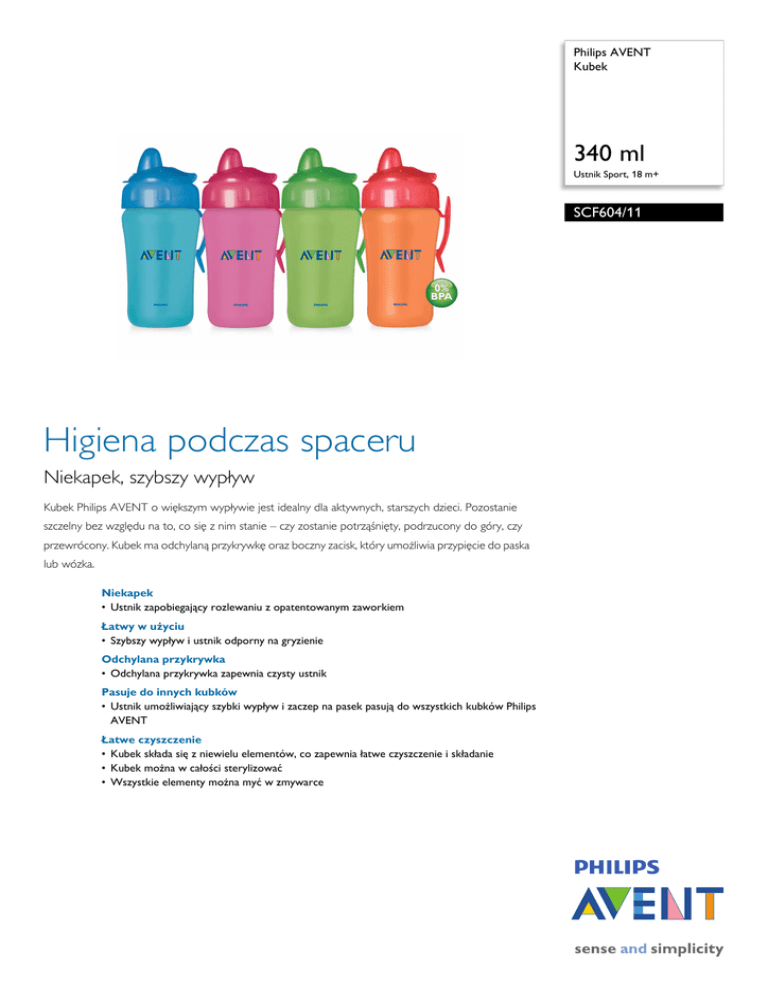 Philips AVENT Kubek 340 ml Ustnik Sport, 18 m+ SCF604/11 Higiena podczas spaceru Niekapek, szybszy wypływ Kubek Philips AVENT o większym wypływie jest idealny dla aktywnych, starszych dzieci. Pozostanie szczelny bez względu na to, co się z nim stanie – czy zostanie potrząśnięty, podrzucony do góry, czy przewrócony. Kubek ma odchylaną przykrywkę oraz boczny zacisk, który umożliwia przypięcie do paska lub wózka. Niekapek • Ustnik zapobiegający rozlewaniu z opatentowanym zaworkiem Łatwy w użyciu • Szybszy wypływ i ustnik odporny na gryzienie Odchylana przykrywka • Odchylana przykrywka zapewnia czysty ustnik Pasuje do innych kubków • Ustnik umożliwiający szybki wypływ i zaczep na pasek pasują do wszystkich kubków Philips AVENT Łatwe czyszczenie • Kubek składa się z niewielu elementów, co zapewnia łatwe czyszczenie i składanie • Kubek można w całości sterylizować • Wszystkie elementy można myć w zmywarce SCF604/11 Kubek 340 ml Ustnik Sport, 18 m+ Dane techniczne Zalety Kraj pochodzenia • Anglia • Ustnik o szybkim wypływie: 1 szt. • Klips do paska/do wózka: 1 szt. Zawartość zestawu Etapy rozwoju • Kubek bez ozdób 340 ml: 1 szt. • Pokrywka: 1 szt. Ustnik zapobiegający rozlewaniu • Etapy: 18 miesięcy + • Opatentowany zaworek kontroluje wypływ, zapobiegając rozlewaniu, nawet w przypadku odwrócenia lub położenia produktu na boku. Szybszy wypływ i większa pojemność Ustnik jest odporny na gryzienie i zapewnia szybszy wypływ, natomiast kubek o dużej pojemności jest przeznaczony dla starszych dzieci Odchylana przykrywka zapewnia czysty ustnik Odchylana przykrywka zawsze zapewnia higienę i czystość ustnika zarówno w domu, jak i na spacerze. Data wydania 2010-07-29 © 2010 Koninklijke Philips Electronics N.V. Wszelkie prawa zastrzeżone. Wersja: 9.2.1 Dane techniczne mogą ulec zmianie bez powiadomienia. Znaki towarowe są własnością Koninklijke Philips Electronics N.V. lub własnością odpowiednich firm. 12 NC: 0000 000 00000 www.philips.com