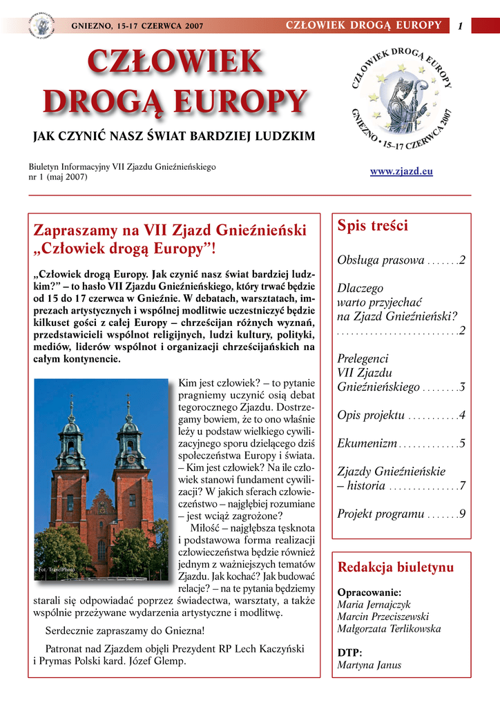 GNIEZNO, 15-17 CZERWCA 2007 CZŁOWIEK DROGĄ EUROPY 1 CZŁOWIEK DROGĄ EUROPY JAK CZYNIĆ NASZ ŚWIAT BARDZIEJ LUDZKIM Biuletyn Informacyjny VII Zjazdu Gnieźnieńskiego nr 1 (maj 2007) Zapraszamy na VII Zjazd Gnieźnieński „Człowiek drogą Europy”! „Człowiek drogą Europy. Jak czynić nasz świat bardziej ludzkim?” – to hasło VII Zjazdu Gnieźnieńskiego, który trwać będzie od 15 do 17 czerwca w Gnieźnie. W debatach, warsztatach, imprezach artystycznych i wspólnej modlitwie uczestniczyć będzie kilkuset gości z całej Europy – chrześcijan różnych wyznań, przedstawicieli wspólnot religijnych, ludzi kultury, polityki, mediów, liderów wspólnot i organizacji chrześcijańskich na całym kontynencie. Kim jest człowiek? – to pytanie pragniemy uczynić osią debat tegorocznego Zjazdu. Dostrzegamy bowiem, że to ono właśnie leży u podstaw wielkiego cywilizacyjnego sporu dzielącego dziś społeczeństwa Europy i świata. – Kim jest człowiek? Na ile człowiek stanowi fundament cywilizacji? W jakich sferach człowieczeństwo – najgłębiej rozumiane – jest wciąż zagrożone? Miłość – najgłębsza tęsknota i podstawowa forma realizacji człowieczeństwa będzie również jednym z ważniejszych tematów Fot. TravelPhoto Zjazdu. Jak kochać? Jak budować relacje? – na te pytania będziemy starali się odpowiadać poprzez świadectwa, warsztaty, a także wspólnie przeżywane wydarzenia artystyczne i modlitwę. Serdecznie zapraszamy do Gniezna! Patronat nad Zjazdem objęli Prezydent RP Lech Kaczyński i Prymas Polski kard. Józef Glemp. www.zjazd.eu Spis treści Obsługa prasowa . . . . . . .2 Dlaczego warto przyjechać na Zjazd Gnieźnieński? . . . . . . . . . . . . . . . . . . . . . . . . . .2 Prelegenci VII Zjazdu Gnieźnieńskiego . . . . . . . .3 Opis projektu . . . . . . . . . . .4 Ekumenizm . . . . . . . . . . . . .5 Zjazdy Gnieźnieńskie – historia . . . . . . . . . . . . . . .7 Projekt programu . . . . . . .9 Redakcja biuletynu Opracowanie: Maria Jernajczyk Marcin Przeciszewski Małgorzata Terlikowska DTP: Martyna Janus 2 CZŁOWIEK DROGĄ EUROPY GNIEZNO, 15-17 CZERWCA 2007 Dlaczego warto przyjechać na Zjazd Gnieźnieński? Tematyka Zjazdu dotyczy każdego człowieka, ukazuje bowiem, że istotą wszystkich działań, i to we wszystkich wymiarach – indywidualnym, społecznym, politycznym, a także ekonomicznym – jest właśnie człowiek, człowiek, który pyta: Kim jestem? Po co jestem? Jakie jest moje zadanie? Co zostanie po mnie, ABP HENRYK gdy mnie już nie będzie? Jaki jest sens MUSZYŃSKI, mojego życia? METROPOLITA GNIEŹNIEŃSKI To są egzystencjalne pytania, które stawia sobie każdy z nas. Mam nadzieję, że tematyka tegorocznego Zjazdu jest wartościowa szczególnie dla młodych, którzy szukają kierunku swojego życia. Podstawową ideą zjazdu w roku 1000 było wzajemne przenikanie się życia chrześcijańskiego i życia publicznego. Dziś te sfery są rozdzielone, ale mają charakter komplementarny. Niezbędne jest ich wzajemne przenikanie. Na tym polega specyficzny charyzmat Zjazdów Gnieźnieńskich, organizowanych teraz jako międzynarodowe kongresy ludzi świeckich. Chodzi przede wszystkim o to, abyśmy mogli spotykać się tam jako chrześcijanie, ale też jako ludzie odpowiedzialni za przyszłość Europy. Jako ludzie pielęgnujący to, co odziedziczyliśmy od naszych ojców, a co dziś powinno być darem dla pozostałej części Europy. To swoisty genius loci Gniezna. Chcemy też ukazać wartość ekumenizmu, abyśmy jako polscy chrześcijanie umieli dzielić i cieszyć się tym, co jest piękne w innych wyznaniach i dostrzec te wartości, jakie inne Kościoły mają nam do zaproponowania. Wreszcie, abyśmy wspólnie potrafili zauważyć, że Chrystus jest ostatnim słowem Ojca, także dla naszej epoki. Tegoroczny VII Zjazd Gnieźnieński będzie próbą odpowiedzi na ważne pytania o człowieka. Kim on jest, jakie jest jego miejsce w Europie i jaka ta Europa powinna być, by stanowić dla człowieka sprzyjające środowisko życia i rozwoju? W tradycji europejskiej istnieją dwa przeciwstawne sobie nurty: chrześcijański, mówiący o tym, iż człowiek został stworzony na obraz i podobieństwo Boga oraz oświeceniowy, uznający człowieka za wartość absolutną i najwyższą. Podczas Zjazdu „Człowiek drogą Europy” chcemy do tych nurtów sięgnąć, podjąć rozważania na temat człowieka w kontekście humanizmu europejskiego, którego częścią składową jest humanizm chrześcijański. Będzie to także wielka debata o przyszłości Starego Kontynentu, a właściwe o roli, jaką w budowaniu tej przyszłości odgrywa współczesny człowiek. Zapytamy, co zrobić, aby Europa była miejscem sprzyjającym integralnemu rozwojowi człowieka? Aby była miejscem wolności, solidarności i poszanowania odmienności. Spotykamy tu bardzo wiele ciekawych ludzi, m.in.: kard. Tarcisio Bertone, sekretarza stanu Stolicy Apostolskiej, Hansa Gerta Poetteringa, przewodniczącego Europarlamentu czy prof. Władysława Bartoszewskiego. Tematyka Zjazdu dotyczy każdego człowieka, ukazuje bowiem, że istotą wszystkich działań, i to we wszystkich wymiarach – indywidualnym, społecznym, politycznym, a także ekonomicznym – jest właśnie człowiek, człowiek, który pyta: Kim jestem? Po co jestem? Jakie jest moje zadanie? Co zostanie po mnie, gdy mnie już nie będzie? Jaki jest sens mojego życia? To są egzystencjalne pytania, które stawia sobie każdy z nas. Mam nadzieję, że tematyka tegorocznego Zjazdu jest wartościowa szczególnie dla młodych, którzy szukają kierunku swojego życia. Abp Henryk Muszyński, metropolita gnieźnieński Informacje dla uczestników Aby się zgłosić na Zjazd, wystarczy otworzyć stronę www.zjazd.eu Tam znajdą Państwo formularz zgłoszenia (zakładka „rejestracja”) oraz wszystkie informacje na temat Zjazdu. Warunki uczestnictwa w VII Zjeździe Gnieźnieńskim 1. Termin