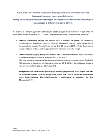 Komunikat nr 112/2016 w sprawie zasad przydzielania numerów recept lekarzom/lekarzom dentystom/felczerom, którzy posiadają umowy upoważniające do wystawiania recept refundowanych wygasające z dniem 31 grudnia 2016 r. W związku z licznymi pytaniami dotyczącymi zasad pozyskiwania numerów recept oraz ich wystawiania po dniu 1 stycznia 2017 r. Śląski Oddział Wojewódzki NFZ w Katowicach, informuje: Lekarze posiadający dostęp do Portalu NFZ – Portalu Personelu (na poprzednio obowiązujących zasadach), powinni dokonać aktualizacji danych osób uprawnionych do wystawiania recept w Portalu Personelu do dnia 30 czerwca 2017 r. Po tej dacie lekarze utracą dostęp do portalu umożliwiający pobieranie zakresów numerów recept. Lekarze nieposiadający dostępu do Portalu NFZ – Portalu Personelu, tracą uprawnienia do pobierania zakresu numerów recept po dniu 31.12.2016 r. Aby móc ponownie uzyskać uprawnienia do pobierania zakresu numerów recept Śląski OW NFZ zaprasza w dogodnym dla lekarza terminie (po 31.12.2016 r.) do osobistego składania wniosków o uzyskanie dostępu do Portalu NFZ. Niewykorzystane druki recept posiadające numery przydzielone przez Śląski OW NFZ na podstawie umowy upoważniającej przed dniem 01.01.2017 r. mogą być wystawiane przez lekarzy/lekarzy dentystów/felczerów 31 grudnia 2017 r. Źródło: Wydział Gospodarki Lekami – 32 735 17 09, 32 735 17 83 i realizowane w aptekach do dnia