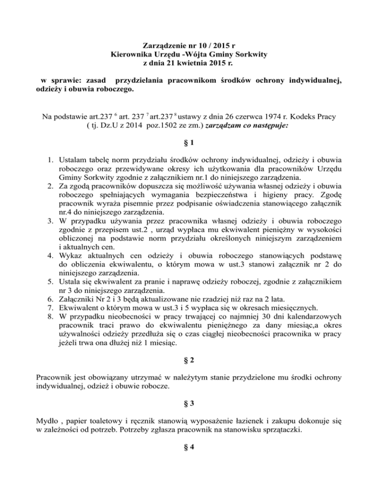 Zarządzenie nr 10 / 2015 r Kierownika Urzędu -Wójta Gminy Sorkwity z dnia 21 kwietnia 2015 r. w sprawie: zasad przydzielania pracownikom środków ochrony indywidualnej, odzieży i obuwia roboczego. Na podstawie art.237 6 art. 237 7 art.237 8 ustawy z dnia 26 czerwca 1974 r. Kodeks Pracy ( tj. Dz.U z 2014 poz.1502 ze zm.) zarządzam co następuje: §1 1. Ustalam tabelę norm przydziału środków ochrony indywidualnej, odzieży i obuwia roboczego oraz przewidywane okresy ich użytkowania dla pracowników Urzędu Gminy Sorkwity zgodnie z załącznikiem nr.1 do niniejszego zarządzenia. 2. Za zgodą pracowników dopuszcza się możliwość używania własnej odzieży i obuwia roboczego spełniających wymagania bezpieczeństwa i higieny pracy. Zgodę pracownik wyraża pisemnie przez podpisanie oświadczenia stanowiącego załącznik nr.4 do niniejszego zarządzenia. 3. W przypadku używania przez pracownika własnej odzieży i obuwia roboczego zgodnie z przepisem ust.2 , urząd wypłaca mu ekwiwalent pieniężny w wysokości obliczonej na podstawie norm przydziału określonych niniejszym zarządzeniem i aktualnych cen. 4. Wykaz aktualnych cen odzieży i obuwia roboczego stanowiących podstawę do obliczenia ekwiwalentu, o którym mowa w ust.3 stanowi załącznik nr 2 do niniejszego zarządzenia. 5. Ustala się ekwiwalent za pranie i naprawę odzieży roboczej, zgodnie z załącznikiem nr 3 do niniejszego zarządzenia. 6. Załączniki Nr 2 i 3 będą aktualizowane nie rzadziej niż raz na 2 lata. 7. Ekwiwalent o którym mowa w ust.3 i 5 wypłaca się w okresach miesięcznych. 8. W przypadku nieobecności w pracy trwającej co najmniej 30 dni kalendarzowych pracownik traci prawo do ekwiwalentu pieniężnego za dany miesiąc,a okres używalności odzieży przedłuża się o czas ciągłej nieobecności pracownika w pracy jeżeli trwa ona dłużej niż 1 miesiąc. §2 Pracownik jest obowiązany utrzymać w należytym stanie przydzielone mu środki ochrony indywidualnej, odzież i obuwie robocze. §3 Mydło , papier toaletowy i ręcznik stanowią wyposażenie łazienek i zakupu dokonuje się w zależności od potrzeb. Potrzeby zgłasza pracownik na stanowisku sprzątaczki. §4 Wykonanie zarządzenia powierza się pracownikowi ze stanowiska organizacyjno – kadrowych i archiwizacji. §7 Traci moc zarządzenie Nr 2 /2010 Wójta Gminy Sorkwity z dnia 4 stycznia 2010 r. §8 Zarządzenie wchodzi w życie z dniem podpisania . Wójt Gminy Sorkwity (-) Józef Maciejewski Załącznik nr.1 do Zarządzenia Kierownika Urzędu- Wójta Gminy Sorkwity nr 10/2015 z dnia 21.04.2015r. TABELA NORM PRZYDZIAŁU ODZIEŻY ROBOCZEJ ORAZ ŚRODKÓW OCHRONY INDYWIDUALNEJ lp Stanowisko pracy 1 Pracownik archiwum 2 Kierowca samochodu służbowego 3 Sprzątaczka Norma przydziału - fartuch Okres używalności - 12 m-cy ochronne - rękawice gumowe - 1 m-c - -trzewiki profilaktyczne 12 m-cy - kombinezon ochronny 12 m-cy - rękawice ochronne 1 m-c -chustka lub beret na głowę 6 m-cy -fartuch z tkanin syntetycznych 12 m-cy -trzewiki profilaktyczne 12 m-cy - rękawice gumowe - kalosze gumowe 12 m-cy -czapka drelichowa lub beret 12 m-cy - czapka zimowym) 4 Robotnik gospodarczy/ prace interwencyjne 1 m-c ocieplana( w okresie - ubranie drelichowe 12 m-cy - koszula flanelowa 6 m-cy - kurtka przeciwdeszczowa 24 m-ce - kurtka ocieplana( w okresie zimowym) -spodnie ogrodniczki Pracownicy ref. RBG / wyjeżdżający w teren/ 3 okresy zimowe/18 m-cy 12 m-cy -buty skórzane ocieplane( w okresie zimowym) 5 2 okresy zimowe/ 12 m-cy 2 okresy zimowe/ 12 m-cy - buty filcowo-gumowe 12 m-cy - rękawice ochronne 1 m-c - kurtka przeciwdeszczowa - buty filcowo – gumowe lub 12 m-cy kalosze - 12 m-cy Załącznik nr.2 do Zarządzenia Kierownika Urzędu- Wójta Gminy Sorkwity nr 10/2015 r z dnia 21.04.2015r. TABELA USTALONYCH CEN BRUTTO ODZIEŻY I OBUWIA ROBOCZEGO STANOWIĄCEGO PODSTAWĘ DO WYPŁATY EKWIWALENTU PIENIĘŻNEGO Z TYTUŁU UŻYWANIA PRZEZ PRACOWNIKÓW WŁASNEJ ODZIEŻY ROBOCZEJ I OBUWIA Lp. Nazwa odzieży Cena brutto w zł 1 Chustka na głowę / czapka 7,00 zł 2 Fartuch z tkaniny syntetycznej 34,00 zł 3 Trzewiki profilaktyczne 63,00 zł 4 Rękawice gumowe 3,00 zł 5 Kalosze gumowe 32,00 zł 6 Czapka drelichowa/ beret 7,00 zł 7 Czapka ocieplana 15,00 zł 8 Kurtka przeciwdeszczowa 26,00 zł 9 Ubranie drelichowe 65,00 zł 10 Koszula flanelowa 27,00 zł 11 Kurtka ocieplana ortalionowa 55,70 zł 12 Spodnie ogrodniczki( elanobawełna) 34,00 zł 13 Buty skórzane ocieplane 95,00 zł 14 Buty filcowo- gumowe 50,00 zł 15 Rękawice ochronne 6,00 zł 16 Kombinezon ochronny 64,00 zł Ceny zebrane ze stron : 1. www.bhp-sklep.com.pl 2. www.sklep.odziez-robocza.com Załącznik nr 3 do Zarządzenia Kierownika Urzędu- Wójta Gminy Sorkwity nr 10/2015 z dnia 21.04.2015r. L.p Stanowisko Ekwiwalent za pranie i naprawę w zł Okres wypłaty 1 Archiwista 5,80 zł miesięcznie 2 Kierowca samochodu służbowego 16,55 zł miesięcznie 20,85 zł miesięcznie 3 Sprzątaczka 4 Robotnik gospodarczy/ prace interwencyjne Sezon letni Sezon zimowy 5 Pracownicy ref. RBG / wyjeżdżający w teren/ 9 zł Sezon zimowy: I,II,III,X,XI,XII Sezon letni IV,V,VI,VII,VIII,IX, 24,60 zł 36,85 zł miesięcznie miesięcznie Załącznik nr.4 do Zarządzenia Kierownika Urzędu- Wójta Gminy Sorkwity nr 10/2015 z dnia 21.04.2015r. OŚWIADCZENIE Sorkwity , dnia ….............. …............................................. ( Imię i nazwisko pracownika) Wyrażam zgodę na wypłacenie ekwiwalentu za odzież roboczą i pranie w czasie mojego zatrudnienia w Urzędzie Gminy Sorkwity tj. od dnia ….................. do dnia ….................... . …................................... data i podpis pracownika