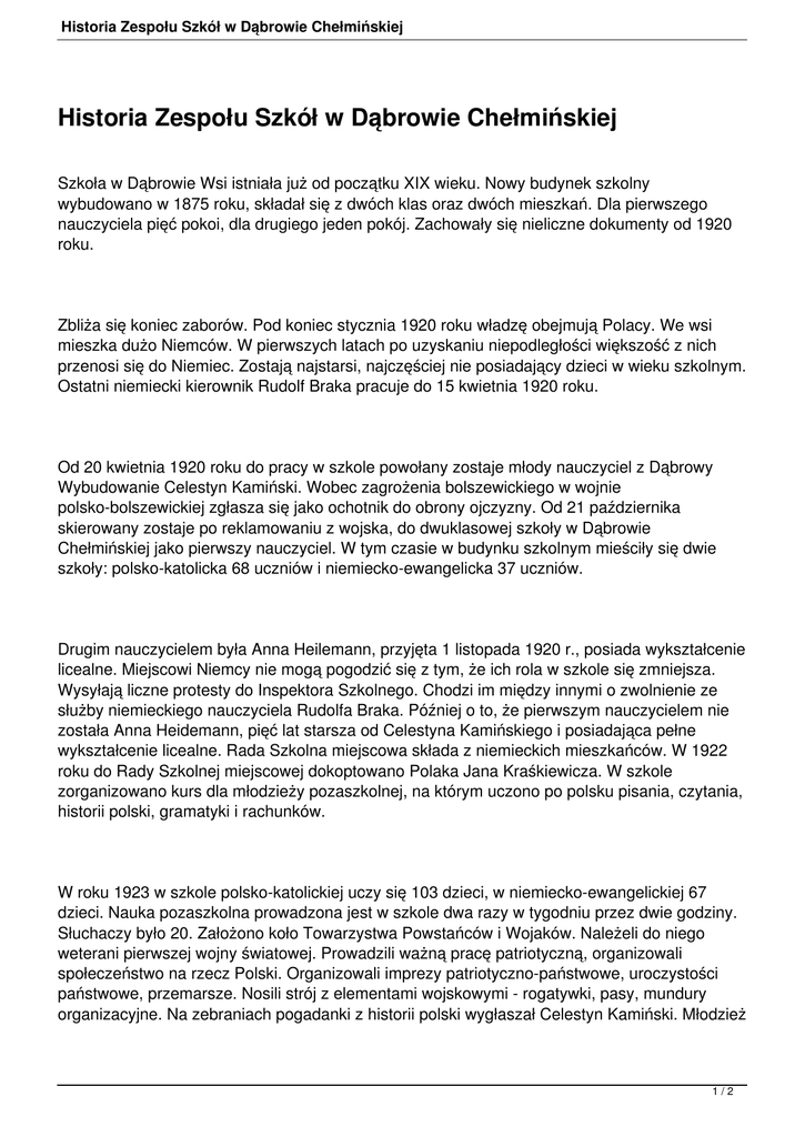 Historia Zespołu Szkół w Dąbrowie Chełmińskiej Historia Zespołu Szkół w Dąbrowie Chełmińskiej Szkoła w Dąbrowie Wsi istniała już od początku XIX wieku. Nowy budynek szkolny wybudowano w 1875 roku, składał się z dwóch klas oraz dwóch mieszkań. Dla pierwszego nauczyciela pięć pokoi, dla drugiego jeden pokój. Zachowały się nieliczne dokumenty od 1920 roku. Zbliża się koniec zaborów. Pod koniec stycznia 1920 roku władzę obejmują Polacy. We wsi mieszka dużo Niemców. W pierwszych latach po uzyskaniu niepodległości większość z nich przenosi się do Niemiec. Zostają najstarsi, najczęściej nie posiadający dzieci w wieku szkolnym. Ostatni niemiecki kierownik Rudolf Braka pracuje do 15 kwietnia 1920 roku. Od 20 kwietnia 1920 roku do pracy w szkole powołany zostaje młody nauczyciel z Dąbrowy Wybudowanie Celestyn Kamiński. Wobec zagrożenia bolszewickiego w wojnie polsko-bolszewickiej zgłasza się jako ochotnik do obrony ojczyzny. Od 21 października skierowany zostaje po reklamowaniu z wojska, do dwuklasowej szkoły w Dąbrowie Chełmińskiej jako pierwszy nauczyciel. W tym czasie w budynku szkolnym mieściły się dwie szkoły: polsko-katolicka 68 uczniów i niemiecko-ewangelicka 37 uczniów. Drugim nauczycielem była Anna Heilemann, przyjęta 1 listopada 1920 r., posiada wykształcenie licealne. Miejscowi Niemcy nie mogą pogodzić się z tym, że ich rola w szkole się zmniejsza. Wysyłają liczne protesty do Inspektora Szkolnego. Chodzi im między innymi o zwolnienie ze służby niemieckiego nauczyciela Rudolfa Braka. Później o to, że pierwszym nauczycielem nie została Anna Heidemann, pięć lat starsza od Celestyna Kamińskiego i posiadająca pełne wykształcenie licealne. Rada Szkolna miejscowa składa z niemieckich mieszkańców. W 1922 roku do Rady Szkolnej miejscowej dokoptowano Polaka Jana Kraśkiewicza. W szkole zorganizowano kurs dla młodzieży pozaszkolnej, na którym uczono po polsku pisania, czytania, historii polski, gramatyki i rachunków. W roku 1923 w szkole polsko-katolickiej uczy się 103 dzieci, w niemiecko-ewangelickiej 67 dzieci. Nauka pozaszkolna prowadzona jest w szkole dwa razy w tygodniu przez dwie godziny. Słuchaczy było 20. Założono koło Towarzystwa Powstańców i Wojaków. Należeli do niego weterani pierwszej wojny światowej. Prowadzili ważną pracę patriotyczną, organizowali społeczeństwo na rzecz Polski. Organizowali imprezy patriotyczno-państwowe, uroczystości państwowe, przemarsze. Nosili strój z elementami wojskowymi - rogatywki, pasy, mundury organizacyjne. Na zebraniach pogadanki z historii polski wygłaszał Celestyn Kamiński. Młodzież 1/2 Historia Zespołu Szkół w Dąbrowie Chełmińskiej wystawiała sztuki teatralne, z których dochód przeznaczano na zakup sztandaru koła TPiW. W 1925 roku podniesiono stopień organizacyjny do szkoły trzyklasowej. Uczyli Celestyn i Stefania Haneltowie oraz nowa nauczycielka Wanda Fiałkówna. Z inicjatywy kierownika szkoły Celestyna Kamińskiego powstał projekt skomasowania obwodów szkoły Dąbrowa Wieś i Dąbrowa Wybudowanie. Dekretem Kuratorium Oświaty z dnia 22 grudnia 1928 r. dokonano komasacji obwodu dwuklasowej Publicznej Szkoły w Dąbrowie Wybudowanie z trzyklasową Publiczną Szkołą w Dąbrowie Wieś na pięcioklasową Publiczną Szkołę w Dąbrowie Chełmińskiej. Zmieniona sieć szkół została wprowadzona od 15 stycznia 1930 r. W 1939 r. w październiku Niemcy aresztują Celestyna Kamińskiego i Maksymiliana Henke. Najpierw trzymają ich kilka dni w Chełmnie, a następnie pod koniec października mordują w lesie w małym Czystym. W lutym 1945 roku wdowy Maria Henke i Stefania Kamińska oraz Augustyna Wiewiórzanka organizują szkołę w Dąbrowie Chełmińskiej. 2/2