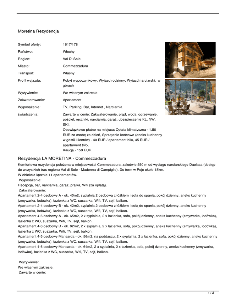 Moretina Rezydencja Symbol oferty: 1617/178 Państwo: Włochy Region: Val Di Sole Miasto: Commezzadura Transport: Własny Profil wyjazdu: Pobyt wypoczynkowy, Wyjazd rodzinny, Wyjazd narciarski, w Wyżywienie: We własnym zakresie Zakwaterowanie: Apartament Wyposażenie: TV, Parking, Bar, Internet , Narciarnia świadczenia: Zawarte w cenie: Zakwaterowanie, prąd, woda, ogrzewanie, górach pościel, ręczniki, narciarnia, garaż, ubezpieczenie KL, NW, SKI. Obowiązkowo płatne na miejscu: Opłata klimatyczna - 1,50 EUR za osobę za dzień, Sprzątanie końcowe (aneks kuchenny w gestii klientów) - 40 EUR / apartament bilo, 45 EUR / apartament trilo, Kaucja - 150 EUR. Rezydencja LA MORETINA - Commezzadura Komfortowa rezydencja położona w miejscowości Commezadura, zaledwie 550 m od wyciągu narciarskiego Daolasa (dostęp do wszystkich tras regionu Val di Sole - Madonna di Campiglio). Do term w Pejo około 18km. W obiekcie łącznie 11 apartamentów. Wyposażenie: Recepcja, bar, narciarnia, garaż, pralka, Wifi (za opłatą). Zakwaterowanie: Apartament 2-4 osobowy A - ok. 40m2, sypialnia 2 osobowa z łóżkiem i sofą do spania, pokój dzienny, aneks kuchenny (zmywarka, lodówka), łazienka z WC, suszarka, Wifi, TV, sejf, balkon. Apartament 2-4 osobowy B - ok. 42m2, sypialnia 2 osobowa z łóżkiem i sofą do spania, pokój dzienny, aneks kuchenny (zmywarka, lodówka), łazienka z WC, suszarka, Wifi, TV, sejf, balkon. Apartament 4-6 osobowy A - ok. 65m2, 2 x sypialnia, 2 x łazienka, sofa, pokój dzienny, aneks kuchenny (zmywarka, lodówka), łazienka z WC, suszarka, Wifi, TV, sejf, balkon. Apartament 4-6 osobowy B - ok. 62m2, 2 x sypialnia, 2 x łazienka, sofa, pokój dzienny, aneks kuchenny (zmywarka, lodówka), łazienka z WC, suszarka, Wifi, TV, sejf, balkon. Apartament 4-5 osobowy Mansarda - ok. 56m2, na poddaszu, 2 x sypialnia, 2 x łazienka, sofa, pokój dzienny, aneks kuchenny (zmywarka, lodówka), łazienka z WC, suszarka, Wifi, TV, sejf, balkon. Apartament 4-6 osobowy Mansarda - ok. 64m2, 2 x sypialnia, 2 x łazienka, sofa, pokój dzienny, aneks kuchenny (zmywarka, lodówka), łazienka z WC, suszarka, Wifi, TV, sejf, balkon. Wyżywienie: We własnym zakresie. Zawarte w cenie: 1/2 Zakwaterowanie, prąd, woda, ogrzewanie, pościel, ręczniki, narciarnia, garaż, ubezpieczenie KL, NW, SKI. Obowiązkowo płatne na miejscu: Opłata klimatyczna - 1,50 EUR za osobę za dzień Sprzątanie końcowe (aneks kuchenny w gestii klientów) - 40 EUR / apartament bilo, 45 EUR / apartament trilo Kaucja - 150 EUR TERMINY: od: 2017-03-04 do: 2017-03-11 (8 dni), miejsca: zamów cena od: 634 PLN = 153 EUR od: 2017-03-11 do: 2017-03-18 (8 dni), miejsca: zamów cena od: 634 PLN = 153 EUR od: 2017-03-18 do: 2017-03-25 (8 dni), miejsca: zamów cena od: 634 PLN = 153 EUR od: 2017-03-25 do: 2017-04-01 (8 dni), miejsca: zamów cena od: 634 PLN = 153 EUR od: 2017-04-01 do: 2017-04-08 (8 dni), miejsca: zamów cena od: 634 PLN = 153 EUR od: 2017-04-08 do: 2017-04-15 (8 dni), miejsca: zamów cena od: 634 PLN = 153 EUR CENNIK: Długość pobytu: 8 dni Grupa cenowa: B Ubezpieczenie (obligatoryjne) (*) Ubezpieczenie KL, NW, SKI 14 (*) Turystyczny Fundusz Gwarancyjny 2.5 Pobyt w obiekcie (do wyboru) Ap. 2-4/ 3 os. standardowo dla osób: 3 589 Ap. 4-6 / 6 os. standardowo dla osób: 6 785 Ap. 2-4/ 4 os. standardowo dla osób: 4 (*) Ap. 2-4 / 2 os. standardowo dla osób: 4 minimalnie: 1 Ap. 4-6 / 4 os. standardowo dla osób: 4 minimalnie: 1 Ap. 4-6 / 5 os. standardowo dla osób: 5 Rodzaj osoby (do wyboru) (*) Uczestnik 633 556 742 785 (-) Waluta: EUR Aktualne ceny z systemu S.A.R.T. (-) - cena usługi, podatku kalkulowana przy osobie lub gratis (*) - kwota wliczona w cenę standardową 2/2