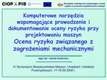 Narzędzia metodyczne wspierające ocenę ryzyka w procesie projektowania maszyn Komputerowe narzędzia wspomagające prowadzenie i dokumentowanie oceny ryzyka przy projektowaniu maszyn Ocena ryzyka związanego z zagrożeniami mechanicznymi mgr inż. Antoni Saulewicz IV Sympozjum Bezpieczeństwa Maszyn, Urządzeń i Instalacji Przemysłowych, 17-19.09.2008 r. Narzędzia metodyczne wspierające ocenę ryzyka w procesie projektowania maszyn Metodyka oceny ryzyka związanego z zagrożeniami mechanicznymi Narzędzia metodyczne wspierające ocenę ryzyka w procesie projektowania maszyn Określenie ograniczeń dotyczących maszyny Narzędzia metodyczne wspierające ocenę ryzyka w procesie projektowania maszyn Okoliczności powstania szkody (urazu, wypadku) Identyfikacja zagrożeń Obecność człowieka człowieka Człowiek Strefa zagrożenia Sytuacja zagrożenia zagrożenia Zagrożenie Zdarzenie zagrażające Uniknięcie lub ograniczenie szkody Szkoda (uraz) Narzędzia metodyczne wspierające ocenę ryzyka w procesie projektowania maszyn Identyfikacja zagrożeń Identyfikacja zagrożeń – c.d. • Sposoby identyfikacji zagrożeń Zagrożenie w postaci potencjalnych następstw (w postaci szkody) Sytuacja zagrożenia Zdarzenie zagrażające (niebezpieczne) Strefa zagrożenia Obecność osoby (osób) Źródło (przyczyna) zagrożenia mechanicznego Narzędzia metodyczne wspierające ocenę ryzyka w procesie projektowania maszyn Identyfikacja zagrożeń zagrożeń ––c.d. Identyfikacja c.d. Narzędzia metodyczne wspierające ocenę ryzyka w procesie projektowania maszyn Oszacowanie i ewaluacja ryzyka • Wg PN-EN ISO 14121-1:2008 oraz raportu ISO TR 14121-2:2007 • Matryca ciężkości szkody „C” oraz klasy prawdopodobieństwa powstania szkody „N „ • Klasa prawdopodobieństwa powstania szkody „N „ jest funkcją częstości i czasu trwania narażenia „Cz”, prawdopodobieństwa wystąpienia zdarzenia zagrażającego „Pr” oraz możliwości uniknięcia lub ograniczenia szkody „M”. Narzędzia metodyczne wspierające ocenę ryzyka w procesie projektowania maszyn Oszacowaniei iewaluacja ewaluacja ryzyka ryzyka –– c.d. Oszacowanie c.d. Ciężkość szkody Klasa 1 2 3 4 Skutek Odwracalne- apteczka pierwszej pomocy Odwracalne – wymagające fachowej pomocy lekarskiej. Zwykle nieodwracalne poważne zranienia - np. utrata palców ręki, utrata palców nogi, złamania (nieraz są to skutki odwracalne), Nieodwracalne, uniemożliwiające powrót do tej samej pracy albo uniemożliwiający powrót do pracy w ogóle – np. śmierć lub utrata oka lub ręki . Narzędzia metodyczne wspierające ocenę ryzyka w procesie projektowania maszyn Oszacowanie i ewaluacja ryzyka – c.d. Częstość i czas trwania narażenia . ≤ 1h Częściej niż co 1 h > 1h ≤ 24 Rzadziej niż co godzinę, ale h częściej niż co 24 h > 24 h ≤ 2 tygodnie > 2 tygodnie ≤ 1 rok > 1 rok 5 4 Rzadziej niż co 24 h, ale częściej niż co 2 tygodnie Rzadziej niż co 2 tygodnie, ale częściej niż co rok 3 Rzadziej niż co rok 1 2 Narzędzia metodyczne wspierające ocenę ryzyka w procesie projektowania maszyn Oszacowanie i ewaluacja ryzyka – c.d. Prawdopodobieństwo wystąpienia zdarzenia niebezpiecznego Bardzo prawdopodobne 5 Gdy, np. gdy brak jest technicznych środków ochronnych i jest swobodny dostęp do strefy zagrożenia. Prawdopodobne 4 Gdy np. zastosowano urządzenia ochronne zależne od człowieka, np. osłony ruchome bez blokowania. Możliwe 3 Mało prawdopodobne 2 Gdy np. jakaś część może się uszkodzić Gdy np. jest mało prawdopodobne, by dana część się uszkodziła Pomijalne 1 Gdy np. zastosowano nieodejmowalne osłony stałe strefy zagrożenia Narzędzia metodyczne wspierające ocenę ryzyka w procesie projektowania maszyn Oszacowanie i ewaluacja ryzyka – c.d. Możliwość uniknięcia lub ograniczenia szkody Niemożliwe Rzadko kiedy możliwe Możliwe 5 Np., gdy zjawisko jest niespodziewane, zachodzące bardzo szybko 3 Np., gdy jest mała możliwość obserwacji ruchu niebezpiecznego 1 Np. gdy można uniknąć dotyku części ruchomych osłoniętych blokującą osłoną z ryglowaniem Narzędzia metodyczne wspierające ocenę ryzyka w procesie projektowania maszyn Oszacowanie i iewaluacja ryzyka – c.d. Oszacowanie ewaluacja ryzyka – c.d. Narzędzia metodyczne wspierające ocenę ryzyka w procesie projektowania maszyn Zmniejszanie ryzyka Narzędzia metodyczne wspierające ocenę ryzyka w procesie projektowania maszyn Ryzyko resztkowe, wymagania zasadnicze Narzędzia metodyczne wspierające ocenę ryzyka w procesie projektowania maszyn Dokumentacja oceny – przykład dokumentu Narzędzia metodyczne wspierające ocenę ryzyka w procesie projektowania maszyn DZIĘKUJĘ ZA UWAGĘ