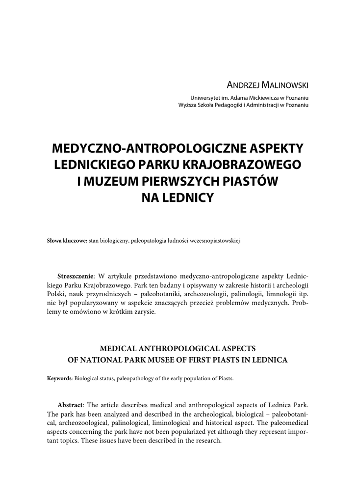 ANDRZEJ MALINOWSKI Uniwersytet im. Adama Mickiewicza w Poznaniu Wyższa Szkoła Pedagogiki i Administracji w Poznaniu MEDYCZNO-ANTROPOLOGICZNE ASPEKTY LEDNICKIEGO PARKU KRAJOBRAZOWEGO I MUZEUM PIERWSZYCH PIASTÓW NA LEDNICY Słowa kluczowe: stan biologiczny, paleopatologia ludności wczesnopiastowskiej Streszczenie: W artykule przedstawiono medyczno-antropologiczne aspekty Lednickiego Parku Krajobrazowego. Park ten badany i opisywany w zakresie historii i archeologii Polski, nauk przyrodniczych – paleobotaniki, archeozoologii, palinologii, limnologii itp. nie był popularyzowany w aspekcie znaczących przecież problemów medycznych. Problemy te omówiono w krótkim zarysie. MEDICAL ANTHROPOLOGICAL ASPECTS OF NATIONAL PARK MUSEE OF FIRST PIASTS IN LEDNICA Keywords: Biological status, paleopathology of the early population of Piasts. Abstract: The article describes medical and anthropological aspects of Lednica Park. The park has been analyzed and described in the archeological, biological – paleobotanical, archeozoological, palinological, liminological and historical aspect. The paleomedical aspects concerning the park have not been popularized yet although they represent important topics. These issues have been described in the research. 26 Homines Hominibus nr 1(4) 2008 Lednicki Park Krajobrazowy leży na obszarze Pojezierza Wielkopolskiego około 15 km na zachód od Gniezna, liczy ok. 5 tys. ha powierzchni. Jego centrum stanowi Jezioro Lednickie o powierzchni 339,1 ha. Długość jeziora wynosi 7300 m, szerokość 925 m, średnia głębokość 7 m, przy największej głębi ponad 15 m. Na jeziorze znajduje się 5 wysp o łącznej powierzchni 9,4 ha, z których największą jest Ostrów Lednicki zaliczony w poczet 15 obiektów zabytkowych o szczególnej wartości dla kultury narodowej jako pomnik naszej historii. W 1969 r. powstało na Lednicy Muzeum Pierwszych Piastów. Ostrów Lednicki leży 18 km od Gniezna i 38 km od Poznania. Pierwsze historyczne wzmianki o tej wyspie pochodzą z bulli Innocentego II z 1136 r., następnie z opisu Jana Długosza, którego zdaniem tam była wzniesiona pierwsza Katedra w Polsce. Tam też miał się urodzić Bolesław Chrobry, istniał również gród i zamek obronny od 1038 r. Od czasów zbudowania katedry zaczęło funkcjonować cmentarzysko na wyspie. Właśnie to cmentarzysko obok pallatium przyciągnęło Adama Wrzoska do badań antropologicznych. Badania z udziałem M. Ćwirko-Godyckiego i Z. Zakrzewskiego trwały od 1932 do 1935 roku. W pracach brali udział również studenci medycyny. Z tych prac badawczych pochodziła kolekcja 1576 szkieletów. Po wojnie już od 1949 r. prowadzono tam kolejne prace wykopaliskowe, w czasie których pozyskano dalsze 350 szkieletów. Do 1996 r. stan liczbowy szkieletów ludzkich wynosił 2370 i corocznie stale się zwiększa. Prace wykopaliskowe przeniosły się z Ostrowa Lednickiego na jego pobrzeże, gdzie wykryto cmentarzyska wcześniej i później datowane od Lednickiego. Taka sytuacja pozwala na śledzenie czasowych przemian sytuacji i zjawisk biomedycznych tej regionalnej populacji okresu piastowskiego. Istotnym elementem rekonstrukcji obrazu tego regionu są badania paleoklimatologiczne, paleoekologiczne, paleobotaniczne, archeozoologiczne, archeologiczne (w tym podwodne), badania faunistyczne, florystyczne, hydrobiologiczne, etnograficzne. One to wespół z badaniami paleopatologicznymi szkieletów i innymi analizami antropologicznymi pozwalają na pełną w miarę rekonstrukcję obrazu życia, warunków sanitarnych, higienicznych, diety i stanu zdrowia naszych piastowskich przodków. Podejmując to zadanie Adam Wrzosek i Michał Ćwirko-Godycki mieli pełną świadomość znaczenia tego obiektu dla historii, kultury narodowej i nauki. Sądzę, że obok organizacji przez Stefana Różyckiego świetnego muzeum anatomicznego (z działami anatomii rozwojowej, porównawczej, antropologii, anatomii rentgenowskiej), kolekcja szkieletów z Lednicy stanowiła największy co do wartości dorobek muzealny Wydziału Lekarskiego Uniwersytetu Poznańskiego. Gromadzone w Zakładzie Antropologii szkielety były dokładnie numerowane (każda kość), posiadały powiązane z czaszką żuchwy, zestawione kręgosłupy i miednice, co stanowiło o pełnym ich przygotowaniu do badań naukowych. W okresie okupacji pomieszczenia zakładu przeznaczono na potrzeby szpitala wojskowego, wobec czego szkielety przerzucono do piwnic, jednak pewną część kolekcji wysłano do przerobu na nawóz sztuczny do fabryki na Starołęce. Już przed wojną wykonano w oparciu o materiały z Ostrowa Lednickiego kilka prac doktorskich i ogłoszono kilka artykułów. Andrzej Malinowski – Medyczno-antropologiczne aspekty 27 Według inicjatorów badań, początek cmentarzyska przypada na początek X wieku, natomiast koniec użytkowania na XII wiek. Już w 1936 r. Howorka1 opisał starcie koron i frekwencję próchnicy zębów 145 osobników dorosłych z Ostrowa Lednickiego, znajdując frekwencję w 50,4% przypadków. Jest ona wyższa niż dla mieszkańców grodzisk z pobliskiego Giecza, Kruszwicy i Strzelna czy Lądu – poniżej 40%, lecz niższa niż we wczesnośredniowiecznym Poznaniu – 63%. Ostrowska i Żółkiewicz2 określili też wysokość ciała tej ludności uzyskując dla mężczyzn średnio 165,3 cm, a dla kobiet 153 cm. Późniejsze szacunki F. Wokroja3 wykazały, że mężczyźni mierzyli 167,5 cm, a kobiety 156,3 cm. To wszystko były jednak badania wstępne. Na opracowanie różnych problemów paleopatologii kostnej i zębowej czeka, pomnażany co roku, olbrzymi już materiał pozwalający na wiążące ustalenia stanu biologicznego ludności tego regionu w okresie wczesnopiastowskim. W latach 1977-78 wyniki badań międzywojennych podsumował w obszernym opracowaniu Godycki i Swedborg4. Szczegółowo omówiono cechy metryczne i opisowe czaszek i szkieletów oraz opisano przejawy patologii szkieletu. Analizę paleopatologic