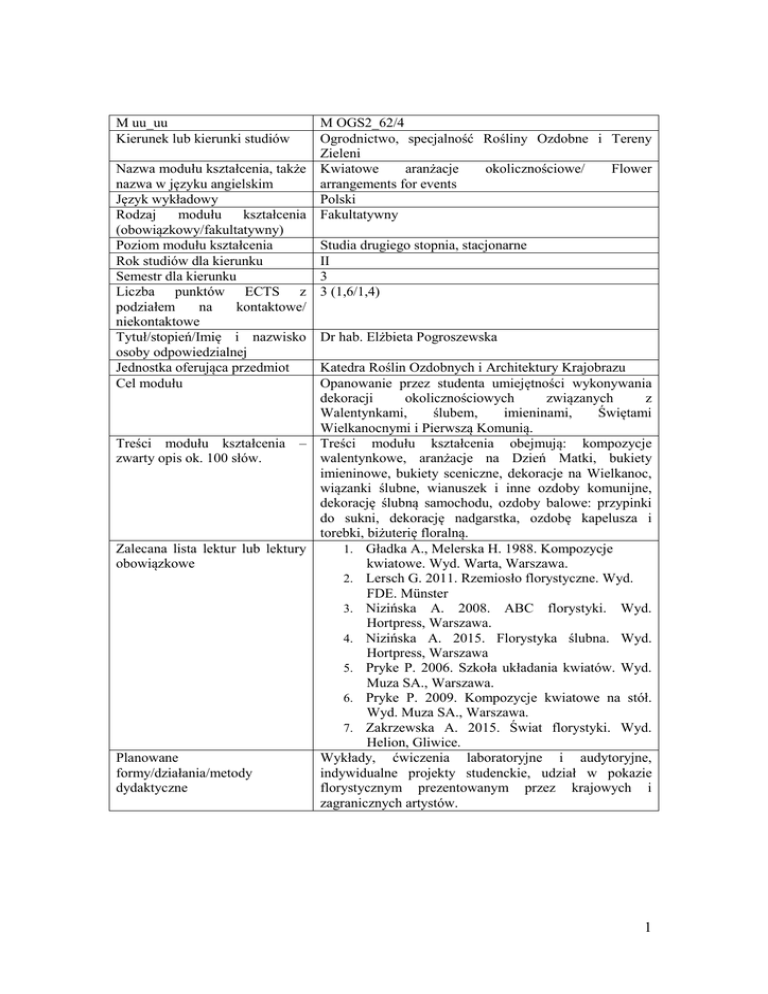 M uu_uu M OGS2_62/4 Kierunek lub kierunki studiów Ogrodnictwo