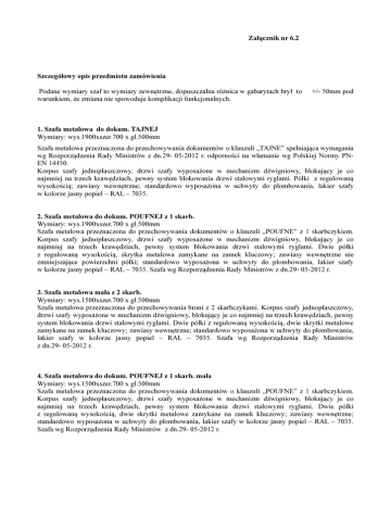 Załącznik nr 6.2 Szczegółowy opis przedmiotu zamówienia Podane wymiary szaf to wymiary zewnętrzne, dopuszczalna różnica w gabarytach brył to warunkiem, że zmiana nie spowoduje komplikacji funkcjonalnych. +/- 50mm pod 1. Szafa metalowa do dokum. TAJNEJ Wymiary: wys.1900xszer.700 x gł.500mm Szafa metalowa przeznaczona do przechowywania dokumentów o klauzuli „TAJNE” spełniająca wymagania wg Rozporządzenia Rady Ministrów z dn.29- 05-2012 r. odporności na włamanie wg Polskiej Normy PNEN 14450. Korpus szafy jednopłaszczowy, drzwi szafy wyposażone w mechanizm dźwigniowy, blokujący je co najmniej na trzech krawędziach, pewny system blokowania drzwi stalowymi ryglami. Półki z regulowaną wysokością; zawiasy wewnętrzne; standardowo wyposażona w uchwyty do plombowania, lakier szafy w kolorze jasny popiel – RAL – 7035. 2. Szafa metalowa do dokum. POUFNEJ z 1 skarb. Wymiary: wys.1900xszer.700 x gł.500mm Szafa metalowa przeznaczona do przechowywania dokumentów o klauzuli „POUFNE” z 1 skarbczykiem. Korpus szafy jednopłaszczowy, drzwi szafy wyposażone w mechanizm dźwigniowy, blokujący je co najmniej na trzech krawędziach, pewny system blokowania drzwi stalowymi ryglami. Dwie półki z regulowaną wysokością, skrytka metalowa zamykane na zamek kluczowy; zawiasy wewnętrzne nie zmniejszające powierzchni półki; standardowo wyposażona w uchwyty do plombowania, lakier szafy w kolorze jasny popiel – RAL – 7035. Szafa wg Rozporządzenia Rady Ministrów z dn.29- 05-2012 r. 3. Szafa metalowa mała z 2 skarb. Wymiary: wys.1500xszer.700 x gł.500mm Szafa metalowa przeznaczona do przechowywania broni z 2 skarbczykami. Korpus szafy jednopłaszczowy, drzwi szafy wyposażone w mechanizm dźwigniowy, blokujący je co najmniej na trzech krawędziach, pewny system blokowania drzwi stalowymi ryglami. Dwie półki z regulowaną wysokością, dwie skrytki metalowe zamykane na zamek kluczowy; zawiasy wewnętrzne; standardowo wyposażona w uchwyty do plombowania, lakier szafy w kolorze jasny popiel – RAL – 7035. Szafa wg Rozporządzenia Rady Ministrów z dn.29- 05-2012 r. 4. Szafa metalowa do dokum. POUFNEJ z 1 skarb. mała Wymiary: wys.1500xszer.700 x gł.500mm Szafa metalowa przeznaczona do przechowywania dokumentów o klauzuli „POUFNE” z 1 skarbczykiem. Korpus szafy jednopłaszczowy, drzwi szafy wyposażone w mechanizm dźwigniowy, blokujący je co najmniej na trzech krawędziach, pewny system blokowania drzwi stalowymi ryglami. Dwie półki z regulowaną wysokością, dwie skrytki metalowe zamykane na zamek kluczowy; zawiasy wewnętrzne; standardowo wyposażona w uchwyty do plombowania, lakier szafy w kolorze jasny popiel – RAL – 7035. Szafa wg Rozporządzenia Rady Ministrów z dn.29- 05-2012 r. 5. Szafa metalowa na broń krótką- 125 jednostek Szafa metalowa do przechowywania broni krótkiej spełniająca normy PN-EN 14450:2006 zgodnie z Certyfikatem IMP. Korpus i drzwi wykonane z blachy stalowej o grubości 3mm nadającej odpowiednią sztywność oraz zabezpieczonej przed korozją. Szafa wyposażona w zamek, zabezpieczony przed działaniem destrukcyjnym w tym przed przewierceniem. Drzwi szafy blokowane mechanizmem ryglowym na trzech krawędziach oraz stałym ryglem przyzawiasowym. Półki wewnętrzne wykonane z blachy o grubości 3 mm z regulacją wysokości zawieszenia o maksymalnym obciążeniu 50 kg wraz ze stojakami z tworzywa na broń krótką w ilości 125 szt. Zawiasy wewnętrzne. Kąt otwarcia drzwi wynosi 90°. Kolor RAL- 7035. 6. Szafa metalowa na broń krótką- 50 jednostek Szafa metalowa do przechowywania broni krótkiej spełniająca normy PN-EN 14450:2006 zgodnie z Certyfikatem IMP. Korpus i drzwi wykonane z blachy stalowej o grubości 3mm nadającej odpowiednią sztywność oraz zabezpieczonej przed korozją. Szafa wyposażona w zamek, zabezpieczony przed działaniem destrukcyjnym w tym przed przewierceniem. Drzwi szafy blokowane mechanizmem ryglowym na trzech krawędziach oraz stałym ryglem przyzawiasowym. Półki wewnętrzne wykonane z blachy o grubości 3 mm z regulacją wysokości zawieszenia o maksymalnym obciążeniu 50 kg wraz ze stojakami z tworzywa na broń krótką w ilości 50 szt. Zawiasy wewnętrzne. Kąt otwarcia drzwi wynosi 90°. Kolor RAL- 7035. 7. Szafa metalowa na broń alarmową Szafa metalowa do przechowywania broni spełniająca normy PN-EN 14450:2006, zgodnie z Certyfikatem IMP. Korpus i drzwi wykonane z blachy stalowej o grubości 3mm nadającej odpowiednią sztywność oraz zabezpieczonej przed korozją. Szafa wyposażona w zamek, zabezpieczony przed działaniem destrukcyjnym w tym przed przewierceniem. Drzwi szafy blokowane mechanizmem ryglowym na trzech krawędziach oraz stałym ryglem przyzawiasowym. Półki wewnętrzne wykonane z blachy o grubości 3 mm z regulacją wysokości zawieszenia o maksymalnym obciążeniu 50 kg. Szafa przystosowana do przechowywania broni długiej oraz krótkiej w ilości 30szt. (Wykonawca uzgodni ostateczna proporcję broni krótkiej do długiej z Zamawiającym). Zawiasy wewnętrzne. Kąt otwarcia drzwi wynosi 90°. Kolor RAL- 7035. 8. Szafa na broń długą – 45 jednostek wymiary: wys. 2100x gł.400mm Szafa metalowa spełniająca normę PN-EN 14450:2006, zgodnie z Certyfikatem IMP, do przechowywania broni długiej typu PM wraz ze skrytką na przechowywanie amunicji. Korpus dwuściankowy o grubości 30 mm. Drzwi trzystronnie ryglowane, zamykane zamkiem kluczowym (standardowo z dwoma kluczami). Kąt otwarcia drzwi – 120o. Szafa wyposażona w półki w odstępach min. 50cm z uchwytami na broń. Szafa przeznaczona do przechowania 45 szt broni. Standardowo uchwyty na wyciory umieszczone na blasze osłonowej drzwi. Otwory do montażu - 4 w ścianie tylnej. Lakier RAL 7035 (jasno-szary). 9. Szafa na broń długą – 20 jednostek wymiary: wys. 1800x gł.400mm Szafa metalowa spełniająca normę PN-EN 14450:2006, zgodnie z Certyfikatem IMP, do przechowywania broni długiej wraz ze