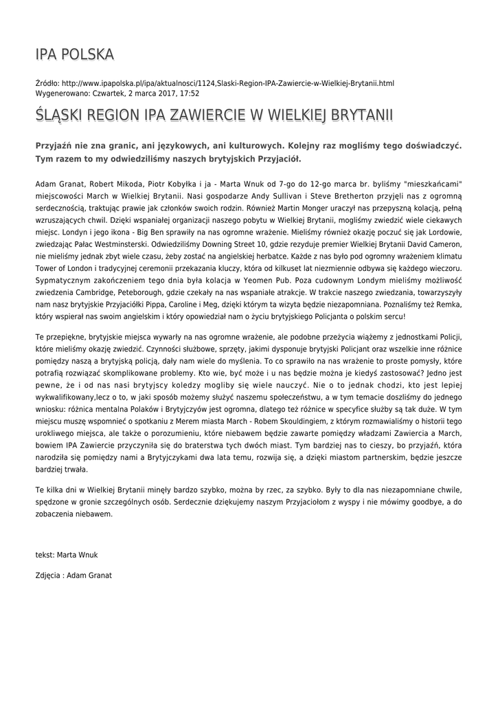 IPA POLSKA Źródło: http://www.ipapolska.pl/ipa/aktualnosci/1124,Slaski-Region-IPA-Zawiercie-w-Wielkiej-Brytanii.html Wygenerowano: Czwartek, 2 marca 2017, 17:52 ŚLĄSKI REGION IPA ZAWIERCIE W WIELKIEJ BRYTANII Przyjaźń nie zna granic, ani językowych, ani kulturowych. Kolejny raz mogliśmy tego doświadczyć. Tym razem to my odwiedziliśmy naszych brytyjskich Przyjaciół. Adam Granat, Robert Mikoda, Piotr Kobyłka i ja - Marta Wnuk od 7-go do 12-go marca br. byliśmy "mieszkańcami" miejscowości March w Wielkiej Brytanii. Nasi gospodarze Andy Sullivan i Steve Bretherton przyjęli nas z ogromną serdecznością, traktując prawie jak członków swoich rodzin. Również Martin Monger uraczył nas przepyszną kolacją, pełną wzruszających chwil. Dzięki wspaniałej organizacji naszego pobytu w Wielkiej Brytanii, mogliśmy zwiedzić wiele ciekawych miejsc. Londyn i jego ikona - Big Ben sprawiły na nas ogromne wrażenie. Mieliśmy również okazję poczuć się jak Lordowie, zwiedzając Pałac Westminsterski. Odwiedziliśmy Downing Street 10, gdzie rezyduje premier Wielkiej Brytanii David Cameron, nie mieliśmy jednak zbyt wiele czasu, żeby zostać na angielskiej herbatce. Każde z nas było pod ogromny wrażeniem klimatu Tower of London i tradycyjnej ceremonii przekazania kluczy, która od kilkuset lat niezmiennie odbywa się każdego wieczoru. Sypmatycznym zakończeniem tego dnia była kolacja w Yeomen Pub. Poza cudownym Londym mieliśmy możliwość zwiedzenia Cambridge, Peteborough, gdzie czekały na nas wspaniałe atrakcje. W trakcie naszego zwiedzania, towarzyszyły nam nasz brytyjskie Przyjaciółki Pippa, Caroline i Meg, dzięki którym ta wizyta będzie niezapomniana. Poznaliśmy też Remka, który wspierał nas swoim angielskim i który opowiedział nam o życiu brytyjskiego Policjanta o polskim sercu! Te przepiękne, brytyjskie miejsca wywarły na nas ogromne wrażenie, ale podobne przeżycia wiążemy z jednostkami Policji, które mieliśmy okazję zwiedzić. Czynności służbowe, sprzęty, jakimi dysponuje brytyjski Policjant oraz wszelkie inne różnice pomiędzy naszą a brytyjską policją, dały nam wiele do myślenia. To co sprawiło na nas wrażenie to proste pomysły, które potrafią rozwiązać skomplikowane problemy. Kto wie, być może i u nas będzie można je kiedyś zastosować? Jedno jest pewne, że i od nas nasi brytyjscy koledzy mogliby się wiele nauczyć. Nie o to jednak chodzi, kto jest lepiej wykwalifikowany,lecz o to, w jaki sposób możemy służyć naszemu społeczeństwu, a w tym temacie doszliśmy do jednego wniosku: różnica mentalna Polaków i Brytyjczyów jest ogromna, dlatego też różnice w specyfice służby są tak duże. W tym miejscu muszę wspomnieć o spotkaniu z Merem miasta March - Robem Skouldingiem, z którym rozmawialiśmy o historii tego urokliwego miejsca, ale także o porozumieniu, które niebawem będzie zawarte pomiędzy władzami Zawiercia a March, bowiem IPA Zawiercie przyczyniła się do braterstwa tych dwóch miast. Tym bardziej nas to cieszy, bo przyjaźń, która narodziła się pomiędzy nami a Brytyjczykami dwa lata temu, rozwija się, a dzięki miastom partnerskim, będzie jeszcze bardziej trwała. Te kilka dni w Wielkiej Brytanii minęły bardzo szybko, można by rzec, za szybko. Były to dla nas niezapomniane chwile, spędzone w gronie szczególnych osób. Serdecznie dziękujemy naszym Przyjaciołom z wyspy i nie mówimy goodbye, a do zobaczenia niebawem. tekst: Marta Wnuk Zdjęcia : Adam Granat Ocena: 5/5 (1) Tweetnij