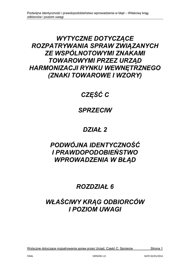 Podwójna identyczność i prawdopodobieństwo wprowadzenia w błąd – Właściwy krąg odbiorców i poziom uwagi WYTYCZNE DOTYCZĄCE ROZPATRYWANIA SPRAW ZWIĄZANYCH ZE WSPÓLNOTOWYMI ZNAKAMI TOWAROWYMI PRZEZ URZĄD HARMONIZACJI RYNKU WEWNĘTRZNEGO (ZNAKI TOWAROWE I WZORY) CZĘŚĆ C SPRZECIW DZIAŁ 2 PODWÓJNA IDENTYCZNOŚĆ I PRAWDOPODOBIEŃSTWO WPROWADZENIA W BŁĄD ROZDZIAŁ 6 WŁAŚCIWY KRĄG ODBIORCÓW I POZIOM UWAGI Wytyczne dotyczące rozpatrywania spraw przez Urząd, Część C: Sprzeciw FINAL VERSION 1.0 Strona 1 DATE 02/01/2014 Podwójna identyczność i prawdopodobieństwo wprowadzenia w błąd – Właściwy krąg odbiorców i poziom uwagi Spis treści 1 2 3 Wstęp .......................................................................................................... 3 1.1 Właściwy krąg odbiorców .......................................................................... 3 1.2 Poziom uwagi odbiorców........................................................................... 4 Definicja właściwego kręgu odbiorców – uwagi ogólne ........................ 5 2.1 Definicja części odbiorców, dla których oceniane jest prawdopodobieństwo wprowadzenia w błąd ........................................... 5 2.2 Właściwy krąg odbiorców w przypadku środków farmaceutycznych .... 7 Poziom uwagi............................................................................................. 8 3.1 Zaangażowanie w zakup ............................................................................ 9 3.1.1 Wysoki poziom uwagi ..................................................................................... 9 3.1.1.1 3.1.1.2 3.1.1.3 3.1.1.4 3.1.2 3.1.3 Kosztowne i rzadkie zakupy ........................................................................ 9 Potencjalnie niebezpieczne przedmioty .................................................... 10 Lojalność wobec marki .............................................................................. 11 Zwiększony poziom uwagi w odniesieniu do określonych towarów z szerokiej kategorii produktów .................................................................... 11 Niski poziom uwagi ....................................................................................... 11 Poziom uwagi w przypadku środków farmaceutycznych ............................. 12 Wytyczne dotyczące rozpatrywania spraw przez Urząd, Część C: Sprzeciw FINAL VERSION 1.0 Strona 2 DATE 02/01/2014 Podwójna identyczność i prawdopodobieństwo wprowadzenia w błąd – Właściwy krąg odbiorców i poziom uwagi Wstęp 1 Prawdopodobieństwo wprowadzenia w błąd (w tym prawdopodobieństwo skojarzenia) występuje wtedy, gdy istnieje ryzyko, że odbiorcy mogą nabrać przekonania, że dane towary lub usługi pochodzą z tego samego przedsiębiorstwa lub, w zależności od sytuacji, z przedsiębiorstw powiązanych gospodarczo. To, czy występuje prawdopodobieństwo wprowadzenia w błąd, zależy od ogólnej oceny kilku zależnych od siebie czynników, takich jak: (i) podobieństwo towarów i usług, (ii) podobieństwo oznaczeń, (iii) odróżniające i dominujące elementy w kolidujących ze sobą oznaczeniach, (iv) odróżniający charakter wcześniejszego znaku oraz (v) właściwy krąg odbiorców. Pierwszym krokiem w ocenie występowania prawdopodobieństwa wprowadzenia w błąd jest ustalenie tych pięciu czynników. Drugi krok to określenie ich znaczenia. Niniejszy rozdział dotyczy właściwego kręgu odbiorców znaku jako jednego z kluczowych czynników uwzględnianych przy ocenie prawdopodobieństwa wprowadzenia w błąd. W rozdziale omówiono również kwestię poziomu uwagi poświęcanej przez właściwy krąg odbiorców rozpatrywanym towarom lub usługom. Właściwy krąg odbiorców 1.1 Właściwy krąg odbiorców odgrywa istotną rolę przy ocenie innych elementów prawdopodobieństwa wprowadzenia w błąd. • Porównanie towarów i usług Faktyczni i potencjalni klienci spornych towarów i usług stanowią jeden z czynników, które należy uwzględnić podczas analizy podobieństwa pomiędzy takimi towarami i usługami. 1 Przykład Materiały typu skóra i skóry zwierzęce to surowce przeznaczone do stosowania w branży, podczas gdy do końcowych klientów kierowane są wyroby skórzane. Różny jest właściwy krąg odbiorców i różne są towary. Analogicznie różnią się metale szlachetne (klasa 14) i biżuteria (klasa 14). • Porównanie oznaczeń Kwestia właściwego kręgu odbiorców odgrywa również istotną rolę przy porównywaniu oznaczeń. To samo słowo może być wymawiane w różny sposób w zależności od właściwego kręgu odbiorców. Odbiorcy z jednej części Unii Europejskiej mogą rozumieć znaczenie znaku pod względem koncepcyjnym, podczas gdy może on być niezrozumiały dla konsumentów z innych części Unii. 2 Zob. Wytyczne, część C: Sprzeciw, dział 2: Podwójna identyczność i prawdopodobieństwo wprowadzenia w błąd, rozdział 2: Porównanie towarów i usług. 2 Zob. Wytyczne, część C: Sprzeciw, dział 2: Podwójna identyczność i prawdopodobieństwo wprowadzenia w błąd, rozdział 3: Porównanie oznaczeń. 1 Wytyczne dotyczące rozpatrywania spraw przez Urząd, Część C: Sprzeciw FINAL VERSION 1.0 Strona 3 DATE 02/01/2014 Podwójna identyczność i prawdopodobieństwo wprowadzenia w błąd – Właściwy krąg odbiorców i poziom uwagi Przykład Sąd potwierdził, że ogół odbiorców w krajach skandynawskich, Niderlandach i Finlandii ma podstawową znajomość języka angielskiego (wyrok z 26/11/2008 w sprawie T-435/07 „NEW LOOK”, pkt 23). • Odróżniające elementy oznaczeń / charakter odróżniający wcześniejszego znaku Samoistny charakter odróżniający oznaczenia lub jednego z jego elementów również będzie zależał od właściwego kręgu odbiorców towarów i usług. Przykładowo w zależności od wiedzy i wykształcenia właściwego kręgu odbiorców oraz od język