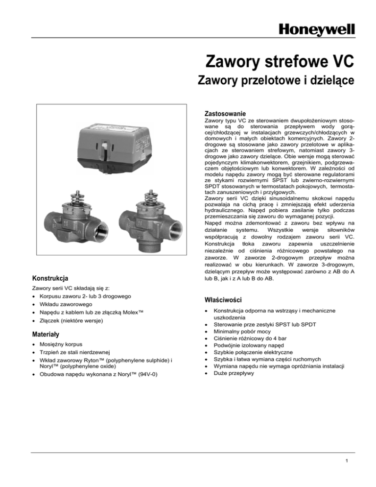 Zawory serii VC Zawory strefowe VC Zawory przelotowe i dzielące Zastosowanie Konstrukcja Zawory typu VC ze sterowaniem dwupołożeniowym stosowane są do sterowania przepływem wody gorącej/chłodzącej w instalacjach grzewczych/chłodzących w domowych i małych obiektach komercyjnych. Zawory 2drogowe są stosowane jako zawory przelotowe w aplikacjach ze sterowaniem strefowym, natomiast zawory 3drogowe jako zawory dzielące. Obie wersje mogą sterować pojedynczym klimakonwektorem, grzejnikiem, podgrzewaczem objętościowym lub konwektorem. W zależności od modelu napędu zawory mogą być sterowane regulatorami ze stykami rozwiernymi SPST lub zwierno-rozwiernymi SPDT stosowanych w termostatach pokojowych, termostatach zanuszeniowych i przylgowych. Zawory serii VC dzięki sinusoidalnemu skokowi napędu pozwalaja na cichą pracę i zmniejszają efekt uderzenia hydraulicznego. Napęd pobiera zasilanie tylko podczas przemieszczania się zaworu do wymaganej pozycji. Napęd można zdemontować z zaworu bez wpływu na działanie systemu. Wszystkie wersje siłowników współpracują z dowolny rodzajem zaworu serii VC. Konstrukcja tłoka zaworu zapewnia uszczelnienie niezależnie od ciśnienia różnicowego powstałego na zaworze. W zaworze 2-drogowym przepływ można realizować w obu kierunkach. W zaworze 3-drogowym, dzielącym przepływ może występować zarówno z AB do A lub B, jak i z A lub B do AB. Zawory serii VC składają się z: Korpusu zaworu 2- lub 3 drogowego Wkładu zaworowego Napędu z kablem lub ze złączką Molex™ Złączek (niektóre wersje) Materiały Mosiężny korpus Trzpień ze stali nierdzewnej Wkład zaworowy Ryton™ (polyphenylene sulphide) i Noryl™ (polyphenylene oxide) Obudowa napędu wykonana z Noryl™ (94V-0) Właściwości Konstrukcja odporna na wstrząsy i mechaniczne uszkodzenia Sterowanie prze zestyki SPST lub SPDT Minimalny pobór mocy Ciśnienie różnicowy do 4 bar Podwójnie izolowany napęd Szybkie połączenie elektryczne Szybka i łatwa wymiana części ruchomych Wymiana napędu nie wymaga opróżniania instalacji Duże przepływy 1 Zawory serii VC Dane techniczne Medium Wartość pH Temperatura pracy Temp. otoczenia Ciśnienie znamionowe Ciśnienie różnicowe na zaworze Wartość kvs Przepływ woda lub mieszanina z glikolem (maks. 50% zawartości glikolu), zgodnie z VDI 2035 8...9.5 1...95°C maks. 120°C (krótkotrwale) maks. 65°C maks. 20 bar (statyczne) maks. 100 bar (niszczące) maks. 4 bar patrz: “Wymiary” zaw. 2-dr.: kierunek przepływu w dowolnym kierunku. Bez napędu zawór jest zamknięty. 3-dr: dolny otwór przelotowy oznaczony AB, boczne A i B. Bez napędu otwór przelotowy A jest zamknięty. Napięcie 200-240 V, 50-60 Hz Pobór mocy 4 VA (tylko podczas przebiegu siłownika) Obciążalność styków 1,0 A dla 250 V, 50-60 Hz pomocniczych (minimum 0.05 A dla 24 Vdc) Czas przebiegu 7 sek. (20% szybciej dla 60 Hz) Sposób zasilania 1. kabel z wtykiem Molex™ 2. kabel 1 m integralny z napędem Temp. transportu -40…65°C Wilgotność otoczenia 5…95% RH (bez kondensacji) Warunki otoczenia nie korozyjne, nie eksplozyjne Działanie Zawory 2-dr. typu VC są stosowane do sterowania przepływem wody gorącej/chłodzącej w instalacjach grzewczych/chłodzących w domowych i małych obiektach komercyjnych. Zawory składają się z wkładu zaworu oraz korpusu mosiężnego. Otwory przelotowe są uszczelniane O-ringami na zewnętrznej powierzchni tłoka. Kiedy trzpień zaworu przemieszcza się w dolne położenie wówczas otwiera przepływ w przelocie A. W zaworze 3-dr. przemieszczenie tłoka w dolne położenie powoduje zamknięcie przepływu przelotu B umożliwiając przepływ z kierunku AB do A. Kiedy trzepień przemieszcza się w kierunku górnym następuje przepływ z AB do B. Zawór 2-drogowy, przelotowy Siłownik ze stykiem SPDT W momencie otrzymania sygnału zapotrzebowania na ciepło, styk NO termostatu zostaje zwarty, otwierając zawór. Kiedy zawór jest całkowicie otwarty mechanizm krzywkowy powoduje zwarcie styku SW1 i jednocześnie rozwarcie styku SW2. W momencie zaniku sygnału zapotrzebowania na ciepło styk NC termostatu zostaje zwarty powodując zasilanie silnika poprzez styk SW1 i zamykanie zaworu. Kiedy zawór jest całkowicie zamknięty, mechanizm krzywkowy zwiera styk SW2 i jednocześnie rozwiera styk SW1. Zawór będzie oczekiwał na kolejne zapotrzebowanie na ciepło. Siłownik ze stykiem SPST W momencie otrzymania sygnału zapotrzebowania na ciepło styk termostatu powoduje zasilanie RLY1 oraz zwarcie styku NO na przekaźniku SW3. Zawór otwiera przepływ. Po osiągnięciu pełnego otwarcia mechanizm krzywkowy zwiera styk SW1 i rozwiera SW2. Osiągnięcie żądanej temperatury powoduje rozwarcie 2 styku termostatu i zdjęcie napięcia z RLY1. Silnik siłownika jest zasilany wówczas poprzez załączone styki NC przekaźnika SW3 i SW1. Gdy trzpień zaworu osiągnie pozycję całkowitego zamknięcia, mechanizm krzywkowy zewrze styk SW2 i jednocześnie otworzy styk SW1 Zawór będzie oczekiwał na kolejne zapotrzebowanie na ciepło. W obu typach siłowników przy zaniku napięcia trzpień zaworu pozostaje w pozycji jaką zajmował, gdy nastapił zanik zasilania. Po przywróceniu napięcia siłownik powróci do pozycji pracy zgodnie z zapotrzebowaniem regulatora. Rys. 1. Przepływ przez zawór przelotowy Zawory serii VC Zawór 3-drogowy (dzielący) Siłownik ze stykiem SPDT W momencie otrzymania sygnału zapotrzebowania na ciepło, styk NO termostatu zostaje zwarty zamykając przez przelot B i otwierając przepływ przez A. Kiedy przepływ przez A jest całkowicie otwarty mechanizm krzywkowy powoduje zwarcie styku SW1 i jednocześnie rozwarcie styku SW2. W momencie zaniku sygnału zapotrzebowania na ciepło styk NC termostatu zostaje zwarty powodując zasilanie silnika poprzez styk SW1 i zamykanie przepływu przez przelot A. Kiedy zawór jest całkowicie zamknięty, mechanizm krzywkowy zwiera styk SW2 i jednocześ