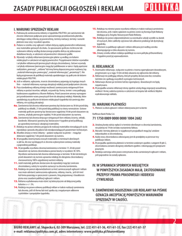 Zasady publikacji ogłoszeń i reklam I. WARUNKI SPRZEDAŻY REKLAM 1. Podstawą do zamieszczenia reklamy w tygodniku POLITYKA jest zamówienie lub zlecenie reklamowe podpisane przez upoważnionego przedstawiciela płatnika, określające rodzaj reklamy, jej powierzchnię, terminy realizacji, terminy i warunki płatności oraz cenę i wysokość upustów. 2. Podane w cenniku ceny ogłoszeń i reklam dotyczą zajętej powierzchni reklamowej oraz materiałów gotowych do druku. Za opracowanie graficzno-techniczne lub wykonanie reklamy według dostarczonego projektu dolicza się jednorazowo dodatkowe koszty, w zależności od powierzchni i złożoności grafiki. 3. Wywiady i artykuły reklamowe/promocyjne płatne są według cen kolumn redakcyjnych w zależności od zajętej powierzchni. Przygotowanie tekstów wywiadów i artykułów reklamowych/promocyjnych obciąża zleceniodawcę. Gotowe wywiady i artykuły reklamowe/promocyjne mogą być publikowane w ramce i będą opatrzone nadtytułem „promocja” , „reklama” lub inną formą dopuszczoną przez wydawcę (np. „materiał informacyjno-promocyjny”, „materiał informacyjny”, „prezentacja”). Nie będą przyjmowane do publikacji materiały upodabniające się graficznie do kolumn redakcyjnych POLITYKI. 4. Jeśli w reklamie, ogłoszeniu, insercie zleceniodawcy pojawiają się logotypy innych firm – materiał reklamowy wymaga akceptacji redakcji przed podpisaniem zlecenia. 5. Poza standardową reklamą istnieje możliwość zamieszczania nietypowych form reklamy w postaci insertów, wklejek, wszywek itp. Forma, termin i cena podlegają każdorazowo uzgodnieniu z Biurem Reklamy. Przed zawarciem umowy wymagane jest przedstawienie wzoru powyższych form do akceptacji redakcji. Materiały, które upodabniają się graficznie do kolumn redakcyjnych tygodnika lub zawierają obce reklamy, nie uzyskają akceptacji. 6a. Zamówienia lub zlecenia reklamowe powinny być dostarczone na 30 dni przed datą publikacji na okładki, 21 dni przed datą publikacji na strony wewnętrzne. Gotowe materiały graficzne powinny być dostarczone najpóźniej 10 dni przed ukazaniem się numeru, artykuły promocyjne najdalej 14 dni przed ukazaniem się numeru. 6b. Zamówienia lub zlecenia dotyczące nietypowych form reklamy (inserty, wklejki, banderole, foliowanie) powinny być dostarczone 4 tygodnie przed publikacją po uprzedniej rezerwacji i akceptacji materiałów. 7. Redakcja ma prawo odmowy przyjęcia do realizacji materiałów nienadających się do reprodukcji z powodu złej jakości lub nieodpowiadających parametrom technicznym. 8. Wszelkie zmiany w treści reklamy – podane wyłącznie na piśmie – mogą być dokonane najpóźniej 7 dni przed ukazaniem się numeru. 9. W przypadku nieotrzymania nowych materiałów w terminach określonych w pkt 6a, 6b oraz wynikających ze zlecenia wykorzystane zostaną materiały z poprzedniej publikacji. 10. W przypadku wycofania zlecenia/zamówienia w terminie 11-20 dni przed ukazaniem się numeru zleceniodawca ponosi koszty w wysokości 30-50%. Wycofanie zamówienia lub zlecenia reklamowego w terminie 10 dni lub krótszym przed ukazaniem się numeru uprawnia redakcję do obciążenia zleceniodawcy równowartością 100% uzgodnionej wartości reklamy. 11. Jeżeli materiały graficzne dostarczone do reprodukcji mają być zwrócone zleceniodawcy, należy to wyraźnie zaznaczyć na zleceniu/zamówieniu. 12. Redakcja nie ponosi odpowiedzialności za treść zamieszczanych ogłoszeń i reklam oraz może odmówić zamieszczenia ogłoszenia, reklamy, insertu, jeśli ich treść lub forma pozostają w sprzeczności z prawem, linią programową i charakterem pisma oraz zasadami publikacji ogłoszeń i reklam. 13. Reklama wydrukowana może różnić się kolorystycznie od dołączonej próby kolorów o +/- 3%. 14. Redakcja ma prawo odmowy publikacji reklam w trakcie realizacji zamówienia lub zlecenia, jeśli ich forma lub treść spotka się z negatywnym odbiorem czytelników i sympatyków tygodnika. 15. R edakcja ma również prawo wycofania reklamy w trakcie realizacji zamówienia lub zlecenia, jeśli z takim żądaniem na piśmie zwróci się Komisja Etyki Reklamy działająca przy Związku Stowarzyszeń Rada Reklamy. 16. R edakcja nie ponosi odpowiedzialności za ewentualne szkody wynikłe na skutek sił wyższych, które zakłóciły częściowo lub całkowicie produkcję lub dystrybucję tygodnika. 17. N ależność za publikacje ogłoszeń i reklam obliczana jest według cennika obowiązującego w dniu ukazania się numeru. 18. Z mianę cennika reklam redakcja opublikuje na www.polityka.pl/biuroreklamy 4 tygodnie przed jej wprowadzeniem. II. REKLAMACJE 1. Ewentualne reklamacje, wyłącznie na piśmie z trzema egzemplarzami dowodowymi, przyjmowane są w ciągu 14 dni od daty ukazania się ogłoszenia lub reklamy. 2. Reklamacji nie podlegają reklamy, których projekty dostarczono bez cromalinu lub które nie spełniają wszystkich wymogów technicznych. 3. Reklamacje złożone po terminie lub bez egzemplarzy dowodowych nie będą rozpatrywane. 4. W przypadku uznania reklamacji strony zgodnie ustalą drogą negocjacji uzasadnioną wielkość i formę zadośćuczynienia w zależności od stopnia lub wielkości błędnie wydrukowanego nakładu. III. WARUNKI PŁATNOŚCI 1. Płatność za druk ogłoszeń i reklam dokonywana jest na konto: Raiffeisen Bank Polska S.A. 71 1750 0009 0000 0000 1004 2682 2. Ustaloną kwotę należy wpłacić w terminie określonym w zleceniu/zamówieniu, nie później niż 14 dni od daty wystawienia faktury. 3. Warunki i terminy płatności w wyjątkowych przypadkach mogą być ustalane indywidualnie ze zleceniodawcą. 4. Każdy nowy zleceniodawca zobowiązany jest do przedpłaty za pierwsze trzy publikacje reklam. 5. W przypadku opóźnienia płatności w terminie ustalonym zgodnie z ustępem III pkt 2, zleceniodawca zostanie obciążony odsetkami zgodnie z obowiązującymi przepis