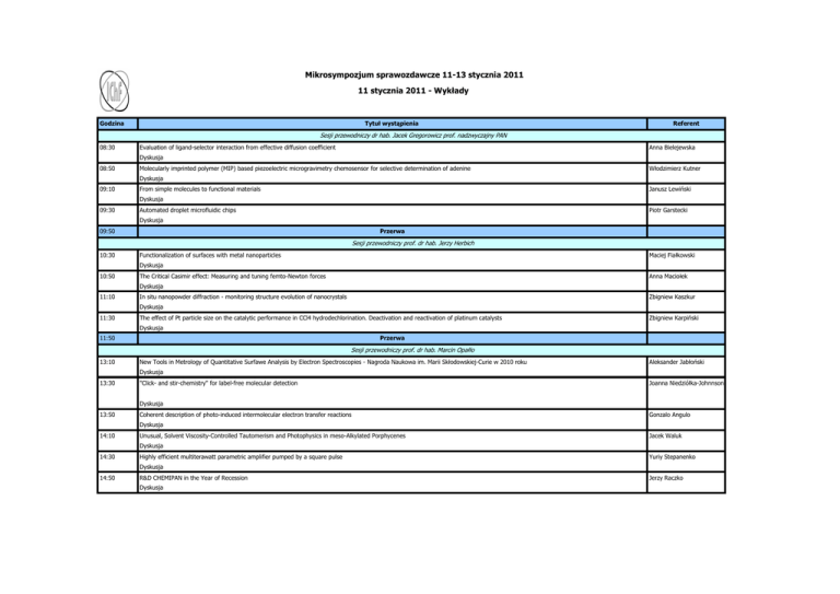 Mikrosympozjum sprawozdawcze 11-13 stycznia 2011 11 stycznia 2011 - Wykłady Godzina Tytuł wystąpienia Referent Sesji przewodniczy dr hab. Jacek Gregorowicz prof. nadzwyczajny PAN 08:30 Evaluation of ligand-selector interaction from effective diffusion coefficient Anna Bielejewska Dyskusja 08:50 Molecularly imprinted polymer (MIP) based piezoelectric microgravimetry chemosensor for selective determination of adenine Włodzimierz Kutner Dyskusja 09:10 From simple molecules to functional materials Janusz Lewiński Dyskusja 09:30 Automated droplet microfluidic chips Piotr Garstecki Dyskusja 09:50 Przerwa Sesji przewodniczy prof. dr hab. Jerzy Herbich 10:30 Functionalization of surfaces with metal nanoparticles Maciej Fiałkowski Dyskusja 10:50 The Critical Casimir effect: Measuring and tuning femto-Newton forces Anna Maciołek Dyskusja 11:10 In situ nanopowder diffraction - monitoring structure evolution of nanocrystals Zbigniew Kaszkur Dyskusja 11:30 The effect of Pt particle size on the catalytic performance in CCl4 hydrodechlorination. Deactivation and reactivation of platinum catalysts Zbigniew Karpiński Dyskusja 11:50 Przerwa Sesji przewodniczy prof. dr hab. Marcin Opałło 13:10 New Tools in Metrology of Quantitative Surfawe Analysis by Electron Spectroscopies - Nagroda Naukowa im. Marii Skłodowskiej-Curie w 2010 roku Aleksander Jabłoński Dyskusja 13:30 "Click- and stir-chemistry" for label-free molecular detection Joanna Niedziółka-Johnnson Dyskusja 13:50 Coherent description of photo-induced intermolecular electron transfer reactions Gonzalo Angulo Dyskusja 14:10 Unusual, Solvent Viscosity-Controlled Tautomerism and Photophysics in meso-Alkylated Porphycenes Jacek Waluk Dyskusja 14:30 Highly efficient multiterawatt parametric amplifier pumped by a square pulse Yuriy Stepanenko Dyskusja 14:50 R&D CHEMIPAN in the Year of Recession Dyskusja Jerzy Raczko