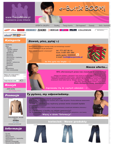 OFERTA SKLEPU Szukaj Twoje konto Jak kupować Zasady Info i kontakt SZUKAJ Dzwoń, pisz, pytaj :-) Gadżety Ona Bluzki Kr ótki rękaw Długi rękaw Sp ódnice Spodnie Sukienki Marynarki i żakiety Komplety Swetry Kurtki i płaszcze Bielizna Dodatki On Milusińscy Dla niemowląt Napisz nam swoją opinię o produkcie lub sklepie. Twoje imię lub e-mail Masz pytania dotyczące naszego butiku lub konkretnego ciuszka? Chcesz dowiedzieć się jak zamawiać? Masz ciekawe sugestie i propozycje? tel. /77/ 457 90 14 kom. 0-501 651 564 gadu-gadu: 5260820 e-mail: [email protected] ...bo kto pyta nie błądzi :-) Nasza oferta... 99% oferowanych przez nas ciuszków to pojedyncze egzemplarze. Dlatego nie zwklekaj z zakupami! Jutro mo że już nie by ć tego co upatrzyłaś dzisiaj. Nasza oferta to zarówno odzież nowa - najczęściej pochodząca z końcówek kolekcji jak i dokładnie wyselekcjonowana odzież używana. Mo żesz tu znaleźć odzież doskonałych światowych marek takich jak np.: Morgan, Hennes, Fishbone, a nawet takie rarytasy jak Jean Paul Gaultier, Giorgio Armani i wiele innych. Stale dodajemy nowy asortyment. ...jest pusty Zapraszamy Cię do częstych odwiedzin :-) Do kasy >>> Ty pytasz, my odpowiadamy. (?) Ile trwa dostarczenie przesyłki? Około 4-5 dni. Zamówiony towar wysyłany jest w ciągu 48 godzin. Poczta deklaruje dostarczenie przesyłek w ciągu 3 dni. (?) Jak sprawdzić, czy wybrany przeze mnie ciuszek będzie pasował? Sprawdź wymiary podane w opisie. Ka żdy prezentowany ciuszek jest dokładnie zmierzony i opisany. (?) Czy towary z butiku są objęte gwarancją? Tak. Każdemu klientowi dajemy 10 -dniową gwarancję na wszystkie zakupione u nas towary. Więcej w dziale "Informacje". COLLOSEUM, be żyk skin... 61.00zł 42.70zł wi ęcej promocji O nas Oferta Regulamin Zam ówienia i sposoby płatności Koszty przesyłki Gwarancja BOOM! kwiecień - Nowe produkty Sprawdź sw ój rozmiar Polityka prywatności BOOM!-TO MANIA Wasze opinie Kontakt Szybka wiadomość H&M B-B, jeans... Świetne jeansy o klasycznym kroju z pięcioma kieszeniami. Nogawki szerokie, proste. Świetne do każdej bluzki. Bardzo uniwersalny ciuch! 35.00zł H&M L.O.G.G., jeans... Świetne, markowe jeansy. Biodrówki z lekko rozszerzanymi nogawkami. Klasyczny krój z pięcioma kieszeniami. Świetnej jakości elastyczny jeans. Super spodnie na każdy dzień! 38.00zł HIGHLANDS jeans... Świetne, klasyczne jeansy z pięcioma kieszeniami. Lekko rozszerzone nogawki. Gruby jeans, świetnej jakości. Te spodnie będziesz nosić bez przerwy :-) 39.00zł L.O.G.G., super jeans... Rewelacyjne, markowe jeansy z dużymi kieszeniami z przodu i z tyłu. Biodrówki. Nogawki lekko rozszerzone. Nogawki z przodu modnie wytarte. Super! 49.00zł CRAZY WORLD, a'la skóra... Rewelacyjna imitacja skóry. Super bluzka dopasowana zaszewkami. Super ciuszek! 28.00zł HOT + SPICY, orange... Superowa bluzeczka na ramiączkach. Świetnej jakości materiał i super kolorek. Niezastąpiona latem! 19.00zł RAYBOOM, yellow... Sportowa, bawełniana bluzeczka z kołnierzykiem. Świetna na upały! 11.00zł PRETTY BODY, porn star... Super ciuszek dla odważnej dziewczyny. Z przodu brokatowy, odważny nadruk "PORN STAR". Rewelacyjna bluzeczka na dyskotekę! 28.00zł MISS PETROLIO... Fajna sukieneczka u dołu ozdobiona koralikowymi frędzelkami. Świetny ciuszek na imprezki i nie tylko. 32.00zł Copyright Domański 14 kwiecień 2004, 141533 wywołań od 17 lipiec 2003