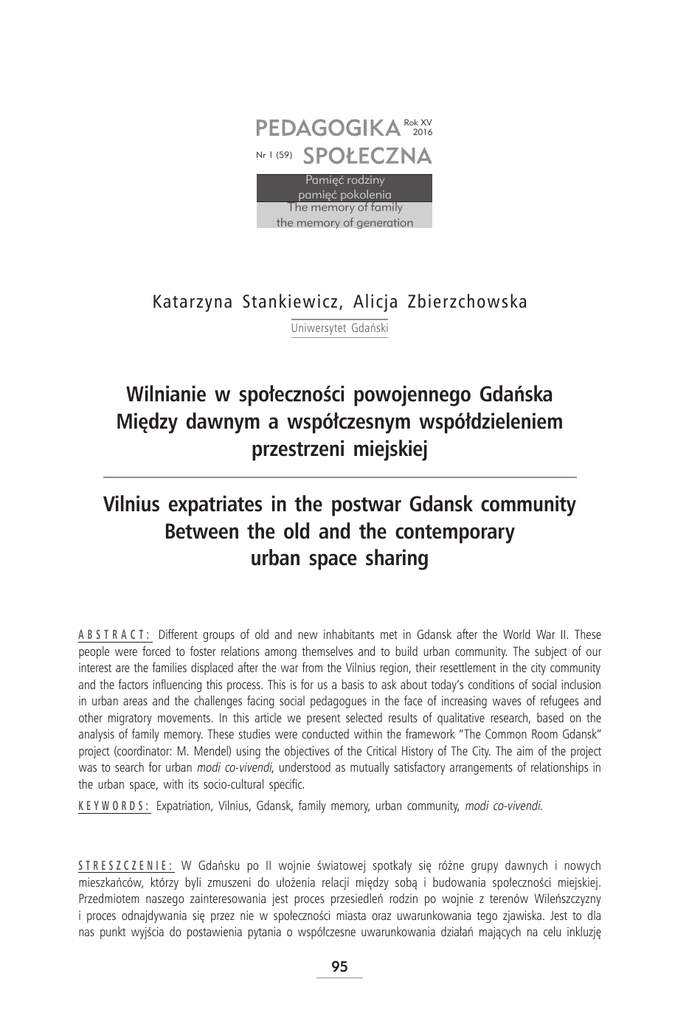Rok XV 2016 Nr 1 (59) Pamięć rodziny pamięć pokolenia The memory of family the memory of generation Katarzyna Stankiewicz, Alicja Zbierzchowska Uniwersytet Gdański Wilnianie w społeczności powojennego Gdańska Między dawnym a współczesnym współdzieleniem przestrzeni miejskiej Vilnius expatriates in the postwar Gdansk community Between the old and the contemporary urban space sharing A b s t r a c t : Different groups of old and new inhabitants met in Gdansk after the World War II. These people were forced to foster relations among themselves and to build urban community. The subject of our interest are the families displaced after the war from the Vilnius region, their resettlement in the city community and the factors influencing this process. This is for us a basis to ask about today’s conditions of social inclusion in urban areas and the challenges facing social pedagogues in the face of increasing waves of refugees and other migratory movements. In this article we present selected results of qualitative research, based on the analysis of family memory. These studies were conducted within the framework “The Common Room Gdansk” project (coordinator: M. Mendel) using the objectives of the Critical History of The City. The aim of the project was to search for urban modi co-vivendi, understood as mutually satisfactory arrangements of relationships in the urban space, with its socio-cultural specific. K e y w o r d s : Expatriation, Vilnius, Gdansk, family memory, urban community, modi co-vivendi. S t r e s z c z e n i e : W Gdańsku po II wojnie światowej spotkały się różne grupy dawnych i nowych mieszkańców, którzy byli zmuszeni do ułożenia relacji między sobą i budowania społeczności miejskiej. Przedmiotem naszego zainteresowania jest proces przesiedleń rodzin po wojnie z terenów Wileńszczyzny i proces odnajdywania się przez nie w społeczności miasta oraz uwarunkowania tego zjawiska. Jest to dla nas punkt wyjścia do postawienia pytania o współczesne uwarunkowania działań mających na celu inkluzję 95 Katarzyna Stankiewicz, Alicja Zbierzchowska społeczną w przestrzeni miejskiej oraz zadania stojące przed pedagogami społecznymi w obliczu nasilających się fal uchodźstwa i innych ruchów migracyjnych. W artykule przedstawiamy wybrane wyniki badań jakościowych, opierając się na analizie przekazów pamięci rodzinnej. Badania te prowadzone były w ramach projektu „Wspólny Pokój Gdańsk” (koordynator: Maria Mendel), wykorzystującego założenia Krytycznej Historii Miasta. Celem projektu było poszukiwanie miejskich modi co-vivendi, rozumianych jako układy satysfakcjonujących relacji międzyludzkich w przestrzeni miejskiej determinowanej społecznie i kulturowo. Słowa kluczowe: Ekspatriacja, Wilno, Gdańsk, pamięć rodzina, społeczność miejska, modi co-vivendi. Powojenny Gdańsk był swego rodzaju laboratorium procesów kształtowania się społeczności miejskiej. „Ludzie, którzy budowali swoje życie po wojnie w Gdańsku, robili to ze strzępków życia dawnego, w miejscu innym. Oswajali miejsce nowe w trudnych spotkaniach z innymi, w dialogu z przeszłością” (Mendel, Zbierzchowska 2010, s. 160). Ludność miasta uległa niemal całkowitej wymianie. W Gdańsku po II wojnie światowej spotkały się różne grupy dawnych i nowych mieszkańców, którzy byli zmuszeni do ułożenia relacji między sobą, jak również do odnalezienia się w trudnej powojennej rzeczywistości. Dawni gdańszczanie, przede wszystkich ci pochodzenia niemieckiego, stopniowo opuszczali miasto. Nowi osadnicy wkraczali natomiast do nieswoich mieszkań i domów, wychodzili na obce sobie dzielnice i ulice… Dzień po dniu poznawali przestrzeń nieznaną, naznaczoną innością kulturową i społeczną, która niewątpliwie na nich wpływała, kształtowała ich tożsamość i wyznaczała ramy działania. Jedną z ważnych grup, która w tych warunkach współtworzyła powojenną społeczność Gdańska, byli przesiedleńcy z Wilna i Wileńszczyzny. Staramy się odpowiedzieć na pytanie, jak rodziny wileńskie odnajdywały się w społeczności powojennego Gdańska i jakie były tego uwarunkowania1. Podejmując problem z przeszłości, jesteśmy jednocześnie zainteresowane współczesnym znaczeniem procesów migracyjnych dla budowania wspólnot miejskich w ogóle, ze szczególnym uwzględnieniem migracji przymusowych i uchodźstwa, będących ostatnio istotnym tematem. Nasze poszukiwania dotyczące przeszłości traktujemy równocześnie jako przyczynek do dyskusji nad tym, co decyduje o funkcjonowaniu współczesnej społeczności miejskiej. 1 W tym artykule podejmujemy jedynie wybrane wątki z zakresu tej tematyki, interesujące nas z perspektywy pedagogiki społecznej. Wyniki badań oraz tło historyczne zostaną przedstawione szerzej w tekście: K. Stankiewicz, A. Zbierzchowska, S. Bykowska (w przygotowaniu), Wileńska rodzina w społeczności Gdańska. Modi co-vivendi powojennego miasta, [w:] Gdańskie modi covivendi w perspektywie Krytycznej Historii Miasta, M. Mendel (red.). 96 Wilnianie w społeczności powojennego Gdańska... Komentarz metodologiczny W artykule przedstawiamy wyniki badań prowadzonych przez nas w ramach projektu Wspólny Pokój Gdańsk (zob. Stankiewicz i in. w przygotowaniu), kierowanego przez prof. Marię Mendel na Wydziale Nauk Społecznych Uniwersytetu Gdańskiego w latach 2013–2015. W ramach projektu powstał interdyscyplinarny zespół badaczy oraz animatorów społeczno-kulturalnych zainteresowanych gdańskimi modi co-vivendi, ujmowanymi w perspektywie historycznej i współczesnej, rozumianymi jako „różne w określonym czasie i kontekście – układy wzajemnie satysfakcjonujących relacji międzyludzkich zachodzących w zurbanizowanej przestrzeni, z jej specyfiką społeczno-kulturową” (Mendel w przygotowaniu). U podstaw pracy zespołu leży Krytyczna Historia Miasta, która stanowi twórcze przekształ