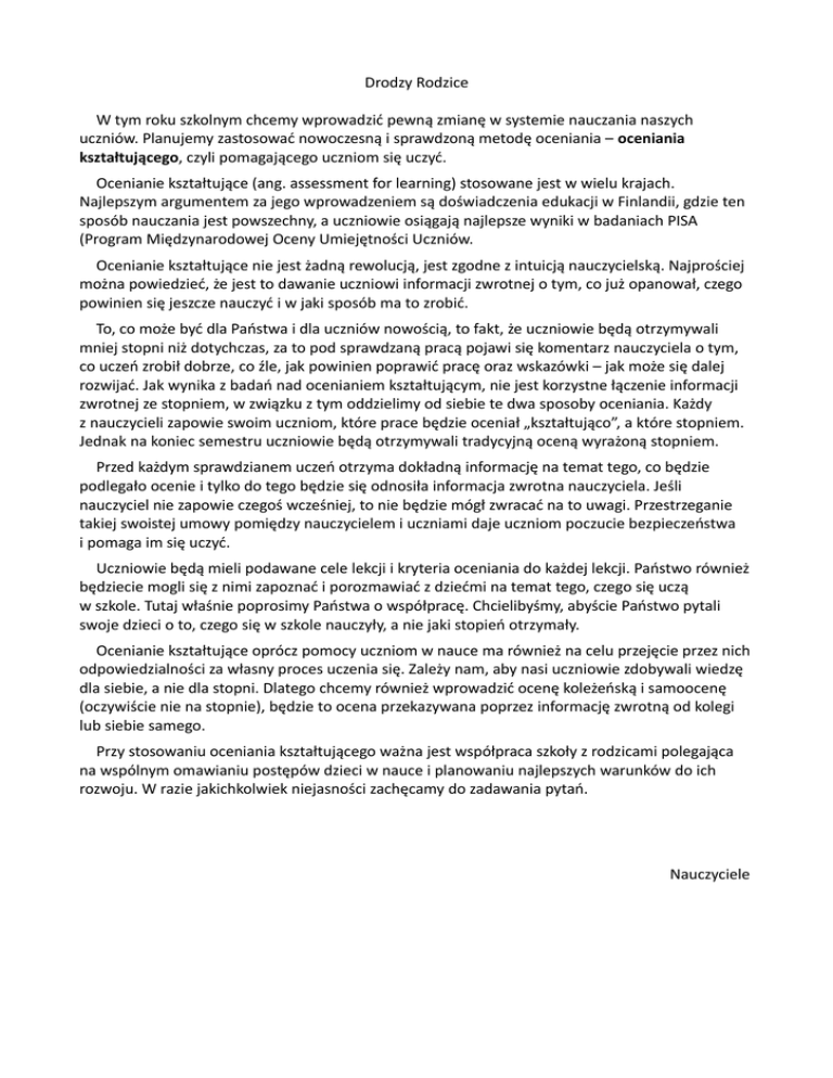 Drodzy Rodzice W tym roku szkolnym chcemy wprowadzić pewną zmianę w systemie nauczania naszych uczniów. Planujemy zastosować nowoczesną i sprawdzoną metodę oceniania – oceniania kształtującego, czyli pomagającego uczniom się uczyć. Ocenianie kształtujące (ang. assessment for learning) stosowane jest w wielu krajach. Najlepszym argumentem za jego wprowadzeniem są doświadczenia edukacji w Finlandii, gdzie ten sposób nauczania jest powszechny, a uczniowie osiągają najlepsze wyniki w badaniach PISA (Program Międzynarodowej Oceny Umiejętności Uczniów. Ocenianie kształtujące nie jest żadną rewolucją, jest zgodne z intuicją nauczycielską. Najprościej można powiedzieć, że jest to dawanie uczniowi informacji zwrotnej o tym, co już opanował, czego powinien się jeszcze nauczyć i w jaki sposób ma to zrobić. To, co może być dla Państwa i dla uczniów nowością, to fakt, że uczniowie będą otrzymywali mniej stopni niż dotychczas, za to pod sprawdzaną pracą pojawi się komentarz nauczyciela o tym, co uczeń zrobił dobrze, co źle, jak powinien poprawić pracę oraz wskazówki – jak może się dalej rozwijać. Jak wynika z badań nad ocenianiem kształtującym, nie jest korzystne łączenie informacji zwrotnej ze stopniem, w związku z tym oddzielimy od siebie te dwa sposoby oceniania. Każdy z nauczycieli zapowie swoim uczniom, które prace będzie oceniał „kształtująco”, a które stopniem. Jednak na koniec semestru uczniowie będą otrzymywali tradycyjną oceną wyrażoną stopniem. Przed każdym sprawdzianem uczeń otrzyma dokładną informację na temat tego, co będzie podlegało ocenie i tylko do tego będzie się odnosiła informacja zwrotna nauczyciela. Jeśli nauczyciel nie zapowie czegoś wcześniej, to nie będzie mógł zwracać na to uwagi. Przestrzeganie takiej swoistej umowy pomiędzy nauczycielem i uczniami daje uczniom poczucie bezpieczeństwa i pomaga im się uczyć. Uczniowie będą mieli podawane cele lekcji i kryteria oceniania do każdej lekcji. Państwo również będziecie mogli się z nimi zapoznać i porozmawiać z dziećmi na temat tego, czego się uczą w szkole. Tutaj właśnie poprosimy Państwa o współpracę. Chcielibyśmy, abyście Państwo pytali swoje dzieci o to, czego się w szkole nauczyły, a nie jaki stopień otrzymały. Ocenianie kształtujące oprócz pomocy uczniom w nauce ma również na celu przejęcie przez nich odpowiedzialności za własny proces uczenia się. Zależy nam, aby nasi uczniowie zdobywali wiedzę dla siebie, a nie dla stopni. Dlatego chcemy również wprowadzić ocenę koleżeńską i samoocenę (oczywiście nie na stopnie), będzie to ocena przekazywana poprzez informację zwrotną od kolegi lub siebie samego. Przy stosowaniu oceniania kształtującego ważna jest współpraca szkoły z rodzicami polegająca na wspólnym omawianiu postępów dzieci w nauce i planowaniu najlepszych warunków do ich rozwoju. W razie jakichkolwiek niejasności zachęcamy do zadawania pytań. Nauczyciele O ocenianiu kształtującym dla rodziców w przykładach (Na podstawie publikacji CEO autorstwa Danuty Sterny, elmo) Chcielibyśmy przekonać Państwa do oceniania kształtującego. Mamy przed sobą trudne zadanie z dwóch powodów: • • sama nazwa jest myląca – sugeruje, że chodzi tylko o ocenianie, wielu z Państwa już dawno skończyło szkołę i trudno będzie wrócić myślami do czasów szkolnych. Ocenianie kształtujące to zweryfikowanie dotychczasowych zasad nauczania, wyciągnięcie wniosków – jak się człowiek uczy najskuteczniej, co mu pomaga i jak to wykorzystywać. KROK PIERWSZY Nauczyciel matematyki prosi Was o znalezienie najmniejszej wspólnej wielokrotności liczb: 33 i 121, a następnie liczb 342 i 521. Sugeruje, że trzeba rozłożyć liczby na czynniki pierwsze. Załóżmy, że wiecie, o co chodzi, i zadanie wykonujecie w pocie czoła. Co czujecie? Sądzę, że większość z Was zapyta: Po co to robimy? Macie rację, trudno wykonywać zadanie, jeśli nie zna się celu. Dlatego OK wymaga, aby nauczyciel podał uczniom cel lekcji, i to w języku, który uczeń zrozumie. W przytoczonym przykładzie celem nauczyciela było dodawanie ułamków zwykłych, a pośrednio znajdowanie wspólnego mianownika dwóch ułamków. A teraz wyobraźcie sobie, że nauczyciel proponuje uczniom taki cel: Chcemy nauczyć się dodawać ułamki 5/33 do 4/121. Dalej wyjaśnia, że poszukujemy wspólnego mianownika dla 33 i 121 i dlatego uczymy się znajdywać najmniejszą wspólną wielokrotność. Wtedy prawdopodobnie Wasza frustracja osłabłaby. Wniosek – podajmy uczniom cele lekcji w języku dla nich zrozumiałym. KROK DRUGI Przypomnijcie sobie klasówkę z geografii dotyczącą Europy. Zapewne chcielibyście wiedzieć, czy klasówka będzie dotyczyła rzek, miast, czy może surowców naturalnych. Możliwe jest uzyskanie na ten temat konkretnej informacji. W ocenianiu kształtującym nauczyciel do każdej lekcji określa tak zwane nacobezu, czyli to, NA CO BĘdzie Zwracał Uwagę. Wierzcie mi, jest to możliwe, ale wymaga od nauczyciela wielkiej dyscypliny, bo zobowiązuje się on, że dotrzyma umowy i faktycznie będzie sprawdzał tylko to, co zapowiedział. W ocenianiu kształtującym informujemy uczniów, co będzie podlegało ocenie. Uczeń może sprawdzić z listą, czy dobrze przygotował się do sprawdzianu lub czy skorzystał właściwie z lekcji. Pewnie teraz zazdrościcie Państwo uczniowi prowadzonemu metodą OK, sami przecież chcielibyście dostawać od swojego szefa konkretne wskazówki dotyczące przeznaczonego dla Was zadania. KROK TRZECI Uczniowie (Wasze dzieci) wiedzą już, czego i po co będą się uczyć i co będzie sprawdzane. Ale jak ich zachęcić do uczenia się? To trudne zadanie dla nauczyciela. Tyle ciekawszych spraw jest na świecie, a tu każą szukać najmniejszej wspólnej wielokrotności jakichś liczb… Nuda! Pomyśl, jak Ty zachęciłbyś dzieci do teg