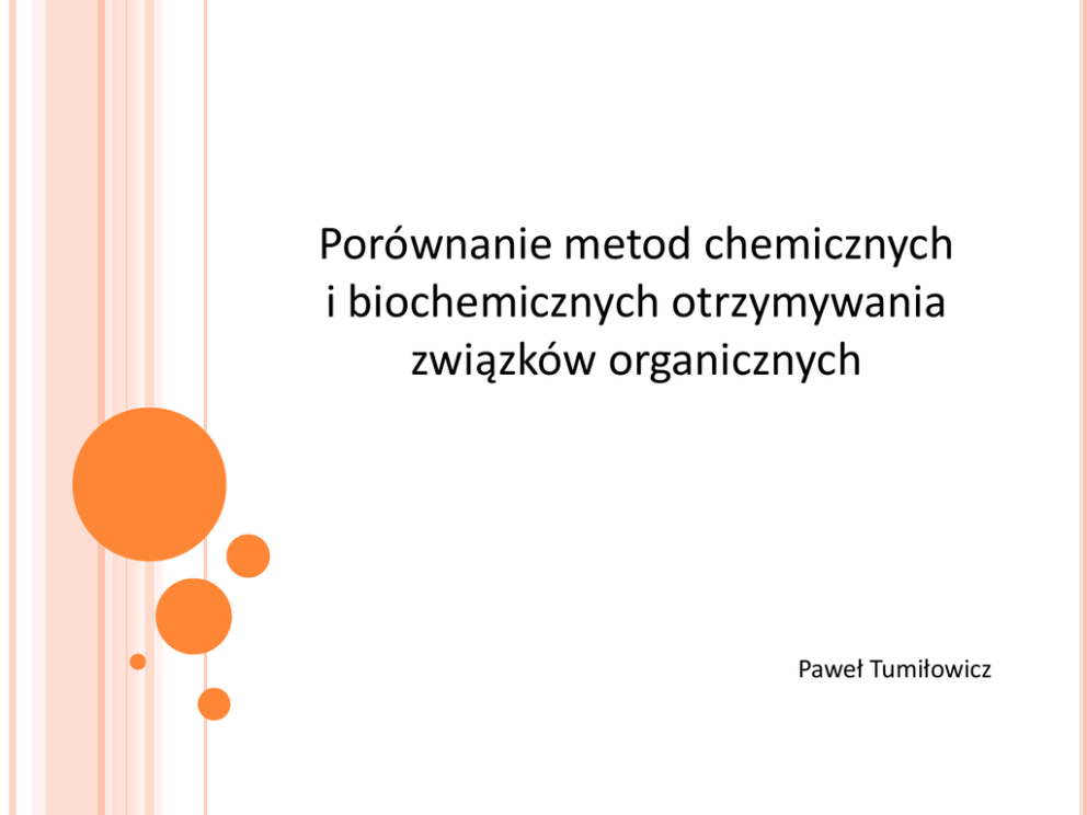 Porównanie metod chemicznych i biochemicznych otrzymywania związków organicznych Paweł Tumiłowicz Cechy METODY CHEMICZNE Dwa etapy procesu – pierwszy: synteza chemiczna (bądź ekstrakcja i/lub modyfikacja), drugi: oczyszczanie produktu. METODY BIOTECHNOLOGICZNE Zazwyczaj łagodne warunki reakcji. Małe zanieczyszczenie środowiska. Dwa etapy procesu – pierwszy: wytwarzanie związku przy pomocy mikroorganizmów; drugi: oczyszczanie. Przykłady związków produkowanych obydwoma metodami Alkohole (etanol, butanol, glicerol). Kwasy organiczne (octowy, cytrynowy, mlekowy, glukonowy). Witaminy. Hormony steroidowe. Ketony (aceton). Aminokwasy. Produkcja kwasu cytrynowego Porównanie koncepcji Jak go otrzymać? Izolacja z owoców. Metoda mikrobiologiczna (biotechnologiczna). Synteza chemiczna. Izolacja z owoców Metoda istotna do lat 30 XX wieku. Do otrzymania 1 kg kwasu zużywano 30 – 40 kg cytryn. Zawartość kwasu w cytrynie to około 8%. Jaka jest wydajność procesu? Izolacja z owoców – metoda laboratoryjna Roczna produkcja Początki wieku XX – 10 tys. ton (wszystko poprzez izolację z cytryn). Rok 1933 – 10 400 ton (z czego zaledwie 1800 ton z cytryn). Obecna produkcja (2004) – 1,4 mln. ton (znikoma część to produkcja z cytryn). Produkcja biotechnologiczna Wynik zakłóceń w metabolizmie mikroorganizmów. Najczęściej używane są selekcjonowane szczepy Aspergillus niger. Istotny skład medium hodowlanego. Metody hodowli Hodowla w podłożach stałych (marginalna). Hodowla powierzchniowa (klasyczna). Hodowla wgłębna. Wydzielanie i oczyszczanie kwasu cytrynowego Pełna synteza chemiczna kwasu cytrynowego Wiele patentów. Różne substraty: izotetralina, kwas szczawiooctowy, kwas maleinowy, kwas fumarowy, aceton i dwutlenek węgla… Kwas cytrynowy z izotetraliny Hormony steroidowe Zastosowanie biotransformacji Hormony steroidowe Związki o budowie opartej na czteropierścieniowym układzie steranu. Androgeny (np. testosteron), estrogeny (np. estradiol), gestageny (np. progesteron), kortykosteroidy (np. kortyzon). Metody otrzymywania: syntetyczne oraz półsyntetyczne (w których ważną rolę odgrywają biotransformacje). Wykorzystanie biotransformacji w produkcji hormonów steroidowych. Wprowadzenie grupy hydroksylowej w pozycję C-11 steranu (Rhizopus). Wprowadzenie grupy hydroksylowej w pozycję C-16 (Streptomyces). Uwodornienie pierścienia w pozycji C-1 (Corynebacterium simplex). Redukcja grupy ketonowej przy C-17 lub C-20 (Saccharomyces). Otrzymywanie kortyzonu Zastosowanie przemian biochemicznych znacznie upraszcza produkcję. Dla przykładu otrzymanie kortyzonu wymaga użycia w metodzie chemicznej kwasu dezoksycholowego i 26 przemian. Wykorzystanie biotransformacji umożliwia zastosowanie tańszych surowców (diosgeniny lub stigmasterolu) i ograniczenie liczby przemian do 12. Produkcja kwasu mlekowego Parę słów o enancjomerach Kwas mlekowy Nazwa systematyczna: kwas 2-hydroksypropionowy; • posiada jeden węgiel asymetryczny; • enancjomer L tworzy się w mięśniach szkieletowych podczas pracy fizycznej – przekształcany jest następnie w kwas cytrynowy, a potem spalany do CO2 i wody w cyklu kwasu cytrynowego; • substancją konserwującą dostępną w handlu jest racemat L-kwasu i D-kwasu mlekowego; •mikrobiologicznie kwas mlekowy otrzymuje się poprzez fermentację mlekową bakterii Lactobacillus. Właściwości fizyczne: • klarowna lepka ciecz ciemnożółta lub przezroczysta; •ciężar właściwy: 1,16 g/cm3; •rozpuszcza się w wodzie w każdych proporcjach; Zastosowanie Przemysł spożywczy i rolnictwo: Produkcja kiszonek Mleczarstwo Piekarnictwo Przetwórstwo mięsne Środek konserwujący Lecznictwo weterynaryjne Przemysł farmaceutyczny i chemiczny: Farmaceutyki zawierające mleczan wapnia i żelaza Regulator pH Środki dezynfekujące Składnik kosmetyków Techniczny: Biodegradowalne tworzywa sztuczne – polilaktyd Garbarstwo i przemysł tekstylny Produkcja dysków komputerowych – polilaktyd z kukurydzy (Sanyo Mavic Media) Lakierowanie samochodów – ustalanie konsystencji farb i pigmentów (znów polilaktyd!) Historia 1780 r. – odkrycie kwasu mlekowego w skwaśniałym mleku przez szwedzkiego chemika C. W. Scheele 1856 r. – odkrycie przez L. Pasteura bakterii Lactobacillus produkujących kwas mlekowy 1881 r. – pierwszy patent dotyczący produkcji kwasu mlekowego w wyniku fermentacji przez A. Avery’ego (Stany Zjednoczone) 1895 r. – pierwsza przemysłowa produkcja kwasu mlekowego przez niemiecką firmę farmaceutyczną Boehringer Ingelheim 1933 r. – pierwsze patenty dotyczące chemicznej produkcji kwasu mlekowego Lata 50 – pierwsza komercyjna produkcja syntetycznego kwasu mlekowego w Japonii Światowa produkcja kwasu mlekowego wynosi ponad 30 tys. ton/rok z czego 30% produkowane jest syntetycznie. Syntetyczny kwas mlekowy Kwas mlekowy otrzymuje się syntetycznie przez chlorowanie kwasu propanowego a następnie podstawienie atomu chloru grupą hydroksylową. Produktem jest racemat. Fermentacja mlekowa Fermentację mlekową przeprowadza się w warunkach beztlenowych w temperaturze 45-50˚C . Mikroorganizmy: Lactobacillus (np. L. delbrueckii ssp. bulgaricus) Lactococcus Streptobacterium Pożywka: źródło węgla 10 – 13%: pożywki syntetyczne z sacharozą; źródło azotu: mieszanina aminokwasów, sole amonowe; biostymulatory: kiełki słodowe, zarodki żytnie lub pszenne, autolizaty drożdżowe; makro- i mikroelementy. Oczyszczanie kwasu mlekowego Odbarwianie (sorpcja) na węglu aktywnym i krystalizacja mleczanu wapnia lub cynku, następnie uwalnianie kwasu za pomocą H2SO4. Ekstrakcja eterem. Przeciwprądowa estryfikacja metodą ciągłą. Destylacja (w próżni lub pod ciśnieniem atmosferycznym w obecności przegrzanej pary). Chromatografia jonowymienna. Elektrodializa. Hodowle ciągłe Wydajność: 12 – 22 g/dm3∙h Recyrkulacyjny bioreaktor membranowy – oczyszczanie cieczy pofermentacyjnej: adsorpcja kwasu 