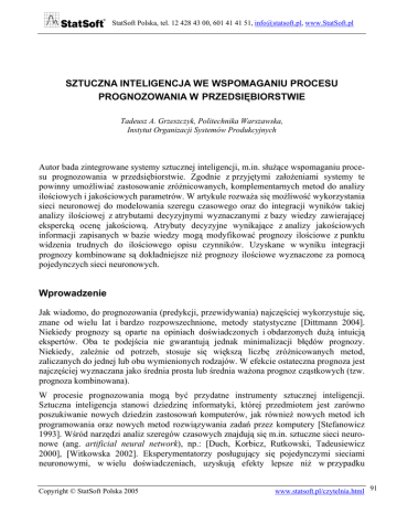 ® StatSoft Polska, tel. 12 428 43 00, 601 41 41 51, [email protected], www.StatSoft.pl SZTUCZNA INTELIGENCJA WE WSPOMAGANIU PROCESU PROGNOZOWANIA W PRZEDSIĘBIORSTWIE Tadeusz A. Grzeszczyk, Politechnika Warszawska, Instytut Organizacji Systemów Produkcyjnych Autor bada zintegrowane systemy sztucznej inteligencji, m.in. służące wspomaganiu procesu prognozowania w przedsiębiorstwie. Zgodnie z przyjętymi założeniami systemy te powinny umożliwiać zastosowanie zróżnicowanych, komplementarnych metod do analizy ilościowych i jakościowych parametrów. W artykule rozważa się możliwość wykorzystania sieci neuronowej do modelowania szeregu czasowego oraz do integracji wyników takiej analizy ilościowej z atrybutami decyzyjnymi wyznaczanymi z bazy wiedzy zawierającej ekspercką ocenę jakościową. Atrybuty decyzyjne wynikające z analizy jakościowych informacji zapisanych w bazie wiedzy mogą modyfikować prognozy ilościowe z punktu widzenia trudnych do ilościowego opisu czynników. Uzyskane w wyniku integracji prognozy kombinowane są dokładniejsze niż prognozy ilościowe wyznaczone za pomocą pojedynczych sieci neuronowych. Wprowadzenie Jak wiadomo, do prognozowania (predykcji, przewidywania) najczęściej wykorzystuje się, znane od wielu lat i bardzo rozpowszechnione, metody statystyczne [Dittmann 2004]. Niekiedy prognozy są oparte na opiniach doświadczonych i obdarzonych dużą intuicją ekspertów. Oba te podejścia nie gwarantują jednak minimalizacji błędów prognozy. Niekiedy, zależnie od potrzeb, stosuje się większą liczbę zróżnicowanych metod, zaliczanych do jednej lub obu wymienionych rodzajów. W efekcie ostateczna prognoza jest najczęściej wyznaczana jako średnia prosta lub średnia ważona prognoz cząstkowych (tzw. prognoza kombinowana). W procesie prognozowania mogą być przydatne instrumenty sztucznej inteligencji. Sztuczna inteligencja stanowi dziedzinę informatyki, której przedmiotem jest zarówno poszukiwanie nowych dziedzin zastosowań komputerów, jak również nowych metod ich programowania oraz nowych metod rozwiązywania zadań przez komputery [Stefanowicz 1993]. Wśród narzędzi analiz szeregów czasowych znajdują się m.in. sztuczne sieci neuronowe (ang. artificial neural network), np.: [Duch, Korbicz, Rutkowski, Tadeusiewicz 2000], [Witkowska 2002]. Eksperymentatorzy posługujący się pojedynczymi sieciami neuronowymi, w wielu doświadczeniach, uzyskują efekty lepsze niż w przypadku Copyright © StatSoft Polska 2005 www.statsoft.pl/czytelnia.html 91 ® StatSoft Polska, tel. 12 428 43 00, 601 41 41 51, [email protected], www.StatSoft.pl zastosowania innych metod statystycznych. Występują jednak badania, które dowodzą, że niekiedy walory tych ostatnich metod przeważają nad korzyściami, wynikającymi z zastosowania pojedynczych sieci neuronowych (np. [Tang, Almeida, Fishwick 1991]). Nie ulega wątpliwości, że wszystkie wymienione wyżej rodzaje metod nie sprawdzają się, gdy występują różne nietypowe sytuacje, np. w przypadku podjęcia dużej kampanii reklamowej, promocji określonego towaru lub usługi itp. Jednym z możliwych rozwiązań tego problemu może być formułowanie prognoz w oparciu o zarówno ilościowe, jak i jakościowe metody prognozowania. Celowe jest wykorzystywanie zintegrowanych (zespolonych) metod prognozowania, bazujących na ilościowych analizach danych historycznych oraz na subiektywnych ocenach ekspertów (przedsiębiorców). Atrybuty decyzyjne wynikające z analizy jakościowych informacji zapisanych w bazie wiedzy mogą modyfikować prognozy ilościowe z punktu widzenia trudnych do ilościowego opisu czynników. Uzyskane w wyniku integracji prognozy kombinowane są zwykle dokładniejsze niż prognozy ilościowe. W przypadku (tworzonych dla różnych zastosowań) metod zintegrowanych (hybrydowych) łączy się różne podejścia tak, aby funkcjonowały w jednym spójnym systemie, np. [Lingras 1998], [Sankar, Polkowski, Skowron 2004], [Szczuka 1998], [Kuo 2001]. Umiejętna integracja kilku metod, w celu stworzenia jednej zintegrowanej metody prognozowania, pozwala na przejmowanie najlepszych cech pojedynczych systemów oraz na eliminowanie ich wad. Autor zdecydował się na badanie zespolonych systemów równoległych, które charakteryzują się niezależnym działaniem wchodzących w jego skład różnych podsystemów, wśród których mogą występować podsystemy analizy zarówno ilościowej, jak i jakościowej. Dużą zaletą zespolonych systemów (zarówno szeregowych, jak i równoległych) jest możliwość kolejnej indywidualnej realizacji stosunkowo prostych podsystemów. Umożliwia to łatwiejszą realizację w porównaniu z systemami hybrydowymi (w których nie można wyodrębnić podsystemów funkcjonujących tylko w jeden określony sposób). Stosowanie zespolonych systemów równoległych pozwala na równoległą analizę danych pochodzących z niezależnych od siebie źródeł. Źródła te mogą mieć również odmienny charakter, tzn. ilościowy i jakościowy. W rozpatrywanym przykładzie wyniki ilościowe oznaczają konkretne wartości sprzedaży. Natomiast jakościowa analiza może się opierać np. na opiniach ekspertów. Dzięki równoległemu połączeniu obu podsystemów można wykorzystywać dwie, nawet całkowicie różne, metody analizy, np. sieci neuronowe oraz metodę wykorzystującą teorię zbiorów przybliżonych (szerzej na ten temat w pracach: [Grzeszczyk 2000, 2005]). Końcowy wynik uzyskuje się w procesie integracji wyników dwóch podsystemów. W najprostszym przypadku proces integracji może polegać na wyznaczaniu średniej ważonej ilościowych wyników obu podsystemów. Dotyczyć to jednak może wyłącznie podsystemów analizy ilościowej. W rozpatrywanym przypadku zdecydowano się na użycie sieci neuronowej. Jest to niezbędne, ponieważ integrowane wyniki mają różny charakter. Z jednej strony bowiem jest to konkretna ilościowa prognoza