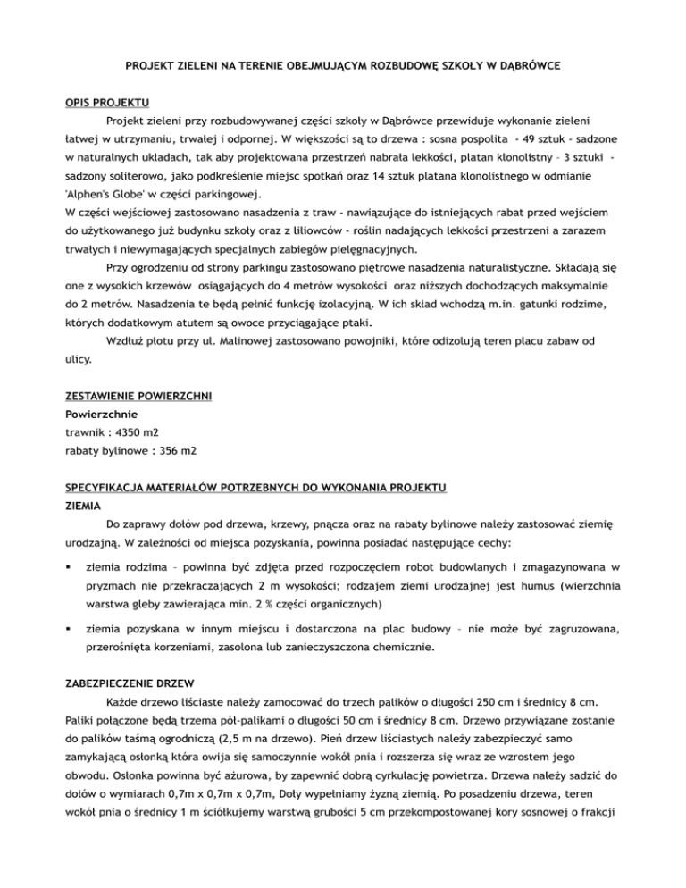 PROJEKT ZIELENI NA TERENIE OBEJMUJĄCYM ROZBUDOWĘ SZKOŁY W DĄBRÓWCE OPIS PROJEKTU Projekt zieleni przy rozbudowywanej części szkoły w Dąbrówce przewiduje wykonanie zieleni łatwej w utrzymaniu, trwałej i odpornej. W większości są to drzewa : sosna pospolita - 49 sztuk - sadzone w naturalnych układach, tak aby projektowana przestrzeń nabrała lekkości, platan klonolistny – 3 sztuki sadzony soliterowo, jako podkreślenie miejsc spotkań oraz 14 sztuk platana klonolistnego w odmianie 'Alphen's Globe' w części parkingowej. W części wejściowej zastosowano nasadzenia z traw - nawiązujące do istniejących rabat przed wejściem do użytkowanego już budynku szkoły oraz z liliowców - roślin nadających lekkości przestrzeni a zarazem trwałych i niewymagających specjalnych zabiegów pielęgnacyjnych. Przy ogrodzeniu od strony parkingu zastosowano piętrowe nasadzenia naturalistyczne. Składają się one z wysokich krzewów osiągających do 4 metrów wysokości oraz niższych dochodzących maksymalnie do 2 metrów. Nasadzenia te będą pełnić funkcję izolacyjną. W ich skład wchodzą m.in. gatunki rodzime, których dodatkowym atutem są owoce przyciągające ptaki. Wzdłuż płotu przy ul. Malinowej zastosowano powojniki, które odizolują teren placu zabaw od ulicy. ZESTAWIENIE POWIERZCHNI Powierzchnie trawnik : 4350 m2 rabaty bylinowe : 356 m2 SPECYFIKACJA MATERIAŁÓW POTRZEBNYCH DO WYKONANIA PROJEKTU ZIEMIA Do zaprawy dołów pod drzewa, krzewy, pnącza oraz na rabaty bylinowe należy zastosować ziemię urodzajną. W zależności od miejsca pozyskania, powinna posiadać następujące cechy: ziemia rodzima – powinna być zdjęta przed rozpoczęciem robot budowlanych i zmagazynowana w pryzmach nie przekraczających 2 m wysokości; rodzajem ziemi urodzajnej jest humus (wierzchnia warstwa gleby zawierająca min. 2 % części organicznych) ziemia pozyskana w innym miejscu i dostarczona na plac budowy – nie może być zagruzowana, przerośnięta korzeniami, zasolona lub zanieczyszczona chemicznie. ZABEZPIECZENIE DRZEW Każde drzewo liściaste należy zamocować do trzech palików o długości 250 cm i średnicy 8 cm. Paliki połączone będą trzema pół-palikami o długości 50 cm i średnicy 8 cm. Drzewo przywiązane zostanie do palików taśmą ogrodniczą (2,5 m na drzewo). Pień drzew liściastych należy zabezpieczyć samo zamykającą osłonką która owija się samoczynnie wokół pnia i rozszerza się wraz ze wzrostem jego obwodu. Osłonka powinna być ażurowa, by zapewnić dobrą cyrkulację powietrza. Drzewa należy sadzić do dołów o wymiarach 0,7m x 0,7m x 0,7m, Doły wypełniamy żyzną ziemią. Po posadzeniu drzewa, teren wokół pnia o średnicy 1 m ściółkujemy warstwą grubości 5 cm przekompostowanej kory sosnowej o frakcji 10-30 mm. MATERIAŁY POTRZEBNE DO SADZENIA KRZEWÓW Wysokie krzewy sadzimy w doły o wymiarach 50cm x 50cm x 50 cm, doły wypełniamy żyzną ziemią, teren wokół o średnicy 1 m ściółkujemy warstwą grubości 5 cm przekompostowanej kory sosnowej o frakcji 10-30 mm. Niskie krzewy sadzimy w doły o wymiarach 30cm x 30cm x 30 cm, doły wypełniamy żyzną ziemią, teren wokół o średnicy 1 m ściółkujemy warstwą grubości 5 cm przekompostowanej kory sosnowej o frakcji 10-30 mm. MATERIAŁY POTRZEBNE DO WYKONANIA RABAT BYLINOWYCH Byliny (trawy i liliowce) sadzone będą na rabatach wypełnionych na 20 cm głębokości żyzną ziemią. Ziemia przykryta zostanie agrowłókniną czarną:P 50. Po posadzeniu roślin na rabatę wysypana zostanie przekompostowana kora sosnowa o frakcji 10-30 mm warstwą grubości 5 cm. MATERIAŁY POTRZEBNE DO SADZENIA PNĄCZY Pnącza sadzimy w doły o wymiarach 60cm x 60cm x 60cm. Na spód nasypujemy 10 cm warstwę żwiru. Resztę dołu wypełniamy żyzną ziemią. Tak przygotowany dół zabezpieczamy impregnowanym rollborderem sosnowym o wysokości 30 cm. Rollborder wkopujemy do połowy wysokości na granicy przygotowanego dołu. Rollborder ma uchronić pnącza przed ewentualnym uszkodzeniem przy koszeniu trawy. ZESTAWIENIE MATERIAŁÓW materiał ilość jednostka paliki do mocowania drzew 250 cm; śr 8 51 szt. pół paliki 50 cm ; śr 8 51 szt. taśma mocująca 43 mb osłonka 17 szt. żyzna ziemia 22 m3 kora sosnowa 2,6 m3 żyzna ziemia 2,8 m3 kora sosnowa 1,5 m3 żyzna ziemia 71 m3 włóknina P 50 356 m3 kora sosnowa 18 m3 Żwir 0,036m3/roślinę 0,8 m3 żyzna ziemia 0,18 m3/ roślinę 4,1 m3 Rollborder 1,8 m dł / roślinę 41,4 mb do sadzenia drzew liściastych : do sadzenia drzew wszystkich : do sadzenia krzewów : do wykonania rabat : do sadzenia pnączy : SPECYFIKACJA MATERIAŁU ROŚLINNEGO DRZEWA I KRZEWY Sadzonki powinny być właściwie oznaczone (nazwa łacińska, forma, wybór, wysokość pnia). Sadzonki powinny być prawidłowo uformowane i charakteryzować się następującymi cechami: pąk szczytowy przewodnika powinien być wyraźnie uformowany, przyrost poprzedniego roku powinien wyraźnie i prosto przedłużać prosty przewodnik, system korzeniowy powinien być skupiony i prawidłowo rozwinięty (na korzeniach szkieletowych występują liczne korzenie drobne), u roślin sadzonych z bryłą korzeniową, bryła powinna być prawidłowo uformowana i nie uszkodzona, pędy korony u drzew i krzewów nie powinny być przycięte, chyba że jest to cięcie formujące, pędy boczne korony drzewa powinny być równomiernie rozmieszczone, blizny na przewodniku powinny być dobrze zarośnięte, Wady niedopuszczalne drzew: silne uszkodzenia mechaniczne roślin, odrosty podkładki poniżej miejsca szczepienia, ślady żerowania szkodników, oznaki chorobowe, zwiędnięcie i pomarszczenie kory na korzeniach i częściach naziemnych, martwice i pęknięcia kory, uszkodzenie pąka szczytowego przewodnika, dwupędowe korony drzew formy piennej, uszkodzenie lub przesuszenie bryły korzeniowej, złe zrośnięcie odmiany szczepionej z podkładką. Drzewa zastosowane w projekcie lp . Nazw