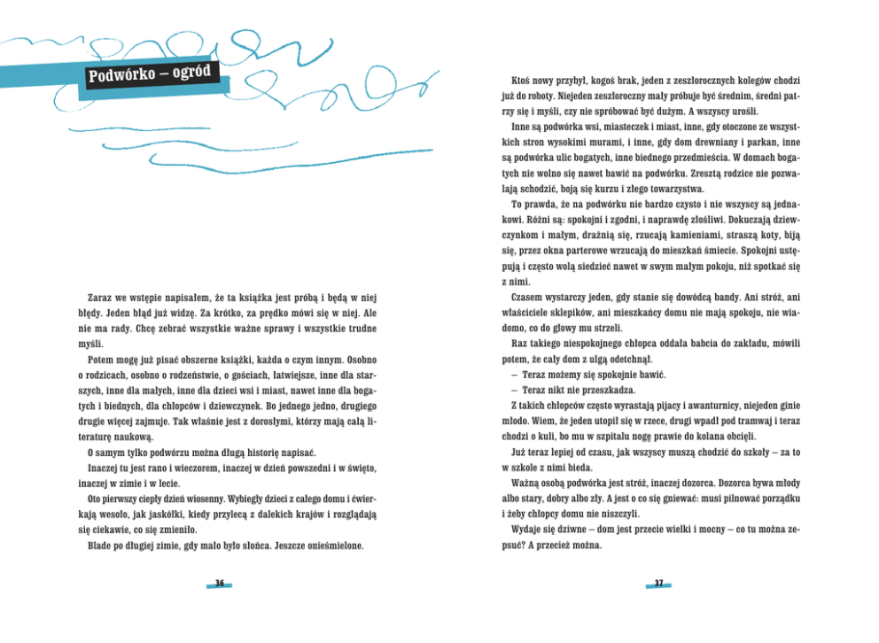 Podwórko – ogród Ktoś nowy przybył, kogoś brak, jeden z zeszłorocznych kolegów chodzi już do roboty. Niejeden zeszłoroczny mały próbuje być średnim, średni patrzy się i myśli, czy nie spróbować być dużym. A wszyscy urośli. Inne są podwórka wsi, miasteczek i miast, inne, gdy otoczone ze wszystkich stron wysokimi murami, i inne, gdy dom drewniany i parkan, inne są podwórka ulic bogatych, inne biednego przedmieścia. W domach bogatych nie wolno się nawet bawić na podwórku. Zresztą rodzice nie pozwalają schodzić, boją się kurzu i złego towarzystwa. To prawda, że na podwórku nie bardzo czysto i nie wszyscy są jednakowi. Różni są: spokojni i zgodni, i naprawdę złośliwi. Dokuczają dziewczynkom i małym, drażnią się, rzucają kamieniami, straszą koty, biją się, przez okna parterowe wrzucają do mieszkań śmiecie. Spokojni ustępują i często wolą siedzieć nawet w swym małym pokoju, niż spotkać się z nimi. Zaraz we wstępie napisałem, że ta książka jest próbą i będą w niej Czasem wystarczy jeden, gdy stanie się dowódcą bandy. Ani stróż, ani błędy. Jeden błąd już widzę. Za krótko, za prędko mówi się w niej. Ale właściciele sklepików, ani mieszkańcy domu nie mają spokoju, nie wia- nie ma rady. Chcę zebrać wszystkie ważne sprawy i wszystkie trudne domo, co do głowy mu strzeli. Raz takiego niespokojnego chłopca oddała babcia do zakładu, mówili myśli. Potem mogę już pisać obszerne książki, każda o czym innym. Osobno potem, że cały dom z ulgą odetchnął. o rodzicach, osobno o rodzeństwie, o gościach, łatwiejsze, inne dla star- – Teraz możemy się spokojnie bawić. szych, inne dla małych, inne dla dzieci wsi i miast, nawet inne dla boga- – Teraz nikt nie przeszkadza. tych i biednych, dla chłopców i dziewczynek. Bo jednego jedno, drugiego Z takich chłopców często wyrastają pijacy i awanturnicy, niejeden ginie drugie więcej zajmuje. Tak właśnie jest z dorosłymi, którzy mają całą li- młodo. Wiem, że jeden utopił się w rzece, drugi wpadł pod tramwaj i teraz teraturę naukową. chodzi o kuli, bo mu w szpitalu nogę prawie do kolana obcięli. O samym tylko podwórzu można długą historię napisać. Inaczej tu jest rano i wieczorem, inaczej w dzień powszedni i w święto, Już teraz lepiej od czasu, jak wszyscy muszą chodzić do szkoły – za to w szkole z nimi bieda. Ważną osobą podwórka jest stróż, inaczej dozorca. Dozorca bywa młody inaczej w zimie i w lecie. Oto pierwszy ciepły dzień wiosenny. Wybiegły dzieci z całego domu i ćwierkają wesoło, jak jaskółki, kiedy przylecą z dalekich krajów i rozglądają albo stary, dobry albo zły. A jest o co się gniewać: musi pilnować porządku i żeby chłopcy domu nie niszczyli. Wydaje się dziwne – dom jest przecie wielki i mocny – co tu można ze- się ciekawie, co się zmieniło. Blade po długiej zimie, gdy mało było słońca. Jeszcze onieśmielone. 36 psuć? A przecież można. 37 Kawałkiem żelaza tłuką w ścianę i mur (tynk) odbijają albo brudzą i rysują. Na ścianach wiszą rynny blaszane, przez które deszcz spływa z dachu. Siadają albo skaczą na rynny i blacha się zgina. Jest kran, to odkręcają i wodę leją, a gospodarz za wodę płaci magistratowi. W małych mieszkaniach nie ma ustępów, wszyscy muszą na podwórko schodzić. Mały się śpieszy albo wieczorem się boi, więc koło drzwi na podłogę zrobi. Czasem chłopcom potrzebne do zabawy kamienie albo chcą zrobić dołek, więc wyrywają bruk. Gospodarz się gniewa, że dom świeżo malowany, a już znów brudno, a policja pisze papier, że jest nieporządek, i karę zapisuje, a nawet areszt. Ledwo zamiótł schody i podwórko, znów papiery, patyki i słoma. Wreszcie krzyki. Czasem gospodarz domu mieszka gdzie indziej, a czasem tu; albo administrator i rządca. Albo ktoś jest chory, więc prosi o spokój. Wiec dozorca pędzi dzieci z podwórka miotłą albo pasem, wymyśla i przeklina, a chłopcy w nogi, w śmiech. To gniewa przecież. Na podwórku szkolnym przerwa trwa kilka minut, a tu cały dzień głośno, w szkole nie ma bardzo małych i bardzo dużych, a tu są wszyscy. Więc nic dziwnego, że dozorca nie bardzo wie, a wszystkich nazywa łobuzami i obije pierwszego, który mu się nawinął i nie zdążył uciec. Jednego mama sama zachęca: – Idź, polataj, idź, pobaw się, duszno w domu. Drugiemu niechętnie i tylko czasem pozwala. – Tylko wracaj zaraz. Butów nie drzyj. Nie baw się z łobuzami. I wypytuje się, co robił, żeby się nie zepsuł. Teraz już coraz więcej ogrodów i parków. Dawniej tego nie było, w bra- rię napisać. a długą histo ożn o podwórzu m O samym tylk eń powszedni zi d w ej cz a in orem, t rano i wiecz Inaczej tu jes cie. w zimie i w le ej cz a in , to ię i w św mie ogrodu stał policjant i nie wpuszczał dzieci biednie ubranych. Dawniej ogrody były dla zamożnych i bogatych, i nawet nie bardzo dla dzieci. Nie było boisk i placów, nie wolno było grać w piłkę na wąskich alejkach. Jak 39 piłka potoczyła się na trawnik, trzeba się było rozglądać, czy nie widzi stróż ogrodowy, i pędzić co tchu. A przykro, gdy z daleka kijem pogroził. W ogrodzie jest i studnia, i klozet, i weranda, gdzie można się schronić przed deszczem. Są drzewa cieniste i sadzawka z łabędziami. Aleje równe i podlane, żeby nie było kurzu. Wszystko to nie od razu ludzie wymyślili, a i teraz coraz coś przybywa. Na przykład muzyka. Już za granicą są w ogrodach ławki, wygodne dla młodszych, są placyki dla dzieci, które zabłądziły. Starszy zna ogród, a dla małego – to jak las olbrzymi. Trzeba pilnować, wołać: – Nie odchodź, nie oddalaj się, baw się bliżej. Dziecko się niecierpliwi, a pani się gniewa. Aż naprawdę zabłądził. Boi się, płacze, nie wie, dokąd iść, a nikt nie wie, dokąd odprowadzić. Dziecko szuka i mama niespokojna szuka, nawet długo.