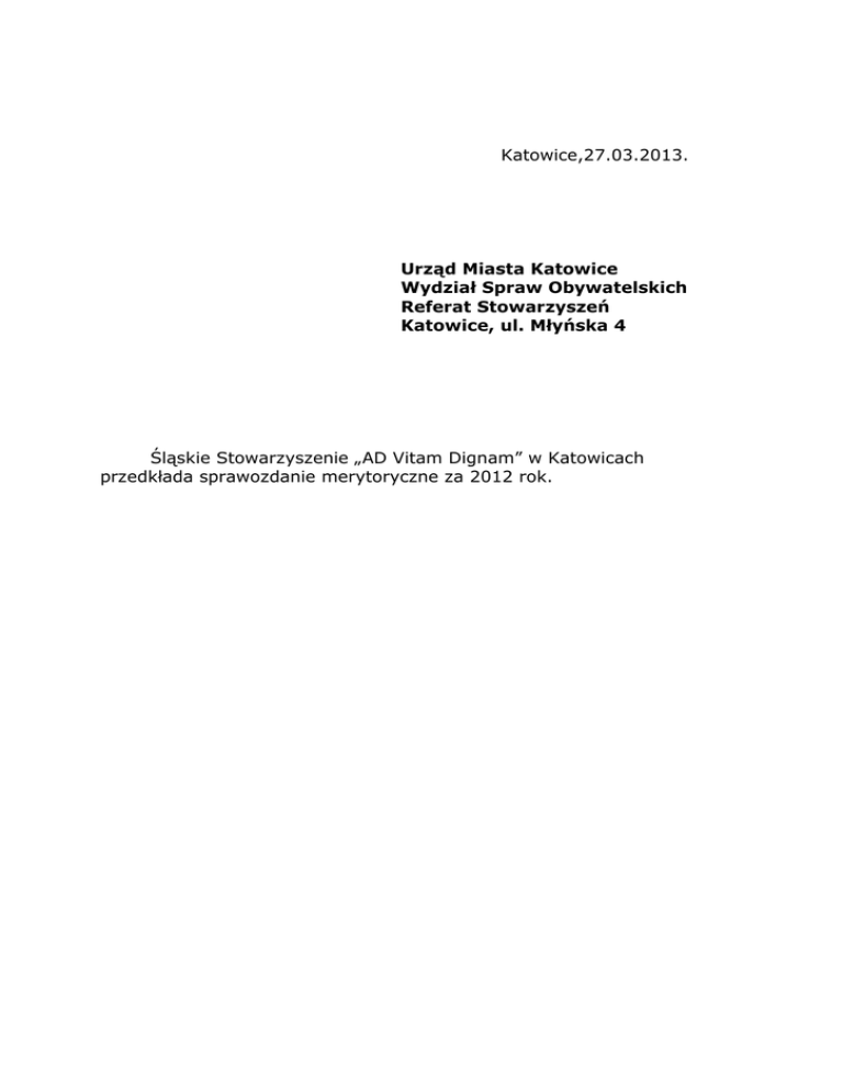 Katowice,27.03.2013. Urząd Miasta Katowice Wydział Spraw Obywatelskich Referat Stowarzyszeń Katowice, ul. Młyńska 4 Śląskie Stowarzyszenie „AD Vitam Dignam” w Katowicach przedkłada sprawozdanie merytoryczne za 2012 rok. Śląskie Stowarzyszenie „Ad Vitam Dignam” w Katowicach 40 – 430 Katowice, ul. Korczaka 27 KRS:0000099504 NIP:954-11-04-365 Regon:271851311 Śląskie Stowarzyszenie „Ad Vitam Dignam” w Katowicach powstało 31.03.1993 roku; Stowarzyszenie posiada status Organizacji Pożytku Publicznego od 22.06.2005 roku. 23.05.2012 roku na Walnym Zgromadzeniu Sprawozdawczo – Wyborczym Stowarzyszenia został wybrany nowy Zarząd Stowarzyszenia w składzie: Bożena Dorożyńska – Prezes Stowarzyszenia Krystyna Niemiec – Wiceprezes Stowarzyszenia Jolanta Świerczok – Sekretarz Stowarzyszenia Wioletta Żuber – Wróblewska - Skarbnik Stowarzyszenia Ewa Jędrychowska – Płonka – Członek Stowarzyszenia 03.10.2012 roku na Nadzwyczajnym Walnym Zgromadzeniu Stowarzyszenia została wybrana nowa Komisja Rewizyjna oraz została podjęta decyzja o ukonstytuowaniu się Spółdzielni Socjalnej dla osób po kryzysach psychicznych. Cele statutowe Śląskiego Stowarzyszenia „Ad Vitam Dignam” w Katowicach: Pomoc osobom chorującym psychicznie, Pomoc osobom uzależnionym od alkoholu, Wsparcie dla rodzin osób chorujących psychicznie i uzależnionych od alkoholu, Kształtowanie postaw społecznych wobec osób chorujących psychicznie, Działanie na rzecz przeciwdziałania przemocy w rodzinie, Współpraca z organizacjami działającymi na rzecz osób chorujących psychicznie i uzależnionych, Wspieranie merytoryczne placówek służby zdrowia zajmujących się terapią osób z zaburzeniami psychicznymi i uzależnionych. Członkowie Stowarzyszenia: Lekarze, psychologowie, terapeuci zajęciowi, terapeuci uzależnień, pracownicy socjalni, pielęgniarki Liczba członków Stowarzyszenia: 45 osób / 03.10.2013./ Struktura zatrudnienia: W Środowiskowym Domu Samopomocy jest zatrudnionych 8 osób /6,65 etatu/ - kierownik –/ pedagog, pracownik socjalny/, 2 psychologów, 2 instruktorów terapii zajęciowej, pracownik socjalny, księgowa, sprzątaczka; w Warsztacie Terapii Zajęciowej jest zatrudnionych 15 osób /12,83 etatu/ - kierownik /psycholog kliniczny/, księgowa, 7 terapeutów zajęciowych, psycholog, rehabilitant, pracownik socjalny, konserwator, kierowca, sprzątaczka. W Ośrodku Interwencji Kryzysowej osoby zatrudnione są na umowę zlecenie, na stałe współpracuje z Ośrodkiem 11 osób. Jednostki prowadzone przez Stowarzyszenie: Warsztat Terapii Zajęciowej Środowiskowy Dom Samopomocy Ośrodek Interwencji Kryzysowej dla Rodzin z Problemami Alkoholowymi Hostel Opis działalności merytorycznej jednostek prowadzonych przez Stowarzyszenie: Warsztat Terapii Zajęciowej Warsztat Terapii Zajęciowej jest instytucją, w której prowadzony jest długofalowy proces rehabilitacji osób niepełnosprawnych psychicznie, głównie z rozpoznaniem schizofrenii. Celem naszej pracy jest zwiększenie szansy osób niepełnosprawnych psychicznie na powrót do zdrowia i pełnienia ról społecznych. W warsztacie rehabilituje się 35 osób ze znacznym i umiarkowanym stopniem niepełnosprawności z terenu powiatu katowickiego i powiatów przyległych. Działalność Warsztatu jest finansowana w 90 % ze środków Państwowego Funduszu Rehabilitacji Osób Niepełnosprawnych oraz ze środków Miasta Katowice /10%/. Budżet Warsztatu w 2012 roku wyniósł:575 317.85 zł. Podstawową metodą pracy terapeutycznej w Warsztacie jest społeczność terapeutyczna. Metoda ta oparta jest na wspólnym podejmowaniu decyzji, konsultacji spraw z uczestnikami Warsztatu. Metoda ta pozwala doświadczać uczestnikom poczucia wpływu na przebieg procesu rehabilitacji; wzmacnia poczucie własnej wartości, urealnia. Podstawową formą społeczności terapeutycznej są zebrania społeczności /forma ta wykorzystywana jest w pracy ze wszystkimi uczestnikami i w małej grupie/ – w ramach codziennych spotkań uczestnicy pełnią role „regulaminowe”: przewodniczącego społeczności, prasówkowicza, dyżurnych w pokoju socjalnym itp. Uczestnicy decydują o formach spędzania wolnego czasu. Stałym elementem pracy terapeutycznej jest terapia żetonowa /nagradzanie „żetonem” przyznawanym na społeczności przez uczestników osobom wykazującym inicjatywę, aktywność na rzecz całej społeczności/. Zajęcia w pracowniach terapii zajęciowej skoncentrowane są na nabywaniu przez uczestników umiejętności poszerzających samodzielność i zaradność osobistą, komunikowanie się, współpracę w grupie, rozwiązywanie sytuacji trudnych, brania odpowiedzialności za zadania, przygotowania do podjęcia pracy. W 2012 roku, po rozeznaniu potrzeb uczestników, następujące grupowe zajęcia terapeutyczne : prowadziliśmy 1. obowiązkowe: „Moje pewne ja” /cel: wzmacnianie poczucia własnej wartości/ Trening ”Pewność siebie, odpowiedzialność, wzmacnianie poczucia własnej wartości/ motywacja” /cel: „Emocje” /cel: rozpoznawanie, radzenie sobie z emocjami/ „Przysposobienie do życia w społeczeństwie” /cel: ćwiczenie sprawnej komunikacji, umiejętności budowania relacji interpersonalnych/ „Jesteśmy zespołem” /cel: nabycie umiejętności współpracy w zespole/ „Psychoedukacja” /cel: nabycie wiedzy nt. przebiegu, leczenia i rehabilitacji schizofrenii/ Trening „Radzenie sobie ze stresem i napięciem” /cel: nabycie umiejętności rozpoznawania źródeł stresu, radzenia sobie z nim/ 2. dodatkowe /zajęcia odbywają się raz w tygodniu/: zajęcia ruchowe z elementami muzykoterapii trening funkcji poznawczych zajęcia z autoprezentacji trening racjonalnego odżywiania trening radzenia sobie w załatwianiu spraw urzędowych połączony z wyjazdami do urzędów „męska” grupa gotowania relaks Przygotowując do podjęcia zatrudnienia, oprócz w/w zajęć terapeutycznych, ucz