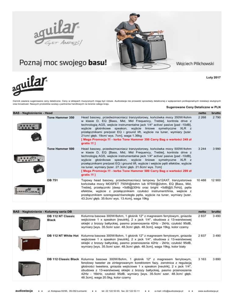 Luty 2017 Cennik zawiera sugerowane ceny detaliczne. Ceny w sklepach muzycznych mogą być niższe. Audiostacja nie prowadzi sprzedaży detalicznej z wyłączeniem profesjonalnych instalacji studyjnych oraz broadcast. Naszych produktów szukaj u partnerów handlowych na terenie całego kraju. Sugerowane Ceny Detaliczne w PLN BAS - Nagłośnienie - Head netto brutto Tone Hammer 350 Head basowy, przedwzmacniacz tranzystorowy, końcówka mocy 350W/4ohm w klasie D, EQ [Bass, Mid, Mid Frequency, Treble], kontrola drive z technologią AGS, wejście instrumentalne jack 1/4" active/ pasive [pad -10dB], wyjście głośnikowe speakon, wyjście liniowe symetryczne XLR z przełącznikami pre/post EQ i ground lift, wyjście na tuner, wymiary [szer. 21cm/ głęb. 19cm/ wys. 7cm], waga 1.36kg [ Mega Promocja !!! - torba Tone Hammer 350 Carry Bag o wartości 249 zł gratis !!! ] 2 268 2 790 Tone Hammer 500 Head basowy, przedwzmacniacz tranzystorowy, końcówka mocy 500W/4ohm w klasie D, EQ [Bass, Mid, Mid Frequency, Treble], kontrola drive z technologią AGS, wejście instrumentalne jack 1/4" active/ pasive [pad -10dB], wyjście głośnikowe speakon, wyjście liniowe symetryczne XLR z przełącznikami pre/post EQ i ground lift, wyjście i wejście pętli efektów, wyjście na tuner, wymiary [szer. 27.3cm/ głęb. 21.6cm/ wys. 7cm] [ Mega Promocja !!! - torba Tone Hammer 500 Carry Bag o wartości 299 zł gratis !!! ] 3 244 3 990 DB 751 Topowy head basowy, przedwzmacniacz lampowy 3x12AX7, tranzystorowa końcówka mocy MOSFET 750W@4ohm lub 975W@2ohm, EQ [Bass, Mid, Treble], przełączniki [deep +5dB@30Hz oraz bright [email protected]], pętla efektów, wyjście z przełącznikiem czułości instrument/linia, wejście z przełącznikiem szeregowa/równoległa pętla, wyjście na tuner, wymiary [szer. 43.2cm/ głęb. 35.6cm/ wys. 13.4cm], waga 19kg 10 488 12 900 netto brutto Kolumna basowa 300W/8ohm, 1 głośnik 12" z magnesem ferrytowym, gniazda wejściowe 1 x speakon [neutrik], 2 x jack 1/4", obudowa z 13-warstwowej sklejki z brzozy bałtyckiej, pasmo przenoszenia 42Hz - 2kHz, czułość 95dB, wymiary [wys. 35.5cm/ szer. 48.3cm/ głęb. 48.3cm], waga 19kg, kolor czarny 2 837 3 490 DB 112 NT White Hot Kolumna basowa 300W/8ohm, 1 głośnik 12" z magnesem ferrytowym, gniazda wejściowe 1 x speakon [neutrik], 2 x jack 1/4", obudowa z 13-warstwowej sklejki z brzozy bałtyckiej, pasmo przenoszenia 42Hz - 2kHz, czułość 95dB, wymiary [wys. 35.5cm/ szer. 48.3cm/ głęb. 48.3cm], waga 19kg, kolor biały 2 837 3 490 DB 112 Classic Black Kolumna basowa 300W/8ohm, 1 głośnik 12" z magnesem ferrytowym, fenolowy tweeter ze zintegrowanym korektorem fazy, zwrotnica z regulacją głośności tweetera, gniazda wejściowe 1 x speakon [neutrik], 2 x jack 1/4", obudowa z 13-warstwowej sklejki z brzozy bałtyckiej, pasmo przenoszenia 42Hz - 16kHz, czułość 95dB, wymiary [wys. 35.5cm/ szer. 48.3cm/ głęb. 48.3cm], waga 20.5kg, kolor czarny 3 163 3 890 BAS - Nagłośnienie - Kolumny seria DB DB 112 NT Classic Black audiostacja ♦ ♦ ul. Kolejowa 93/95, 05-092 Łomianki ♦ ♦ tel. 22 122 53 00, fax: 22 122 53 11 ♦ ♦ e-mail: [email protected] ♦ ♦ www.audiostacja.pl BAS - Nagłośnienie - Kolumny seria DB netto brutto DB 112 Boss Tweed Kolumna basowa 300W/8ohm, 1 głośnik 12" z magnesem ferrytowym, fenolowy tweeter ze zintegrowanym korektorem fazy, zwrotnica z regulacją głośności tweetera, gniazda wejściowe 1 x speakon [neutrik], 2 x jack 1/4", obudowa z 13-warstwowej sklejki z brzozy bałtyckiej, pasmo przenoszenia 42Hz - 16kHz, czułość 95dB, wymiary [wys. 35.5cm/ szer. 48.3cm/ głęb. 48.3cm], waga 20.5kg, kolor beżowy 3 163 3 890 DB 112 White Hot Kolumna basowa 300W/8ohm, 1 głośnik 12" z magnesem ferrytowym, fenolowy tweeter ze zintegrowanym korektorem fazy, zwrotnica z regulacją głośności tweetera, gniazda wejściowe 1 x speakon [neutrik], 2 x jack 1/4", obudowa z 13-warstwowej sklejki z brzozy bałtyckiej, pasmo przenoszenia 42Hz - 16kHz, czułość 95dB, wymiary [wys. 35.5cm/ szer. 48.3cm/ głęb. 48.3cm], waga 20.5kg, kolor biały 3 163 3 890 DB 115 Classic Black Kolumna basowa 400W/8ohm, 1 głośnik 15" z magnesem ferrytowym, gniazda wejściowe 1 x speakon [neutrik], 2 x jack 1/4", obudowa z 13-warstwowej 8 Ohm sklejki z brzozy bałtyckiej, pasmo przenoszenia 32Hz - 3kHz, czułość 96dB, wymiary [wys. 53.3cm/ szer. 62.2cm/ głęb. 44.5cm], waga 32.2kg, kolor czarny 4 252 5 230 DB 212 Classic Black Kolumna basowa 600W/4ohm, 2 głośniki 12" z magnesem ferrytowym, fenolowy tweeter ze zintegrowanym korektorem fazy, zwrotnica z regulacją 4 ohm głośności tweetera, gniazda wejściowe 1 x speakon [neutrik], 2 x jack 1/4", obudowa z 13-warstwowej sklejki z brzozy bałtyckiej, pasmo przenoszenia 41Hz - 16kHz, czułość 98dB, wymiary [wys. 63cm/ szer. 62.2cm/ głęb. 44.1cm], waga 32kg, zdejmowane kółka, kolor czarny 4 951 6 090 Kolumna basowa 600W/4ohm, 2 głośniki 12" z magnesem ferrytowym, fenolowy tweeter ze zintegrowanym korektorem fazy, zwrotnica z regulacją głośności tweetera, gniazda wejściowe 1 x speakon [neutrik], 2 x jack 1/4", obudowa z 13-warstwowej sklejki z brzozy bałtyckiej, pasmo przenoszenia 41Hz - 16kHz, czułość 98dB, wymiary [wys. 63cm/ szer. 62.2cm/ głęb. 44.1cm], waga 32kg, zdejmowane kółka, kolor biały 4 951 6 090 DB 212 Classic Black Kolumna basowa 600W/8ohm, 2 głośniki 12" z magnesem ferrytowym, fenolowy tweeter ze zintegrowanym korektorem fazy, zwrotnica z regulacją 8 ohm głośności tweetera, gniazda wejściowe 1 x speakon [neutrik], 2 x jack 1/4", obudowa z 13-warstwowej sklejki z brzozy bałtyckiej, pasmo przenoszenia 41Hz - 16kHz, czułość 98dB, wymiary [wys. 63cm/ szer. 62.2cm/ głęb. 44.1cm], waga 32kg, zdejmowane kółka, kolor czarny 4 951 6 090 Kolumna basowa 600W/8ohm, 2 głośniki 12" z magnesem ferrytowym, fenolowy tweeter ze zintegrowanym korektorem fazy, zwrotnica z regulacją głośności tweetera, gniazda wejściowe 1 x speakon [n