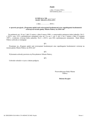 Projekt z dnia 23 marca 2016 r. Zatwierdzony przez ......................... UCHWAŁA NR .................... RADY MIASTA PUŁAWY z dnia .................... 2016 r. w sprawie przyjęcia „Programu opieki nad zwierzętami bezdomnymi oraz zapobiegania bezdomności zwierząt na terenie gminy Miasto Puławy na 2016 rok” Na podstawie art. 18 ust. 2 pkt 15 ustawy z dnia 8 marca 1990 r. o samorządzie gminnym (tekst jednolity: Dz.U. z 2015 r. poz. 1515 z późniejszymi zmianami) oraz art. 11a ust. 1, ust. 2, ust. 3, ust. 5 ustawy z dnia 21 sierpnia 1997 r. o ochronie zwierząt (tekst jednolity: Dz.U. z 2013 r. poz. 856 z późniejszymi zmianami), Rada Miasta Puławy uchwala co następuje: § 1. Przyjmuje się „Program opieki nad zwierzętami bezdomnymi oraz zapobiegania bezdomności zwierząt na terenie gminy Miasto Puławy na 2016 rok”. § 2. Wykonanie uchwały powierza się Prezydentowi Miasta Puławy. § 3. Uchwała wchodzi w życie z dniem podjęcia. Przewodnicząca Rady Miasta Puławy Bożena Krygier Id: 2BD2EB98-83A8-4486-A718-40D44C32C46B. Projekt Strona 1 Załącznik do Uchwały Nr .................... Rady Miasta Puławy z dnia....................2016 r. PROGRAM OPIEKI NAD ZWIERZĘTAMI BEZDOMNYMI ORAZ ZAPOBIEGANIA BEZDOMNOŚCI ZWIERZĄT NA TERENIE GMINY MIASTO PUŁAWY NA 2016 ROK ROZDZIAŁ 1. Postanowienia ogólne. § 1. Celami „Programu opieki nad zwierzętami bezdomnymi oraz zapobiegania bezdomności zwierząt na 2016 rok”, zwanego dalej Programem, są : 1) zapewnienie opieki nad zwierzętami bezdomnymi, w rozumieniu art. 4 pkt 16 ustawy o ochronie zwierząt, 2) zapobieganie bezdomności zwierząt. § 2. Program realizowany jest przez gminę Miasto Puławy we współpracy z lekarzami weterynarii oraz organizacjami społecznymi, których statutowym celem działania jest ochrona zwierząt. § 3. Funkcję koordynatora działań podejmowanych w ramach Programu pełni Prezydent Miasta Puławy za pośrednictwem Wydziału Ochrony Środowiska Urzędu Miasta Puławy, Straży Miejskiej we współpracy z Zakładem Usług Komunalnych Sp. z o. o. w Puławach, organami Inspekcji Weterynaryjnej i samorządu lekarskoweterynaryjnego. ROZDZIAŁ 2. Zapewnienie bezdomnym zwierzętom miejsca w schronisku dla zwierząt. § 4. Zapewnienie bezdomnym zwierzętom, z wyłączeniem zwierząt gospodarskich, miejsca w schronisku dla zwierząt, realizowane jest przez gminę Miasto Puławy poprzez funkcjonujące Schronisko dla bezdomnych zwierząt przy ul. Komunalnej 11 w Puławach. § 5. Schronisko dla bezdomnych zwierząt prowadzi Zakład Usług Komunalnych Sp. z o. o. w Puławach w ramach zadań z zakresu ochrony przed bezdomnymi zwierzętami, przekazanych do realizacji przez gminę Miasto Puławy na podstawie uchwały nr XXXI/328/2013 Rady Miasta Puławy z dnia 07 marca 2013 r. w sprawie zmiany uchwały nr XLIV/288/97 Rady Miasta Puławy z dnia 22 maja 1997 r. w sprawie przekształcenia Miejskiego Zakładu Usług Komunalnych w Puławach oraz umowy wykonawczej nr 171.2013.BZM z dnia 15 kwietnia 2013 r. ROZDZIAŁ 3. Opieka nad wolno żyjącymi kotami, w tym ich dokarmianie. § 6. Opieka nad kotami wolno żyjącymi realizowana będzie poprzez: 1) ustalenie miejsc, w których przebywają koty wolno żyjące, 2) zapewnianie dokarmiania kotów wolno żyjących oraz zapewnienie im wody pitnej w miejscach ich przebywania. Id: 2BD2EB98-83A8-4486-A718-40D44C32C46B. Projekt Strona 1 § 7. Zadania określone w § 6 realizowane będą przez ich powierzenie organizacjom pozarządowym, których statutowym celem działania jest ochrona zwierząt wraz z udzieleniem dotacji na ich sfinansowanie. § 8. Gmina Miasto Puławy kontraktuje usługi leczenia weterynaryjnego wolno żyjących kotów w przypadkach ich nagłego zachorowania i zdarzeń powypadkowych, usługi sterylizacji i kastracji oraz, w uzasadnionych przypadkach, eutanazji. W 2016 r. zawarto umowę z Lecznicą Weterynaryjną przy ul. Norwida 22 w Puławach (tel. 81 886 36 10, 603 913 836) na świadczenie wyżej wymienionych usług w ramach realizacji zadania „Usługi weterynaryjne dla bezdomnych zwierząt z terenu miasta Puławy”. ROZDZIAŁ 4. Odławianie bezdomnych zwierząt. § 9. Na terenie gminy Miasto Puławy prowadzi się wyłapywanie bezdomnych zwierząt w sposób stały na interwencje. § 10. Wyłapywaniem objęte są bezdomne zwierzęta pozostawione bez opieki, a w szczególności chore, agresywne oraz poszkodowane w wypadkach, w stosunku do których nie istnieje możliwość ustalenia ich właściciela lub innej osoby, pod której opieką dotychczas pozostawały. § 11. Wyłapywanie bezdomnych zwierząt prowadzone jest w sposób humanitarny, przy użyciu specjalistycznego sprzętu przeznaczonego do wyłapywania zwierząt, który nie stwarza zagrożenia dla życia i zdrowia zwierząt. § 12. Transport bezdomnych zwierząt odbywa się środkiem transportu przystosowanym do bezpiecznego i humanitarnego przewozu zwierząt. § 13. Zapewnienie realizacji odławiania bezdomnych zwierząt odbywa się w ramach funkcjonowania Schroniska dla bezdomnych zwierząt przy ul. Komunalnej 11 w Puławach (od poniedziałku do piątku w godzinach: 8.0016.00, w soboty w godz.: 8.00-12.00 - tel. 667 706 607 lub 663 761 555, poza w/w godzinami - tel.691 979 161). ROZDZIAŁ 5. Obligatoryjna sterylizacja albo kastracja zwierząt w schroniskach dla zwierząt. § 14. Gmina realizuje obligatoryjną sterylizację albo kastrację zwierząt przebywających dla bezdomnych zwierząt, na zasadach ustalonych z podmiotem prowadzącym schronisko. w schronisku § 15. Zabiegi sterylizacji i kastracji mogą być przeprowadzane wyłącznie przez lekarza weterynarii. ROZDZIAŁ 6. Poszukiwanie właścicieli dla bezdomnych zwierząt. § 16. Gmina prowadzi poszukiwanie właścicieli dla bezdomnych zwierząt poprzez: 1) informowanie o możliwości adopcji zwierząt bezdomnych na stronach internetowych Urzędu Miasta Puławy, Id: 2BD2EB98-83A8-4486-A718-40D44C32C46B. Projekt Strona 2 2) prowa