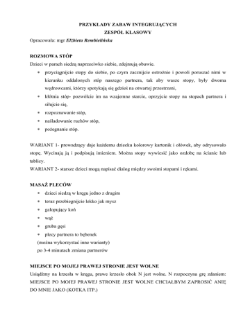 PRZYKŁADY ZABAW INTEGRUJĄCYCH ZESPÓŁ KLASOWY Opracowała: mgr Elżbieta Rembielińska ROZMOWA STÓP Dzieci w parach siedzą naprzeciwko siebie, zdejmują obuwie. ∗ przyciągnijcie stopy do siebie, po czym zacznijcie ostrożnie i powoli poruszać nimi w kierunku oddalonych stóp naszego partnera, tak aby wasze stopy, były dwoma wędrowcami, którzy spotykają się gdzieś na otwartej przestrzeni, ∗ kłótnia stóp- pozwólcie im na wzajemne starcie, oprzyjcie stopy na stopach partnera i siłujcie się, ∗ rozpoznawanie stóp, ∗ naśladowanie ruchów stóp, ∗ pożegnanie stóp. WARIANT 1- prowadzący daje każdemu dziecku kolorowy kartonik i ołówek, aby odrysowało stopę. Wycinają ją i podpisują imieniem. Można stopy wywiesić jako ozdobę na ścianie lub tablicy. WARIANT 2- starsze dzieci mogą napisać dialog między swoimi stopami i rękami. MASAŻ PLECÓW ∗ dzieci siedzą w kręgu jedno z drugim ∗ teraz przebiegnijcie lekko jak mysz ∗ galopujący koń ∗ wąż ∗ gruba gęsi ∗ plecy partnera to bębenek (można wykorzystać inne warianty) po 3-4 minutach zmiana partnerów MIEJSCE PO MOJEJ PRAWEJ STRONIE JEST WOLNE Usiądźmy na krzesła w kręgu, prawe krzesło obok N jest wolne. N rozpoczyna grę zdaniem: MIEJSCE PO MOJEJ PRAWEJ STRONIE JEST WOLNE CHCIAŁBYM ZAPROSIĆ ANIĘ DO MNIE JAKO (KOTKA ITP.) Po wykonaniu zadania Ania zajmuje miejsce obok mnie, następnie dziecko, obok którego zwolniło się miejsce Ani zaprasza inną osobę na puste miejsce. PUSZCZANIE OCZKA Utworzymy krąg krzeseł odpowiadający połowie liczby dzieci w naszej grupie. Proszę aby połowa grupy zajęła miejsca na krzesłach, a pozostali stanęli za nimi z tyłu krzeseł. Teraz dostawię do kręgu krzesło, za którym stanę sama. Nikt ze stojących nie ma ochoty ciągle stać za pustym krzesłem. Dlatego spróbuje on zwabić jedno z dzieci, które siedzą na krzesłach puszczając do niego oczko i tym samym pokazuję mu, że je wybrał. Kiedy tylko osoba zauważy, że daje mu znak, błyskawicznie podbiega do pustego krzesła. Osoba stojąca za krzesłem stara się uniemożliwić ucieczkę partnera. Po 5 minutach zmieniamy dzieci rolami. Rozmowa po zabawie ∗ co sprawiło mi najwięcej radości? ∗ co mi się nie podobało? ∗ czy chętnie uciekałem, puszczałem oczko czy zatrzymywałem? ∗ co rzuciło mi się w oczy, gdy obserwowałem innych? ∗ jak się teraz czuję? BITWA WODNA Dzieci swobodnie poruszają się po sali i patrzą w podłogę. Wyobraźcie sobie, że na podłodze jest woda. Chodzicie po sali tak jakby wasze nogi otoczone były wodą. Możecie przy tym pryskać, poczujecie, jak to jest, kiedy macie wodę pod nogami. Teraz woda podnosi się i sięga aż do kolan. Jak chodzi się po takiej wodzie? Zauważcie, że nie da się już tak łatwo iść jak wcześniej. Woda sięga już do bioder, czy chcielibyście dotknąć wody rękami? Jaki opór stawia woda, kiedy idziecie? Woda sięga wam do piersi, teraz poruszacie się dosyć wolno i musicie do tego użyć sporo siły. Woda podnosi się do szyi. Tylko głowa wystaje z wody, bądźcie ostrożni, żeby nie zanurzyć twarzy, gdzie macie ręce? Bądźcie świadomi, że poruszanie się teraz wymaga dużo nakładu pracy i siły. Teraz wyobraźcie sobie, że woda przewyższa was, nie bójcie się, bo macie rurkę jak nurkowie. Woda opada .... gdy sięga do kolan rozpocznijcie z partnerem bitwę wodną. Opryskujcie się, ale uważajcie żeby twarz i oczy nie zostały ochlapane. ZŁY CZARODZIEJ Dzieci poruszają się swobodnie, jedno jest czarodziejem. Gdy czarodziej dotknie dziecko, stoi ono nieruchomo (kamienieje). Skamieniałe dziecko może zostać uwolnione, gdy następne wpadnie w sidła czarodzieja. I będzie ono miało (np. ten sam kolor włosów, oczu, spódniczkę itp.). Nowo dotknięte dziecko podchodzi do skamieniałego dziecka, głaszcząc je po głowie i mówi „JESTEŚ ZNOWU WOLNY”. (po 2 minutach zmiana) JABŁKO KRÓLEWNY ŚNIEŻKI Dzieci siedzą w kręgu, ciasno obok siebie i bardzo szybko (po usłyszeniu START) podają sobie piłeczkę (worek, maskotkę itp.). Osoba prowadząca odwraca się plecami i mówi STOP, dziecko które w tym momencie trzyma piłkę wypada z gry. ∗ Przestrzegamy kierunku podawania jabłka. ∗ Zwycięża ten, kto zostanie jako ostatni. ∗ Ożywiamy ofiary otrutego jabłka. Dzieci ustawiają się w kręgu i najpierw powoli przenoszą ciężar z jednej na drugą nogę. START! – zaczynają coraz szybciej poruszać się po okręgu, w ten sposób wyrzucają ze swojego ciała truciznę. ∗ Gdy grupa jest duża można puścić w obieg więcej jabłek INDIANIE NA WOJENNEJ ŚCIEŻCE 7 dzieci wychodzi z sali, muszą umówić się, w jakiej kolejności przebiegną rundkę wokół sali przed oczami pozostałych uczniów. Po rundce wybiegają znowu na korytarz. Widzowie muszą zapamiętać, w jakiej kolejności występowali wojownicy. Za moment Indianie znów wchodzą, ale już w innej kolejności. Na ochotnika zgłasza się dziecko, (jeśli jest pewne) i wywołuje kolejno Indian po imieniu i ustawia ich. Jeżeli się nie uda, kolejna osoba odgaduje. Po odgadnięciu, Indianie wykonują taniec radości. Znów wybieramy 7 Indian. Dzieci mogą być przebrane