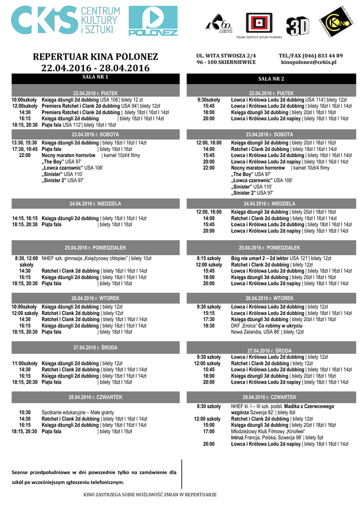 REPERTUAR KINA POLONEZ 22.04.2016 - 28.04.2016 UL. WITA STWOSZA 2/4 96 - 100 SKIERNIEWICE SALA NR 1 10:00szkoły 12:00szkoły 14:30 16:15 18:15, 20:30 22.04.2016 r. PIĄTEK Księga dżungli 2d dubbing USA 106’| bilety 12 zł Premiera Ratchet i Clank 2d dubbing USA 94’| bilety 12zł Premiera Ratchet i Clank 2d dubbing | bilety 18zł I 16zł I 14zł Księga dżungli 2d dubbing | bilety 18zł I 16zł I 14zł Piąta fala USA 112’| bilety 18zł I 16zł SALA NR 2 9:30szkoły 15:45 18:00 20:00 23.04.2016 r. SOBOTA 13:30, 15:30 Księga dżungli 2d dubbing | bilety 18zł I 16zł I 14zł 17:30, 19:45 Piąta fala | bilety 18zł I 16zł 22:00 Nocny maraton horrorów | karnet 10zł/4 filmy „The Boy” USA 97’ „Łowca czarownic” USA 106’ „Sinister” USA 110’ „Sinister 2” USA 97’ 23.04.2016 r. SOBOTA Księga dżungli 3d dubbing | bilety 20zł I 18zł I 16zł Ratchet i Clank 2d dubbing | bilety 18zł I 16zł I 14zł Łowca i Królowa Lodu 2d dubbing | bilety 18zł I 16zł I 14zł Łowca i Królowa Lodu 2d napisy | bilety 18zł I 16zł I 14zł Nocny maraton horrorów | karnet 10zł/4 filmy „The Boy” USA 97’ „Łowca czarownic” USA 106’ „Sinister” USA 110’ „Sinister 2” USA 97’ 12:00, 18:00 14:00 15:45 20:00 Księga dżungli 3d dubbing | bilety 20zł I 18zł I 16zł Ratchet i Clank 2d dubbing | bilety 18zł I 16zł I 14zł Łowca i Królowa Lodu 2d dubbing | bilety 18zł I 16zł I 14zł Łowca i Królowa Lodu 2d napisy | bilety 18zł I 16zł I 14zł 24.04.2016 r. NIEDZIELA 25.04.2016 r. PONIEDZIAŁEK 8:30, 12:00 szkoły 14:30 16:15 18:15, 20:30 NHEF szk. gimnazja „Księżycowy chłopiec” | bilety 10zł 10:00szkoły 12:00 szkoły 14:30 16:15 18:15, 20:30 Księga dżungli 2d dubbing | bilety 12zł Ratchet i Clank 2d dubbing | bilety 12zł Ratchet i Clank 2d dubbing | bilety 18zł I 16zł I 14zł Księga dżungli 2d dubbing | bilety 18zł I 16zł I 14zł Piąta fala | bilety 18zł I 16zł Ratchet i Clank 2d dubbing | bilety 18zł I 16zł I 14zł Księga dżungli 2d dubbing | bilety 18zł I 16zł I 14zł Piąta fala | bilety 18zł I 16zł 25.04.2016 r. PONIEDZIAŁEK 8:15 szkoły 12:00 szkoły 15:45 18:00 20:00 Bóg nie umarł 2 – 2d lektor USA 121’| bilety 12zł Ratchet i Clank 2d dubbing | bilety 12zł Łowca i Królowa Lodu 2d dubbing | bilety 18zł I 16zł I 14zł Księga dżungli 3d dubbing | bilety 20zł I 18zł I 16zł Łowca i Królowa Lodu 2d napisy | bilety 18zł I 16zł I 14zł 9:30 szkoły 15:15 17:30 19:30 Łowca i Królowa Lodu 2d dubbing | bilety 12zł Łowca i Królowa Lodu 2d dubbing | bilety 18zł I 16zł I 14zł Księga dżungli 3d dubbing | bilety 20zł I 18zł I 16zł DKF „Eroica” Co robimy w ukryciu Nowa Zelandia, USA 86’ | bilety 12zł 26.04.2016 r. WTOREK 26.04.2016 r. WTOREK 27.04.2016 r. ŚRODA 11:00szkoły 14:30 16:15 18:15, 20:30 Księga dżungli 2d dubbing | bilety 12zł Ratchet i Clank 2d dubbing | bilety 18zł I 16zł I 14zł Księga dżungli 2d dubbing | bilety 18zł I 16zł I 14zł Piąta fala | bilety 18zł I 16zł 9:30 szkoły 12:00 szkoły 15:45 18:00 20:00 28.04.2016 r. CZWARTEK Spotkanie edukacyjne – Małe granty Ratchet i Clank 2d dubbing | bilety 18zł I 16zł I 14zł Księga dżungli 2d dubbing | bilety 18zł I 16zł I 14zł Piąta fala | bilety 18zł I 16zł 27.04.2016 r. ŚRODA Łowca i Królowa Lodu 2d dubbing | bilety 12zł Ratchet i Clank 2d dubbing | bilety 12zł Łowca i Królowa Lodu 2d dubbing | bilety 18zł I 16zł I 14zł Księga dżungli 3d dubbing | bilety 20zł I 18zł I 16zł Łowca i Królowa Lodu 2d napisy | bilety 18zł I 16zł I 14zł 28.04.2016 r. CZWARTEK 8:30 szkoły 10:30 14:30 16:15 18:15, 20:30 22.04.2016 r. PIĄTEK Łowca i Królowa Lodu 2d dubbing USA 114’| bilety 12zł Łowca i Królowa Lodu 2d dubbing | bilety 18zł I 16zł I 14zł Księga dżungli 3d dubbing | bilety 20zł I 18zł I 16zł Łowca i Królowa Lodu 2d napisy | bilety 18zł I 16zł I 14zł 12:00, 18:00 14:00 15:45 20:00 22:00 24.04.2016 r. NIEDZIELA 14:15, 16:15 Księga dżungli 2d dubbing | bilety 18zł I 16zł I 14zł 18:15, 20:30 Piąta fala | bilety 18zł I 16zł TEL/FAX (046) 833 44 89 [email protected] 12:00 szkoły 15:00 17:00 20:00 Seanse przedpołudniowe w dni powszednie tylko na zamówienie dla szkół po wcześniejszym zgłoszeniu telefonicznym. KINO ZASTRZEGA SOBIE MOŻLIWOŚĆ ZMIAN W REPERTUARZE NHEF kl. I – III szk. podst. Madika z Czerwcowego wzgórza Szwecja 82’ | bilety 8zł Ratchet i Clank 2d dubbing | bilety 12zł Księga dżungli 3d dubbing | bilety 20zł I 18zł I 16zł Młodzieżowy Klub Filmowy „Kinofeel” Intruz Francja, Polska, Szwecja 98’ | bilety 5zł Łowca i Królowa Lodu 2d napisy | bilety 18zł I 16zł I 14zł