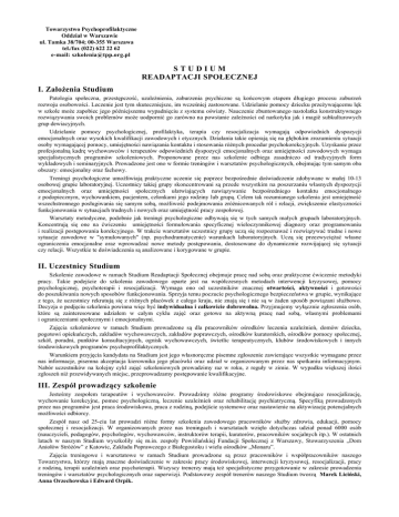 Towarzystwo Psychoprofilaktyczne Oddział w Warszawie ul. Tamka 38/704; 00-355 Warszawa tel./fax (022) 622 22 62 e-mail: [email protected] STUDIUM READAPTACJI SPOŁECZNEJ I. Założenia Studium Patologia społeczna, przestępczość, uzależnienia, zaburzenia psychiczne są końcowym etapem długiego procesu zaburzeń rozwoju osobowości. Leczenie jest tym skuteczniejsze, im wcześniej zastosowane. Udzielanie pomocy dziecku przeżywającemu lęk w szkole może zapobiec jego późniejszemu wypadnięciu z systemu oświaty. Nauczenie zbuntowanego nastolatka konstruktywnego rozwiązywania swoich problemów może uodpornić go zarówno na powstanie zależności od narkotyku jak i magiê subkulturowych grup dewiacyjnych. Udzielanie pomocy psychologicznej, profilaktyka, terapia czy resocjalizacja wymagają odpowiednich dyspozycji emocjonalnych oraz wysokich kwalifikacji zawodowych i etycznych. Działania takie opierają się na głębokim zrozumieniu sytuacji osoby wymagającej pomocy, umiejętności nawiązania kontaktu i stosowania różnych procedur psychokorekcyjnych. Uzyskanie przez profesjonalną kadrę wychowawców i terapeutów odpowiednich dyspozycji emocjonalnych oraz umiejętności zawodowych wymaga specjalistycznych programów szkoleniowych. Proponowane przez nas szkolenie odbiega zasadniczo od tradycyjnych form wykładowych i seminaryjnych. Prowadzone jest ono w formie treningów i warsztatów psychologicznych, obejmując tym samym oba obszary: emocjonalny oraz fachowy. Treningi psychologiczne umożliwiają praktyczne uczenie się poprzez bezpośrednie doświadczenie zdobywane w małej 10-13 osobowej grupie laboratoryjnej. Uczestnicy takiej grupy skoncentrowani są przede wszystkim na poszerzaniu własnych dyspozycji emocjonalnych oraz umiejętności społecznych ułatwiających nawiązywanie bezpośredniego kontaktu emocjonalnego z podopiecznym, wychowankiem, pacjentem, członkami jego rodziny lub grupą. Celem tak rozumianego szkolenia jest umiejętność wszechstronnego posługiwania się samym sobą, możliwość podejmowania zróżnicowanych ról i relacji, zwiększenie elastyczności funkcjonowania w sytuacjach trudnych i nowych oraz umiejętność pracy zespołowej. Warsztaty metodyczne, podobnie jak treningi psychologiczne odbywają się w tych samych małych grupach laboratoryjnych. Koncentrują się one na ćwiczeniu umiejętności formułowania specyficznej wieloczynnikowej diagnozy oraz programowaniu i realizacji postępowania korekcyjnego. W trakcie warsztatów uczestnicy grupy uczą się rozpoznawać i rozwiązywać trudne i nowe sytuacje zawodowe w "symulowanych" (np. psychodramatycznie) warunkach laboratoryjnych. Uczą się przezwyciężać własne ograniczenia emocjonalne oraz wprowadzać nowe metody postępowania, dostosowane do dynamicznie rozwijającej się sytuacji czy relacji. Wszystkie te doświadczenia są analizowane i korygowane w grupie. II. Uczestnicy Studium Szkolenie zawodowe w ramach Studium Readaptacji Społecznej obejmuje pracę nad sobą oraz praktyczne ćwiczenie metodyki pracy. Takie podejście do szkolenia zawodowego oparte jest na współczesnych metodach interwencji kryzysowej, pomocy psychologicznej, psychoterapii i resocjalizacji. Wymaga ono od uczestników znacznej otwartości, aktywności i gotowości do poszukiwania nowych sposobów funkcjonowania. Sprzyja temu poczucie psychologicznego bezpieczeństwa w grupie, wynikające z tego, że uczestnicy rekrutują się z różnych placówek z całego kraju, nie znają się i nie są w żaden sposób powiązani służbowo. Decyzja o podjęciu szkolenia powinna więc być indywidualna i całkowicie dobrowolna. Przyjmujemy wyłącznie zgłoszenia osób, które są zainteresowane udziałem w całym cyklu zajęć oraz gotowe na aktywną pracę nad sobą, własnymi problemami i ograniczeniami społecznymi i emocjonalnymi. Zajęcia szkoleniowe w ramach Studium prowadzone są dla pracowników ośrodków leczenia uzależnień, domów dziecka, pogotowi opiekuńczych, zakładów wychowawczych, zakładów poprawczych, ośrodków kuratorskich, ośrodków pomocy społecznej, szkół, poradni, punktów konsultacyjnych, ognisk wychowawczych, świetlic terapeutycznych, klubów środowiskowych i innych środowiskowych programów psychoprofilaktycznych. Warunkiem przyjęcia kandydata na Studium jest jego własnoręczne pisemne zgłoszenie zawierające wszystkie wymagane przez nas informacje, pisemna akceptacja kierownika jego placówki oraz udział w organizowanym przez nas spotkaniu informacyjnym. Nabór uczestników na kolejny cykl zajęć szkoleniowych prowadzimy raz w roku, z reguły w zimie. W wypadku większej ilości zgłoszeń niż przewidywanych miejsc, przeprowadzamy postępowanie kwalifikacyjne. III. Zespół prowadzący szkolenie Jesteśmy zespołem terapeutów i wychowawców. Prowadzimy różne programy środowiskowe obejmujące resocjalizację, wychowanie korekcyjne, pomoc psychologiczną, leczenie uzależnień oraz rehabilitację psychiatryczną. Specyfiką prowadzonych przez nas programów jest praca środowiskowa, praca z rodziną, podejście systemowe oraz nastawienie na aktywizację potencjalnych możliwości odbiorcy. Zespół nasz od 25-ciu lat prowadzi różne formy szkolenia zawodowego pracowników służby zdrowia, edukacji, pomocy społecznej i resocjalizacji. W organizowanych przez nas treningach i warsztatach wzięło dotychczas udział ponad 6000 osób (nauczycieli, pedagogów, psychologów, wychowawców, instruktorów terapii, kuratorów, pracowników socjalnych itp.). W ostatnich latach w naszym Studium wyszkoliły się m.in. zespoły Powiślańskiej Fundacji Społecznej z Warszawy, Stowarzyszenia „Dom Aniołów Stróżów” z Katowic, Zakładu Poprawczego z Białegostoku i wielu ośrodków „Monaru”. Zajęcia treningowe i warsztatowe w ramach Studium prowadzone są przez pracowników i współpracowników naszego Towarzystwa, którzy mają znaczne doświadczenie w zakresie prac