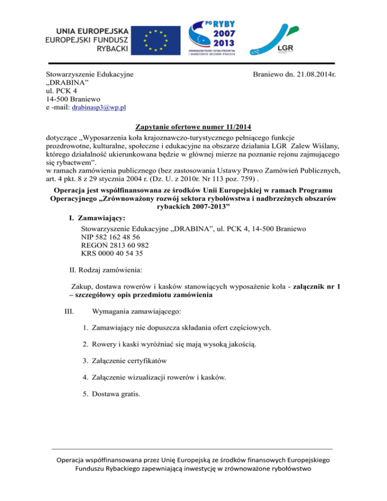 Stowarzyszenie Edukacyjne „DRABINA” ul. PCK 4 14-500 Braniewo e -mail: [email protected] Braniewo dn. 21.08.2014r. Zapytanie ofertowe numer 11/2014 dotyczące „Wyposarzenia koła krajoznawczo-turystycznego pełniącego funkcje prozdrowotne, kulturalne, społeczne i edukacyjne na obszarze działania LGR Zalew Wiślany, którego działalność ukierunkowana będzie w głównej mierze na poznanie rejonu zajmującego się rybactwem”. w ramach zamówienia publicznego (bez zastosowania Ustawy Prawo Zamówień Publicznych, art. 4 pkt. 8 z 29 stycznia 2004 r. (Dz. U. z 2010r. Nr 113 poz. 759) . Operacja jest współfinansowana ze środków Unii Europejskiej w ramach Programu Operacyjnego „Zrównoważony rozwój sektora rybołówstwa i nadbrzeżnych obszarów rybackich 2007-2013” I. Zamawiający: Stowarzyszenie Edukacyjne „DRABINA”, ul. PCK 4, 14-500 Braniewo NIP 582 162 48 56 REGON 2813 60 982 KRS 0000 40 54 35 II. Rodzaj zamówienia: Zakup, dostawa rowerów i kasków stanowiących wyposażenie koła - załącznik nr 1 – szczegółowy opis przedmiotu zamówienia III. Wymagania zamawiającego: 1. Zamawiający nie dopuszcza składania ofert częściowych. 2. Rowery i kaski wyróżniać się mają wysoką jakością. 3. Załączenie certyfikatów 4. Załączenie wizualizacji rowerów i kasków. 5. Dostawa gratis. Operacja współfinansowana przez Unię Europejską ze środków finansowych Europejskiego Funduszu Rybackiego zapewniającą inwestycję w zrównoważone rybołówstwo IV. Termin wykonania zamówienia: Termin wykonania przedmiotu zamówienia to 4 tygodnie od momentu wybrania oferenta V. Opis sposobu przygotowania oferty: Oferta powinna być przygotowana na załączonym wzorze (załącznik nr 2) VI. Miejsce oraz termin składania ofert: a) Oferta powinna być przesłana za pośrednictwem poczty elektronicznej na adres: [email protected] do 05.09.2014 r. do godziny 14.00. b) Ocena oferty zostanie dokonana w dniu 05.09.2014 r. o godz. 14.15, a wyniki i wybór najkorzystniejszej oferty zostanie ogłoszony dnia 09.09. 2014 r. w siedzibie Stowarzyszenia Edukacyjnego „DRABINA” oraz na stronie internetowej pod adresem www.sp3braniewo.pl c) Oferty złożone po terminie nie będą rozpatrywane. d) Oferent może przed upływem terminu składania ofert zmienić lub wycofać swoją ofertę. e) W toku badania i oceny ofert Zamawiający może zażądać od oferentów wyjaśnienia treści złożonych ofert. f) Zapytanie ofertowe zamieszczono na stronie www.sp3braniewo.pl oraz w siedzibie stowarzyszenia. VII. Ocena ofert: Zamawiający oświadcza, iż oferty cenowe niespełniające wymagań formalnych nie będą rozpatrywane. Zamawiający dokona oceny ważnych ofert na podstawie następujących kryteriów: Zgodność z zestawieniem rzeczowym i cena – 80% Czas gwarancji producenta – 20% Oferty z rażąco niską ceną będą odrzucane Operacja współfinansowana przez Unię Europejską ze środków finansowych Europejskiego Funduszu Rybackiego zapewniającą inwestycję w zrównoważone rybołówstwo O wyborze najkorzystniejszej oferty Zamawiający zawiadomi oferentów za pośrednictwem poczty elektronicznej i strony internetowej www.sp3braniewo.pl VIII. Dodatkowych informacji udziela Paweł Waszkiewicz i Ewa Rosa-Gil pod numerem telefonu 509 897 566 lub 696 748 887 w godz. od 10.00 do 15.00 od poniedziałku do piątku lub mailowo: [email protected] Wykaz załączników: 1. Zał. Nr 1- Szczegółowy opis przedmiotu zamówienia 2. Zał. Nr 2- Wzór oferty Operacja współfinansowana przez Unię Europejską ze środków finansowych Europejskiego Funduszu Rybackiego zapewniającą inwestycję w zrównoważone rybołówstwo ZAŁĄCZNIK NR 1 Szczegółowy opis przedmiotu zamówienia: 1. Rowery młodzieżowe 30 Rozmiar M; sztuk Koła 26 cali; Rama sztywna Wysokość z ramy aluminium 17’’. 6061. Obniżona geometria; Widelec teleskopowy z elastomerami z aluminium 6061, golenie stalowe; Napęd 21 przełożeń, obrotowe manetki SRAM. Kaseta 7 rzędowa SHIMANO, łańcuch antykorozyjny. Przerzutka przednia SHIMANO. Przerzutka tylna SRAM 3.0; Tarcze 48/38/28; Zębatki 14/28; Hamulce przednie/tylne szczękowe V – brake z aluminium, klamki aluminiowe, system zapobiegający zablokowaniu koła Operacja współfinansowana przez Unię Europejską ze środków finansowych Europejskiego Funduszu Rybackiego zapewniającą inwestycję w zrównoważone rybołówstwo w razie nagłego hamowania; Kierownica aluminiowa uniesiona, wspornik regulacją wysokości na wpół aluminiowy i z nachylenia. Regulacja wspornika; Siodło / sztyca podsiodłowa uniwersalna i ultra wygodna. Sztyca aluminiowa z wbudowanym jarzmem. Regulacja siodełka bez narzędzi. Siodło testowane, potwierdzony komfort siedzenia; Koła obręcze stożkowate aluminiowe jednokomorowe anodowane oszlifowanymi (stożkowymi). z krawędziami Stalowa piasta z zaciskiem z przodu i oś przykręcana z tyłu; Opony wytrzymałe i wszechstronne na szosy i drogi gruntowe; Pedały wszechstronne plastikowe i jednoczęściowe . Korby stalowe kute; Akcesoria/wyposażenie: Błotniki z uchwytami kątowymi, stopka, modularny bagażnik umożliwiający zamocowanie kompatybilnych akcesoriów, uchwyt na bidon. Ochrona łańcucha. Operacja współfinansowana przez Unię Europejską ze środków finansowych Europejskiego Funduszu Rybackiego zapewniającą inwestycję w zrównoważone rybołówstwo 2. Rowery dla dorosłych Rozmiar L 1,73 – 1,85; 6 sztuk Koła 28 cali; Rama sztywna Wysokość z aluminium ramy 18’’. 6061. Obniżona geometria; Widelec amortyzowany z aluminium 6061, golenie stalowe; Napęd 21 przełożeń, obrotowe manetki. Kaseta 7 rzędowa SHIMANO, łańcuch antykorozyjny. Przerzutka przednia SHIMANO; Tarcze 48/38/28; Zębatki 14/28; Hamulce szczękowe V – brake z aluminium, klamki aluminiowe, system zapobiegający zablokowaniu koła w razie nagłego hamowania; Kierownica aluminiowa uniesiona, wspornik regulacją wysokości na wpół aluminio