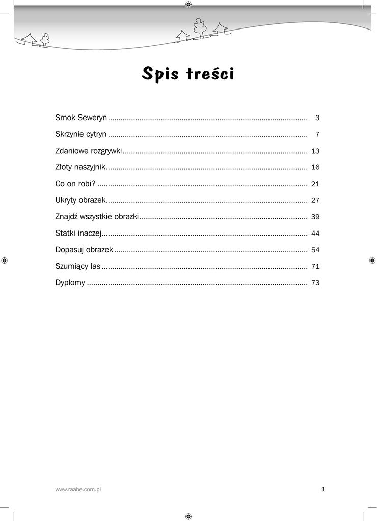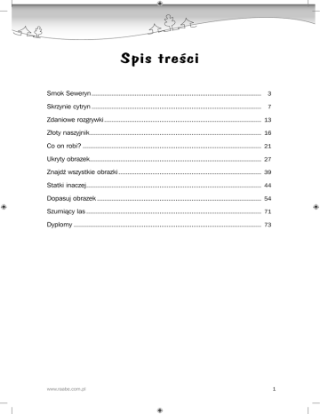 Spis treści Smok Seweryn ............................................................................................... 3 Skrzynie cytryn ............................................................................................... 7 Zdaniowe rozgrywki ........................................................................................ 13 Złoty naszyjnik ................................................................................................ 16 Co on robi? .................................................................................................... 21 Ukryty obrazek................................................................................................ 27 Znajdź wszystkie obrazki ................................................................................ 39 Statki inaczej.................................................................................................. 44 Dopasuj obrazek ............................................................................................ 54 Szumiący las .................................................................................................. 71 Dyplomy ......................................................................................................... 73 www.raabe.com.pl 1