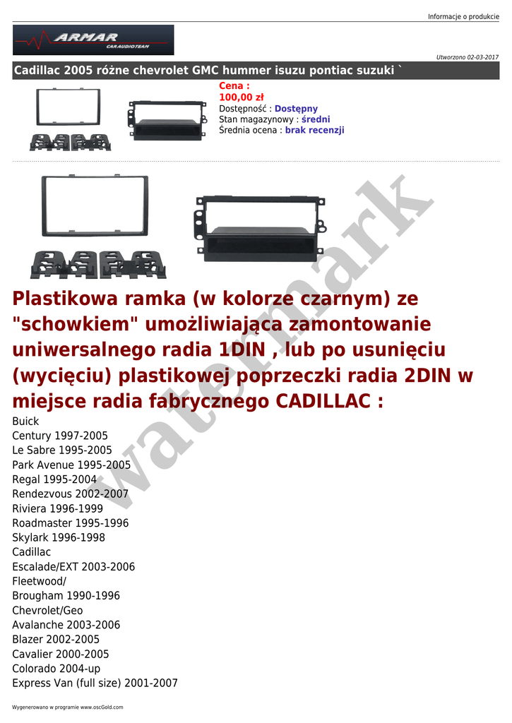 Informacje o produkcie Utworzono 02-03-2017 Cadillac 2005 różne chevrolet GMC hummer isuzu pontiac suzuki ` Cena : 100,00 zł er m ar k Dostępność : Dostępny Stan magazynowy : średni Średnia ocena : brak recenzji Plastikowa ramka (w kolorze czarnym) ze "schowkiem" umożliwiająca zamontowanie uniwersalnego radia 1DIN , lub po usunięciu (wycięciu) plastikowej poprzeczki radia 2DIN w miejsce radia fabrycznego CADILLAC : w at Buick Century 1997-2005 Le Sabre 1995-2005 Park Avenue 1995-2005 Regal 1995-2004 Rendezvous 2002-2007 Riviera 1996-1999 Roadmaster 1995-1996 Skylark 1996-1998 Cadillac Escalade/EXT 2003-2006 Fleetwood/ Brougham 1990-1996 Chevrolet/Geo Avalanche 2003-2006 Blazer 2002-2005 Cavalier 2000-2005 Colorado 2004-up Express Van (full size) 2001-2007 Wygenerowano w programie www.oscGold.com w at er m ar k Impala 2000-2005 Malibu 2001-2003 Malibu Classic 2004 Metro (Geo included) 1995-2001 Monte Carlo 2000-2005 SSR 2003-2006 S-10 2002-2004 Silverado Classic 2003-2007 Suburban 2003-2006 Tahoe 2003-2006 Tracker 1992-2004 Trailblazer 2002-2009 Venture 2000-2005 GMC Canyon 2004-up Envoy 2002-2009 Savanna (full size) 2001-2007 Sierra Classic 2003-2007 Sonoma 2002-2004 Yukon/Denali/XL 2003-2006 Hummer H2 2003-2007 Isuzu Ascender 2003-2008 Oldsmobile Achieva 1996-1998 Alero 1999-2004 Aurora 1995-2003 Bravada 1998-2001 Bravada 2002-2004 Cutlass 1997-1999 Cutlass Supreme 1995-1997 Eighty-Eight 1994-1999 Intrigue 1998-2002 LSS 1996-1999 Ninety-Eight 1994-1996 Regency 1997-1998 Silhouette 2000-2004 Pontiac Aztec 2001-2005 Bonneville 2000-2005 Grand Am 2001-2005 Montana 2000-2005 Sunfire 2000-2005 Suzuki Aerio 2002 Informacje o produkcie w at er m ar k Esteem 1995-2003 Sidekick 1992-1998 Swift 1995-2001 Vitara 1999-2005 Wygenerowano w programie www.oscGold.com