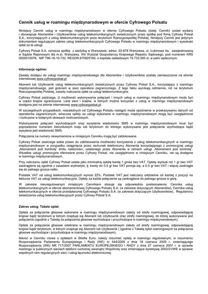 Cennik usług w roamingu międzynarodowym w ofercie Cyfrowego Polsatu Niniejszy Cennik usług w roamingu międzynarodowym w ofercie Cyfrowego Polsatu (dalej: Cennik) został wydany i obowiązuje Abonentów i Użytkowników usług telekomunikacyjnych świadczonych przez spółkę pod firmą Cyfrowy Polsat S.A., korzystających z usług telekomunikacyjnych poza terytorium Rzeczypospolitej Polskiej. Niniejszy Cennik jest jedynym dokumentem regulującym zakres usług telekomunikacyjnych Cyfrowego Polsatu w roamingu międzynarodowym i wysokość opłat za te usługi. Cyfrowy Polsat S.A. oznacza spółkę z siedzibą w Warszawie, adres: 03-878 Warszawa, ul. Łubinowa 4a, zarejestrowaną w Sądzie Rejonowym dla m.st. Warszawy, XIII Wydział Gospodarczy Krajowego Rejestru Sądowego, pod numerem KRS 0000010078, NIP 796-18-10-732, REGON 670925160, o kapitale zakładowym 10.733.000 zł, w pełni wpłaconym. Informacje ogólne: Zasady dostępu do usługi roamingu międzynarodowego dla Abonentów i Użytkowników zostały zamieszczone na stronie internetowej www.cyfrowypolsat.pl Abonent lub Użytkownik usług telekomunikacyjnych świadczonych przez Cyfrowy Polsat S.A., korzystający z roamingu międzynarodowego, jest gościem w sieci operatora zagranicznego. Z tego faktu wynikają odmienne, niż na terytorium Rzeczypospolitej Polskiej, zasady naliczania opłat za usługi telekomunikacyjne. Cyfrowy Polsat zastrzega, iż możliwość wykonywania połączeń i innych usług w roamingu międzynarodowym może być w części krajów ograniczona. Lista sieci i krajów, w których można korzystać z usług w roamingu międzynarodowym dostępna jest na stronie internetowej www.cyfrowypolsat.pl. W szczególnych przypadkach, niezależnych od Cyfrowego Polsatu nastąpić może opóźnienie w przekazywaniu danych od operatorów zagranicznych, wówczas opłaty za usługi wykonane w roamingu międzynarodowym mogą być uwzględnione i rozliczone w kolejnych okresach rozliczeniowych. Wykonywanie połączeń wychodzących oraz wysyłanie wiadomości SMS w roamingu międzynarodowym musi być poprzedzone numerem kierunkowym kraju lub terytorium do którego wykonywane jest połączenie wychodzące bądź wysyłana jest wiadomość SMS. Połączenia na numery niewymienione w niniejszym Cenniku mogą być zablokowane. Cyfrowy Polsat zastrzega sobie prawo do zablokowania możliwości korzystania z usług telekomunikacyjnych w roamingu międzynarodowym w przypadku osiągnięcia przez rachunek telefoniczny Abonenta korzystającego z promocyjnej usługi „Abonament pod kontrolą” limitu należności, ustalonego przez Abonenta w ramach usługi „Abonament pod kontrolą”. Wszelkie usługi promocyjne oferowane przez Cyfrowy Polsat, nie uwzględnione w niniejszym Cenniku, nie są dostępne w roamingu międzynarodowym. Przy naliczaniu opłat Cyfrowy Polsat ustala jako minimalną opłatę kwotę 1 grosz bez VAT. Opłaty wyższe niż 1 gr bez VAT zaokrąglane są zgodnie z zasadami arytmetyki, tj. kwoty do 0,5 gr bez VAT pomija się, a 0,5 gr bez VAT i więcej zaokrągla się do pełnego grosza netto. Podatek VAT od usług telekomunikacyjnych wynosi 22%. Podatek VAT jest naliczany oddzielnie od każdej z pozycji na fakturze VAT za usługi telekomunikacyjne. Opłaty za każde połączenie są zaokrąglane do pełnego grosza w górę. W zakresie nieuregulowanym niniejszym Cennikiem stosuje się odpowiednio postanowienia: Cennika usług telekomunikacyjnych w ofercie abonamentowej Cyfrowego Polsatu S.A. (w zakresie dotyczącym Abonentów), Cennika usług telekomunikacyjnych w ofercie przedpłaconej Cyfrowego Polsatu S.A. (w zakresie dotyczącym Użytkowników), Regulaminu świadczenia usług telekomunikacyjnych przez Cyfrowy Polsat S.A. Zakres usług. Tabele opłat: Opłata za połączenie głosowe wykonane w roamingu międzynarodowym zależy od strefy roamingowej, odpowiadającej krajowi bądź terytorium w którym znajduje się Abonent lub Użytkownik oraz strefy roamingowej, do której wykonywane jest połączenie (zgodnie z Tabelą za połączenia głosowe wychodzące i przychodzące w roamingu międzynarodowym). Opłata za połączenie głosowe odebrane w roamingu międzynarodowym zależy od strefy roamingowej, odpowiadającej krajowi bądź terytorium, w którym znajduje się Abonent lub Użytkownik ( zgodnie z Tabelą opłat roamingowych za połączenia głosowe wychodzące i przychodzące w roamingu międzynarodowym). Ilekroć w Cenniku mowa o opłatach w Strefie Euro, należy rozumieć opłaty w roamingu regulowanym, w rozumieniu Rozporządzenia Parlamentu Europejskiego i Rady (WE) nr 544/2009 z dnia 18 czerwca 2009 r. zmieniającego Rozporządzenia (WE) NR 717/2007 PARLAMENTU EUROPEJSKIEGO I RADY z dnia 27 czerwca 2007 r. w sprawie roamingu w publicznych sieciach telefonii ruchomej wewnątrz Wspólnoty oraz zmieniające dyrektywę 2002/21/WE w sprawie wspólnych ram regulacyjnych sieci i usług łączności elektronicznej. Tabela opłat za połączenia głosowe wychodzące i przychodzące w roamingu międzynarodowym Połączenie wychodzące ze strefy: Opłata za minutę połączenia w roamingu 1) 3) 5) Cena za minutę połączenia odebranego w roamingu 2) 4) Do Polski Do strefy A (strefa Euro i inne kraje) Do Strefy B Do Strefy C Do Strefy D 1,81 zł z VAT 1,81 zł z VAT 6 zł z VAT 9 zł z VAT 12 zł z VAT 0,85 zł z VAT Strefa B 6 zł z VAT 6 zł z VAT 6 zł z VAT 9 zł z VAT 12 zł z VAT 6 zł z VAT Strefa C 9 zł z VAT 9 zł z VAT 9 zł z VAT 9 zł z VAT 12 zł z VAT 6 zł z VAT Strefa D 12 zł z VAT 12 zł z VAT 12 zł z VAT 12 zł z VAT 12 zł z VAT 12 zł z VAT Strefa A (strefa Euro oraz inne kraje) 1) Opłaty za połączenia wychodzące ze strefy B, C i D lub do strefy B, C i D naliczanie są za każdą rozpoczętą minutę połączenia. Czas połączenia zaokrąglany jest do pełnej minuty w górę. 2) Opłaty za połączenia przychodzące ze strefy B, C i D naliczanie są za każdą rozpoczętą minutę poł