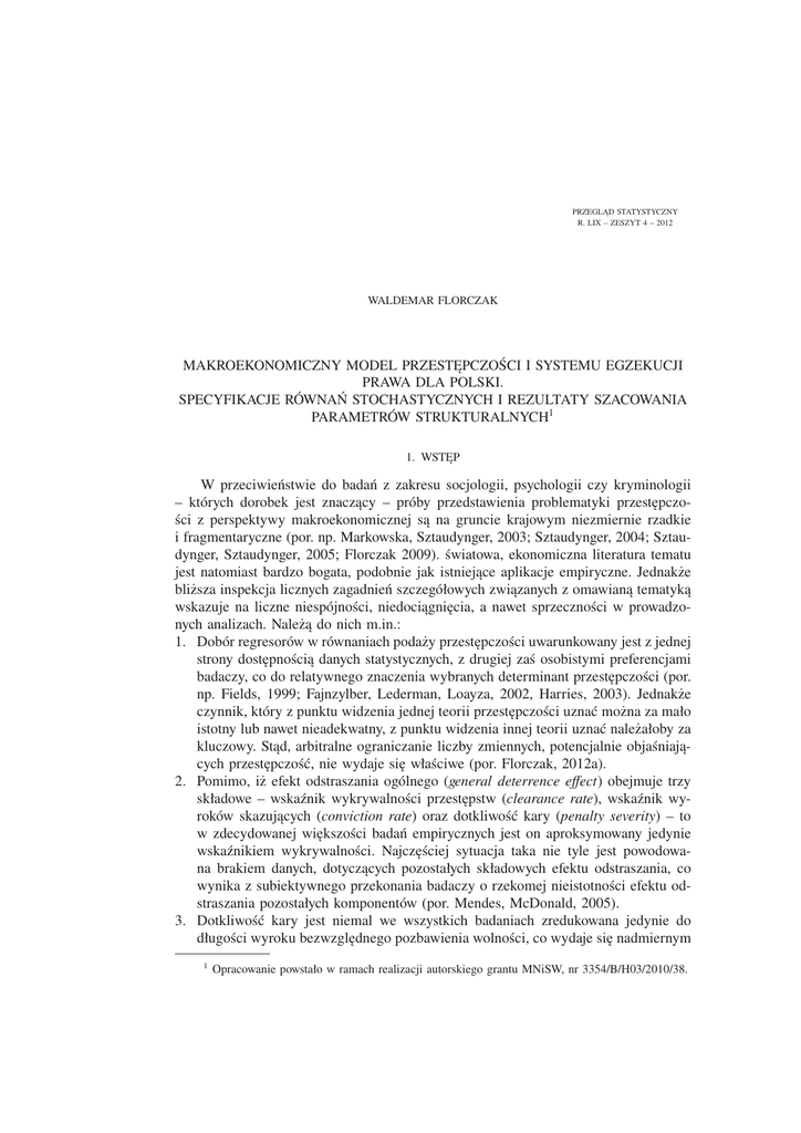 PRZEGLĄD STATYSTYCZNY R. LIX – ZESZYT 4 – 2012 WALDEMAR FLORCZAK MAKROEKONOMICZNY MODEL PRZESTĘPCZOŚCI I SYSTEMU EGZEKUCJI PRAWA DLA POLSKI. SPECYFIKACJE RÓWNAŃ STOCHASTYCZNYCH I REZULTATY SZACOWANIA PARAMETRÓW STRUKTURALNYCH1 1. WSTĘP W przeciwieństwie do badań z zakresu socjologii, psychologii czy kryminologii – których dorobek jest znaczący – próby przedstawienia problematyki przestępczości z perspektywy makroekonomicznej są na gruncie krajowym niezmiernie rzadkie i fragmentaryczne (por. np. Markowska, Sztaudynger, 2003; Sztaudynger, 2004; Sztaudynger, Sztaudynger, 2005; Florczak 2009). światowa, ekonomiczna literatura tematu jest natomiast bardzo bogata, podobnie jak istniejące aplikacje empiryczne. Jednakże bliższa inspekcja licznych zagadnień szczegółowych związanych z omawianą tematyką wskazuje na liczne niespójności, niedociągnięcia, a nawet sprzeczności w prowadzonych analizach. Należą do nich m.in.: 1. Dobór regresorów w równaniach podaży przestępczości uwarunkowany jest z jednej strony dostępnością danych statystycznych, z drugiej zaś osobistymi preferencjami badaczy, co do relatywnego znaczenia wybranych determinant przestępczości (por. np. Fields, 1999; Fajnzylber, Lederman, Loayza, 2002, Harries, 2003). Jednakże czynnik, który z punktu widzenia jednej teorii przestępczości uznać można za mało istotny lub nawet nieadekwatny, z punktu widzenia innej teorii uznać należałoby za kluczowy. Stąd, arbitralne ograniczanie liczby zmiennych, potencjalnie objaśniających przestępczość, nie wydaje się właściwe (por. Florczak, 2012a). 2. Pomimo, iż efekt odstraszania ogólnego (general deterrence effect) obejmuje trzy składowe – wskaźnik wykrywalności przestępstw (clearance rate), wskaźnik wyroków skazujących (conviction rate) oraz dotkliwość kary (penalty severity) – to w zdecydowanej większości badań empirycznych jest on aproksymowany jedynie wskaźnikiem wykrywalności. Najczęściej sytuacja taka nie tyle jest powodowana brakiem danych, dotyczących pozostałych składowych efektu odstraszania, co wynika z subiektywnego przekonania badaczy o rzekomej nieistotności efektu odstraszania pozostałych komponentów (por. Mendes, McDonald, 2005). 3. Dotkliwość kary jest niemal we wszystkich badaniach zredukowana jedynie do długości wyroku bezwzględnego pozbawienia wolności, co wydaje się nadmiernym 1 Opracowanie powstało w ramach realizacji autorskiego grantu MNiSW, nr 3354/B/H03/2010/38. 456 Waldemar Florczak uproszczeniem, gdyż pozostałe formy kar (np. grzywny i ich wysokość) również posiadają właściwości odstraszające (por. np. Becker, 1968; Viren, 2001). 4. Kompleksowe, holistyczne studia empiryczne – uwzględniające obok równania podaży przestępczości również wszystkie składowe systemu egzekucji prawa – są niezmiernie rzadkie. W najlepszym przypadku, jedynym ogniwem uwzględnianym w takich analizach jest bezpieczeństwo publiczne/policja (por. np. Bodman, Maultby, 1997). Jednakże w kompletnym systemie egzekucji prawa policja odpowiada za wskaźniki wykrywalności, a zatem za jeden tylko element pełnego efektu odstraszania. Dlatego też całościowa analiza związków pomiędzy skalą przestępczości a publicznym zaangażowaniem w jej ograniczanie powinna obejmować także pozostałe ogniwa sytemu egzekucji prawa (por. np. Tulder, Van der Torre, 1999). W artykule przedstawiono propozycję kompletnego, makroekonomicznego modelu przestępczości i systemu egzekucji prawa dla Polski, o kryptonimie WF-CRIME, przy budowie którego starano się uniknąć wad wymienionych w poprzedzającym akapicie. Jest to pierwsza w kraju – i jedna z nielicznych w świecie – konstrukcja tego typu, umożliwiająca analizę ilościową związków pomiędzy przestępczością a wszystkimi składowymi systemu egzekucji prawa w ramach powiązań symultanicznych. Oszacowań parametrów strukturalnych równań modelu dokonano na podstawie danych GUS. Informacje oficjalne stanowią podstawę formalnych diagnoz społecznych i stanowią punkt odniesienia dla podejmowania konkretnych działań decyzyjnych. To bowiem oficjalne dane, nie zaś nieregularnie dostępne dane ankietowe – np. dotyczące wiktymizacji społeczeństwa polskiego – determinują funkcjonowanie instytucji związanych z systemem egzekucji prawa. Fakty te stanowią dostateczny argument na rzecz ich wykorzystania w kompleksowym badaniu nad uwarunkowaniami przestępczości oraz mechanizmami funkcjonowania polskiego sytemu egzekucji prawa. Ponadto w trakcie przetwarzania danych źródłowych czyniono liczne starania w celu zapewnienia ich spójności w czasie. Struktura artykułu jest następująca. W kolejnym punkcie zwięźle omówiono dane wykorzystane w badaniu, ze szczególnym uwzględnieniem instytucjonalnych uwarunkowań przestępczości. Sekcja 3 poświęcona jest prezentacji wyników oszacowań parametrów behawioralnych równań modelu, w podziale na poszczególne sekcje polskiego systemu egzekucji prawa. Artykuł zawiera również uwagi końcowe oraz załącznik z symulacyjną wersją modelu. 2. BAZA DANYCH: WYBRANE ZAGADNIENIA Na podstawie informacji źródłowych zaczerpniętych głównie z roczników statystycznych GUS, ale również roczników demograficznych oraz opracowań specjalistycznych (Szymanowski, 2010; Księga jubileuszowa więziennictwa polskiego 1989-2009, 2009; Siemaszko, Gruszczyńska, Marczewski, 2009; Kumor, 2006), jak również przy wykorzystaniu autorskich procedur przetwarzania danych (Florczak, 2003; Florczak, 2006; Florczak, 2011a), utworzono jednorodną bazę danych, niezbędną do przeprowa- 457 Makroekonomiczny model przestępczości i systemu egzekucji prawa dla Polski. . . dzenia systemowych analiz empirycznych. Syntetyczną informację na temat zawartych w bazie kategorii podano w tabeli 1. Tabela 1. Wykaz zmiennych modelu WF-CRIME Lp. Symbol zmiennej Nazwa zmiennej Numer tablicy i str