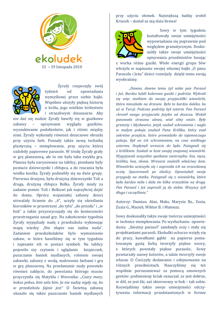 przy użyciu słomek. Największą bańkę zrobił Krzesik – dostał za nią duże brawa! 15 – 19 listopada 2010 Żyrafy rozpoczęły swój tydzień od opowiadania wymyślonej przez siebie bajki. Wspólnie ułożyły piękną historię o królu, jego wielkim królestwie i straszliwym dinozaurze. Aby nie dać się nudzie Żyrafy bawiły się w guzikowe zabawy – opisywanie wyglądu guzików, wyszukiwanie podobieństw, jak i różnic między nimi. Żyrafy wykonały również deszczowe obrazki przy użyciu farb. Poznały także nową technikę plastyczną – stemplowanie, przy użyciu której ozdobiły papierowe parasole. W środę Żyrafy grały w grę planszową, ale to nie była taka zwykła gra. Plansza była narysowana na tablicy, pionkami były postacie dziewczynki i chłopca, a do rzucania była wielka kostka. Żyrafy podzieliły się na dwie grupy. Pierwsza drużyna, była drużyną dziewczynki Toli a druga, drużyną chłopca Bolka. Żyrafy miały za zadanie pomóc Toli i Bolkowi jak najszybciej dojść do domu. Oprócz wspaniałej zabawy dzieci utrwalały liczenie do „4”, uczyły się określania kierunków w przestrzeni „do tyłu” „do przodu” i „w bok” a także przyzwyczajały się do konieczności przestrzegania zasad gry. Na zakończenie tygodnia Żyrafy wypędzały nudę z przedszkola wykonując mapę wiedzy „Nie złapie nas żadna nuda”. Zadaniem przedszkolaków było wymienienie zabaw, w które bawiliśmy się w tym tygodniu i zapisanie ich w postaci symboli. Na tablicy pojawiło się: czytanie i oglądanie książeczek, puszczanie baniek mydlanych, robienie swojej zabawki, zabawy z wodą, malowanie farbami i gra w grę planszową. Na przełamanie nudy powstało również zaklęcie, do powstania którego mocno przyczyniła się Matylda i Weronika: „Czary mary, hokus pokus, bim sala bim. Ja nie nudzę nigdy się, bo w przedszkolu fajnie jest” ☺ Świetną zabawą okazało się także puszczanie baniek mydlanych Sowy w tym tygodniu kształtowały swoje umiejętności wypowiadania się poprawnie pod względem gramatycznym. Doskonaliły także swoje umiejętności opisywania przedmiotów losując z worka różne guziki. Wiele energii grupa Sów włożyła w napisanie swojej własnej bajki „O panu Parasolu i Jeżu” dzieci rozwijały dzięki temu swoją wyobraźnię: „Dawno, dawno temu żył sobie pan Parasol i Jeż. Bardzo lubili kolorowe guziki i podróże. Wybrali się więc statkiem do swojej przyjaciółki wiewiórki, która mieszkała na drzewie. Było to bardzo daleko, bo aż w Turcji. Podczas podróży był sztorm. Pan Parasol chronił swego przyjaciela Jeżyka od deszczu. Wokół panowała straszna ulewa, wiał silny wiatr. Były grzmoty i błyskawice. Jeżyk szukał schronienia i nagle w małym pokoju znalazł Pana Królika, który znał sekretne przejście, które prowadziło do tajemniczego pokoju. Był on ich schronieniem, na czas wielkiego sztormu. Dopłynęli wreszcie do lądu. Pożegnali się z królikiem. Szukali w lesie swojej znajomej wiewiórki. Wypytywali wszystkie spotkane zwierzątka: lisa, mysz, królika, lwa, słonia. Wreszcie znaleźli właściwy dom. Wiewiórka ucieszyła się i zaprosiła ich na orzeszkową ucztę. Spacerowali po okolicy. Opowiadali swoje przygody na statku. Pożegnali się z wiewiórką, która była bardzo miła i dała im kilka orzeszków na drogę. Pan Parasol i Jeż zaprosili ją do siebie. Wszyscy żyli długo i szczęśliwie.” Autorzy: Damian, Alan, Maks, Marysia Rz., Zosia, Zuzia G., Maciek, Wiktor B. i Mateusz. Sowy doskonaliły także swoje twórcze umiejętności w technice stemplowania. Po wysłuchaniu opowiedania „Smutny parasol” zamknęły oczy i stały się projektantami parasoli. Ekoludki ochoczo wzięły się do pracy, kawałkami gąbki na papierze pomalowanym gęstą farbą tworzyły piękne wzory, z których powstały piękne parasole.. Sowy powtarzały nazwy kolorów, a także tworzyły swoje własne ☺ Ćwiczyły dodawanie i odejmowanie na różnych przedmiotach. Nauczyliśmy się też wspólnie porozumiewać za pomocą umownych gestów: podniesiony kciuk oznaczał, ze jest dobrze, w dół, ze jest źle, zaś skierowany w bok – tak sobie. Rozwijaliśmy także swoje umiejętności odczytywania informacji przedstawionych w formie rysunku, grając w grę planszową. Doskonaliliśmy dzięki temu swoją orientację w przestrzeni dotyczącą kierunku „do przodu”, „w bok” i „do tyłu”. Sowy zastanawiały się także nad sposobami na nudę: Alan „super jest liczenie guzików”, Wiktor B. uznał, że fajnie jest stemplować i malować farbami, Alan wpadł też na pomysł, że gdy pada „fajnie jest czytać książki” ☺ Sowy ćwiczyły prawidłowe oddychanie oraz wydłużały fazę oddechu przez ćwiczenia z bańkami mydlanymi. Wzbogaciły swoje słownictwo o przymiotniki „słodki” i „kwaśny” próbując różne produkty spożywcze cukier, cytrynę, kwasek cytrynowy. Sowy rozwijały także swoją sprawność fizyczną ćwicząc z gazetami. Raz gazeta służyła jako tratwa, raz jako parasol, później Ekoludki ćwiczyły siłę swoich rączek, zgniatając gazetę w małą kulkę, którą rzucały do celu. Największe skupienie i koncentrację wzbudziło ćwiczenie „tunel” polegające na czołganiu się przez tunel powstały z szeroko rozstawionych nóżek Sów. W czwartek w naszym przedszkolu odbył się Basiowy Bal Pasiastych. Wszyscy przyszli ubrani w paski, sala przedszkolna była w paski, Panie również były ubrane w paski. Dzieci w napięciu oczekiwały pasiastej zabawy. W pięknie udekorowanej pasiasto-balonowej sali czekał na dzieci pirat, który miał do przeczytania list do wszystkich Ekoludków od Basi – bohaterki książki. Okazało się, że nie tak łatwo dostać się na bal. Trzeba najpierw wykonać pirackie zadania, aby dobrze się bawić wśród balonów i czerwono białej bibuły. Pierwszym zadaniem było złożenie czapek pira