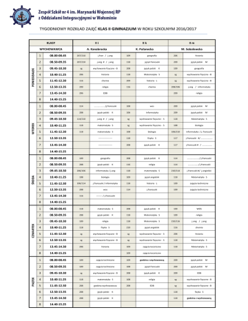 PIĄTEK CZWARTEK ŚRODA WTOREK PONIEDZIAŁEK TYGODNIOWY ROZKŁAD ZAJĘĆ KLAS II GIMNAZJUM W ROKU SZKOLNYM 2016/2017 KLASY II i II k II m WYCHOWAWCA A. Kanabrocka K. Pułanecka M. Sobolewska 1 08.00-08.45 207/210 j.fran / j.ang 109 geografia 206 historia 2 08.50-09.35 207/210 j.ang # / j.ang 118 język francuski 209 język polski 3 09.45-10.30 sg wychowanie fizyczne - B 208 język polski K 109 geografia 4 10.40-11.25 206 historia 118 Matematyka S sg wychowanie fizyczne - B 5 11.45-12.30 116 chemia 209 historia L sg wychowanie fizyczne - B 6 12.50-13.35 209 religia 116 chemia 208/106 j.ang / informatyka 7 13.45-14.30 206 EDB 209 religia 8 14.40-15.25 1 08.00-08.45 114 ………………./j.francuski 2 08.50-09.35 208 3 09.45-10.30 4 M 108 wos 209 język polski M K 106 informatyka 209 język polski M 114/210 j.ang # / j.ang sg wychowanie fizyczne - S 118 Matematyka S 10.40-11.25 118 matematyka S sg wychowanie fizyczne - S 108 biologia 5 11.45-12.30 118 matematyka S 108 biologia 106/210 informatyka / j. francuski 6 12.50-13.35 ------------------ 118 fizyka S 117 j.francuski #/ ……………….. 7 13.45-14.30 ------------------ 208 język polski K 117 j.francuski # / …………….. 8 14.40-15.25 1 08.00-08.45 109 geografia 208 język polski K 114 ……………….../ j.francuski 2 08.50-09.35 208 116 religia 114 …………….../ j.francuski 3 09.45-10.30 206/106 informatyka / j.ang 118 matematyka S 210/114 j.francuski #/ j.angielski 4 10.40-11.25 108 biologia 109 język angielski 118 Matematyka S 5 11.45-12.30 106/114 j.francuski / informatyka 118 historia L 109 zajęcia techniczne 6 12.50-13.35 208 wos 114 j.francuski 109 zajęcia techniczne 7 13.45-14.30 116 -------- / j.francuski 8 14.40-15.25 1 08.00-08.45 118 matematyka S 208 język polski K 109 WOS 2 08.50-09.35 208 język polski 118 Matematyka S 109 religia 3 09.45-10.30 109 religia 118 Matematyka S 210/116 j.ang / j.ang 4 10.40-11.25 118 fizyka S 210 język angielski 116 chemia 5 11.45-12.30 sg wychowanie fizyczne - B sg wychowanie fizyczne - S 206 historia 6 12.50-13.35 sg wychowanie fizyczne - B sg wychowanie fizyczne - S 118 Matematyka S 7 13.45-14.30 206 historia 109 zajęcia teczniczne 118 Matematyka S 8 14.40-15.25 109 zajęcia teczniczne 1 08.00-08.45 109 zajęcia techniczne 109 godzina z wychowawcą 209 język polski M 2 08.50-09.35 109 zajęcia techniczne 108 język francuski 209 język polski M 3 09.45-10.30 sg wychowanie fizyczne - B 208 język polski 209 EDB 4 10.40-11.25 118 matematyka S 108 religia sg wychowanie fizyczne - B 5 11.45-12.30 208 godzina wychowawcza 208 EDB sg wychowanie fizyczne - B 6 12.50-13.35 208 język polski K 118 fizyka S 7 13.45-14.30 208 język polski K 118 godzina z wychowawcą 8 14.40-15.25 język polski język polski K K K
