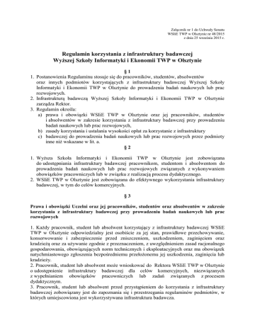 Załącznik nr 1 do Uchwały Senatu WSIiE TWP w Olsztynie nr 48/2015 z dnia 25 września 2015 r. Regulamin korzystania z infrastruktury badawczej Wyższej Szkoły Informatyki i Ekonomii TWP w Olsztynie §1 1. Postanowienia Regulaminu stosuje się do pracowników, studentów, absolwentów oraz innych podmiotów korzystających z infrastruktury badawczej Wyższej Szkoły Informatyki i Ekonomii TWP w Olsztynie do prowadzenia badań naukowych lub prac rozwojowych. 2. Infrastrukturą badawczą Wyższej Szkoły Informatyki i Ekonomii TWP w Olsztynie zarządza Rektor. 3. Regulamin określa: a) prawa i obowiązki WSIiE TWP w Olsztynie oraz jej pracowników, studentów i absolwentów w zakresie korzystania z infrastruktury badawczej przy prowadzeniu badań naukowych lub prac rozwojowych, b) zasady korzystania i ustalania wysokości opłat za korzystanie z infrastruktury c) badawczej do prowadzenia badań naukowych lub prac rozwojowych przez podmioty inne niż wskazane w lit. a. §2 1. Wyższa Szkoła Informatyki i Ekonomii TWP w Olsztynie jest zobowiązana do udostępniania infrastruktury badawczej pracownikom, studentom i absolwentom do prowadzenia badań naukowych lub prac rozwojowych związanych z wykonywaniem obowiązków pracowniczych lub w związku z realizacją procesu dydaktycznego. 2. WSIiE TWP w Olsztynie jest zobowiązana do efektywnego wykorzystania infrastruktury badawczej, w tym do celów komercyjnych. §3 Prawa i obowiązki Uczelni oraz jej pracowników, studentów oraz absolwentów w zakresie korzystania z infrastruktury badawczej przy prowadzeniu badań naukowych lub prac rozwojowych 1. Każdy pracownik, student lub absolwent korzystający z infrastruktury badawczej WSIiE TWP w Olsztynie odpowiedzialny jest osobiście za jej stan, prawidłowe przechowywanie, konserwowanie i zabezpieczenie przed zniszczeniem, uszkodzeniem, zaginięciem oraz kradzieżą oraz za używanie zgodnie z przeznaczeniem, z uwzględnieniem zasad racjonalnego gospodarowania, obowiązujących norm technicznych i eksploatacyjnych oraz ma obowiązek natychmiastowego zgłoszenia bezpośredniemu przełożonemu jej uszkodzenia, zaginięcia lub kradzieży. 2. Pracownik, student lub absolwent może wnioskować do Rektora WSIiE TWP w Olsztynie o udostępnienie infrastruktury badawczej dla celów komercyjnych, niezwiązanych z wypełnianiem obowiązków pracowniczych lub zadań związanych z procesem dydaktycznym. 3. Pracownik, student lub absolwent przed przystąpieniem do korzystania z infrastruktury badawczej zobowiązany jest do zapoznania się i przestrzegania regulaminów podmiotów, w których umiejscowiona jest wykorzystywana infrastruktura badawcza. §4 Zasady korzystania i wysokość opłat za korzystanie z infrastruktury badawczej do prowadzenia badań naukowych lub prac rozwojowych przez inne podmioty. 1. WSIiE TWP wykorzystuje infrastrukturę badawczą do celów komercyjnych przede wszystkim do realizowania projektów badawczo-rozwojowych we współpracy ze środowiskiem społeczno – gospodarczym regionu Warmii i Mazur. 2. Regulamin nie ma zastosowania do infrastruktury badawczej nabytej na podstawie umowy ze stroną finansującą lub współfinansującą badania naukowe lub prace rozwojowe, z której wynika zakaz jej komercyjnego wykorzystania. 3. Warunki komercyjnego wykorzystania infrastruktury badawczej określa każdorazowo umowa z podmiotem trzecim, którą w imieniu WSIiE TWP w Olsztynie zawiera Rektor. §5 1. Wysokość opłat za komercyjne korzystanie z infrastruktury badawczej określa Rektor WSIiE TWP w Olsztynie biorąc pod uwagę zakres zleconych prac, konieczność pokrycia kosztów eksploatacji i odtworzenia wartości użytkowej infrastruktury badawczej. 2. Dziekani Wydziałów na każdy rok akademicki tworzą wykaz infrastruktury badawczej przeznaczonej do komercyjnego korzystania i przekazują go Rektorowi w terminie do 15 października obowiązującego roku akademickiego.. 3. Koła Naukowe korzystają nieodpłatnie z infrastruktury badawczej WSIiE TWP w Olsztynie pod opieką Opiekuna Koła i Dziekana Wydziału. 4. Sekretariat Uczelni zobowiązany jest do prowadzenia rejestru umów dotyczących komercyjnego wykorzystania aparatury badawczej. 5. Rejestr wskazany w ust. 4 powinien obejmować informację o oznaczeniu i dacie zawarcia umowy, stronach umowy, przedmiocie prac (badawczych i rozwojowych), infrastrukturze badawczej wykorzystanej przy realizacji umowy i wysokości należnych opłat. GLOSARIUSZ Infrastruktura badawcza – aparatura naukowo-badawcza oraz oprogramowanie wykorzystywane do prac naukowo-badawczych. Komercyjne wykorzystanie infrastruktury badawczej – odpłatne korzystanie z infrastruktury badawczej do prowadzenia badań naukowych lub prac rozwojowych przez podmioty trzecie na podstawie umowy cywilnoprawnej. Opłata za komercyjne wykorzystanie infrastruktury badawczej – opłata za komercyjne korzystanie z infrastruktury badawczej ustalana przez Rektora. Przewodniczący Senatu Rektor dr hab. Adam Sosnowski