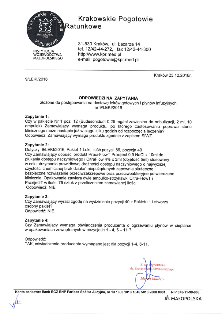F'ffĘ Krakowskie Pogotowie Ratun:kowe &łunxd9 lNSTYTUCJA WO]EWODZTWA MAŁOPoLsl(lEco 31-530 Kraków, ul. Łazarza 14 tel. 12142-44-272, fax 12142-44-300 http://www. kpr. med. pl e-mail: pogotowie@kpr,med.pl Krakow 23,12,2016r. 9lLEK|l2016 oDPoWlEDzl NA ZAPYTANIA złożone do postępowania na dostawę leków gotowych i płynów infuzyjnych nr 9/LEKl/2016 Zapytanie 1: Czyw pakiecie Nr 1 poz. 12 (Budesonidum 0,25 mg/ml zawiesina do nebulizacji,2 ml, 10 ampułek) Zamawiający wymaga produktu, po ktorego zastosowaniu poprawa stanu klinicznego może nastąpić już w ciągu kilku godzin od rozpoczęcia leczenia? Odpowiedź: ZamawiĄący wymaga produktu zgodnie z zapisem SIWZ. Zapytanie 2: Dotyczy: 9lLEKll2016, Pakiet 1 Leki, ilośćpozycji 86, pozycja 40 Czy Zamawiający dopuści produkt Praxi-FlowT Praxiject 0,9 NaClx'lOmldo płukania dostępu naczyniowego i CitraFlow 4o/o x 3ml (objętość5ml) stosowany w celu utrzymania prawidłowej drozności dostępu naczyniowego o najwyzszej czystości chemicznej brak działań niepoządanych zapewnia skuteczne i bezpieczne rozwiązanie pzeciwzakrzepowe oruz przeciwbakteryjne potwierdzone klinicznie. Opakowanie zawiera dwie ampułko-stzykawki Citra-FlowT i PraxijectT w ilości75 sztuk zpzeliczeniem zamawianej ilości Odpowiedź: NlE Zapytanle 3: Czy Zamawiający wyrazi zgodę na wydzielenie pozycji 40 zPakietu 1 i stworzy osobny pakiet? Odpowiedź: NlE Zapytanie 4: Czy Zamawiający wymaga oświadczenia producenta o ogrzewaniu płynów w cieplarce w opakowaniach zewnętrznych w pozycjach 1 - 4, 6 - 11 ? Odpowiedź: TAK, oświadczenie producenta wymagane jest dla pozycji 1-4, 6-11. Administracyjnych Konto bankowe: Bank BGŹ BNP Paribas Spółka Akcyjna, nr 13 ,t600 1013 1845 5013 2ooo I ., ł1, V 0001, NlP 675-11-98-968 ń, nłAł.opolsl(A