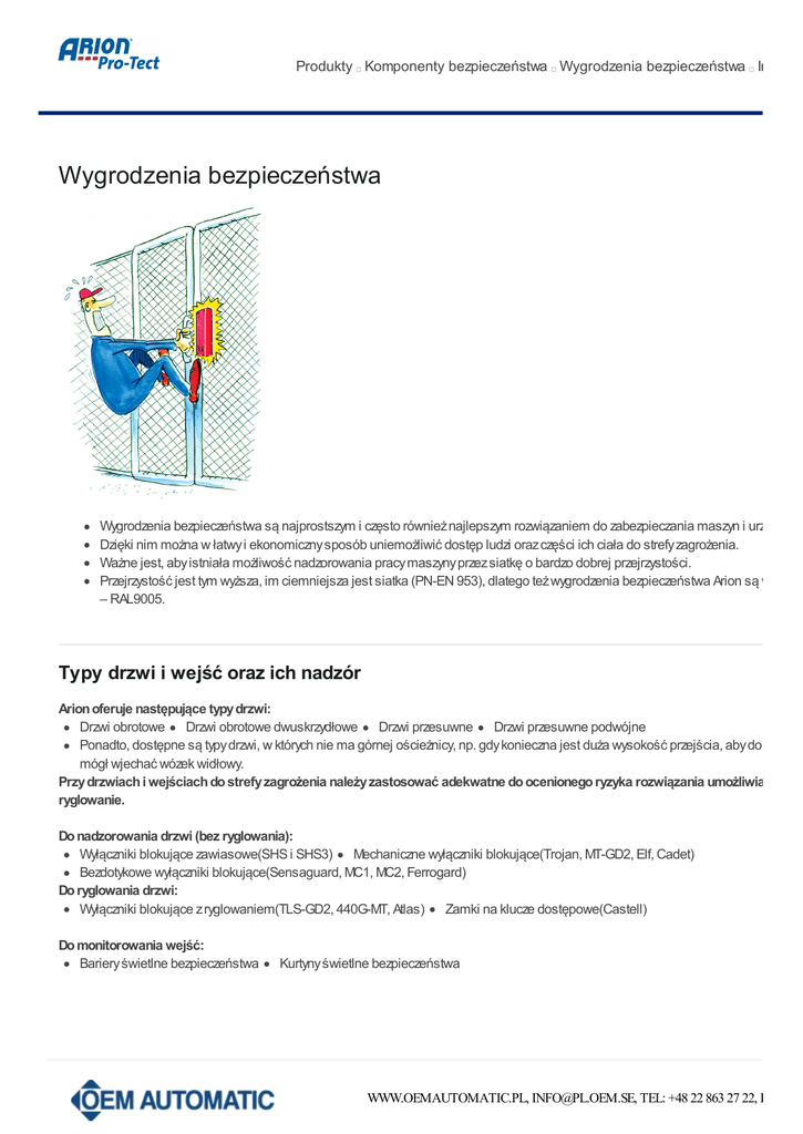 Produkty Komponenty bezpieczeństwa Wygrodzenia bezpieczeństwa Informc Wygrodzenia bezpieczeństwa Wygrodzenia bezpieczeństwa są najprostszym i często również najlepszym rozwiązaniem do zabezpieczania maszyn i urządzeń. Dzięki nim można w łatwy i ekonomiczny sposób uniemożliwić dostęp ludzi oraz części ich ciała do strefy zagrożenia. Ważne jest, aby istniała możliwość nadzorowania pracy maszyny przez siatkę o bardzo dobrej przejrzystości. Przejrzystość jest tym wyższa, im ciemniejsza jest siatka (PN-EN 953), dlatego też wygrodzenia bezpieczeństwa Arion są w kolorz – RAL9005. Typy drzwi i wejść oraz ich nadzór Arion oferuje następujące typy drzwi: Drzwi obrotowe Drzwi obrotowe dwuskrzydłowe Drzwi przesuwne Drzwi przesuwne podwójne Ponadto, dostępne są typy drzwi, w których nie ma górnej ościeżnicy, np. gdy konieczna jest duża wysokość przejścia, aby do strefy za mógł wjechać wózek widłowy. Przy drzwiach i wejściach do strefy zagrożenia należy zastosować adekwatne do ocenionego ryzyka rozwiązania umożliwiające blo ryglowanie. Do nadzorowania drzwi (bez ryglowania): Wyłączniki blokujące zawiasowe(SHS i SHS3) Mechaniczne wyłączniki blokujące(Trojan, MT-GD2, Elf, Cadet) Bezdotykowe wyłączniki blokujące(Sensaguard, MC1, MC2, Ferrogard) Do ryglowania drzwi: Wyłączniki blokujące z ryglowaniem(TLS-GD2, 440G-MT, Atlas) Zamki na klucze dostępowe(Castell) Do monitorowania wejść: Bariery świetlne bezpieczeństwa Kurtyny świetlne bezpieczeństwa WWW.OEMAUTOMATIC.PL, [email protected], TEL: +48 22 863 27 22, FAX: +4 Instalacja Czy w miejscu montażu jest taka wilgotność, że wygrodzenia mogą być narażone na korozję? Możemy dostarczyć wygrodzenia bezpieczeństwa wykonane w całości ze stali nierdzewnej albo ocynkowane. Dostępne są również p słupów wykonane ze stali nierdzewnej, dzięki czemu można uniknąć rdzewienia dolnych części słupa np. podczas mycia podłóg. Sta wysokości to 1700, 2100 oraz 2700 mm. Na życzenie dostarczamy również wygrodzenia o innych wysokościach. Na następnej stroni się tabelki wyboru wysokości wygrodzenia i odległości bezpieczeństwa zgodnie z normą PN-EN294. W ramach systemu wygrodzeń bezpieczeństwa Arion istnieje możliwość łączenia różnych wysokości zabudów. - Seuraavalla sivulla on aitakorkeuden ja turvaetäisyyksien valintataulukot standardista SFS-EN ISO 13857. Czy w wygrodzeniu będą potrzebne otwory dla tuneli przenośników lub inne otwory? Wykonamy otwory dla tuneli i inne otwory według wymiarów podanych przez klienta. W naszej ofercie są także kurtyny bezpieczeństwa monitorowania otworów transportowych. Jaki wyłącznik bezpieczeństwa jest potrzebny przy drzwiach? Możemy zaoferować zarówno mechaniczne, jak i bezkontaktowe wyłączniki bezpieczeństwa, a także rygle elektromagnetyczne. Jak wysokie powinno być wygrodzenie bezpieczeństwa? Jak blisko obiektu można postawić wygrodzenie?Rozmiar oczka w wygrodzeniach bezpieczeństwa Arion wynosi 20 x 100 mm, w związku z czym odległość bezpieczeństwa wynosi 120 mm. Uwaga! Należy możliwość sięgnięcia pod wygrodzeniem do niebezpiecznych obiektów. Można temu zapobiec montując przy podłodze płyty zabezpieczaj Montując blaszane i poliwęglanowe elementy, można zmniejszyć odległości bezpieczeństwa. Wymagane odległości bezpieczeństwa us podstawie oceny ryzyka. WWW.OEMAUTOMATIC.PL, [email protected], TEL: +48 22 863 27 22, FAX: +4
