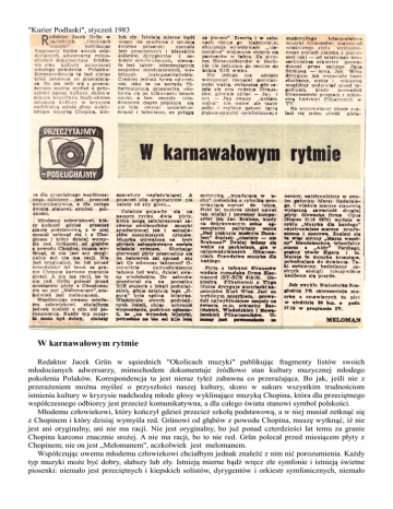 "Kurier Podlaski", styczeń 1983 W karnawałowym rytmie Redaktor Jacek Grün w sąsiednich "Okolicach muzyki" publikując fragmenty listów swoich młodocianych adwersarzy, mimochodem dokumentuje źródłowo stan kultury muzycznej młodego pokolenia Polaków. Korespondencja ta jest nieraz tyleż zabawna co przerażająca. Bo jak, jeśli nie z przerażeniem można myśleć o przyszłości naszej kultury, skoro w sukurs wszystkim trudnościom istnienia kultury w kryzysie nadchodzą młode głosy wyklinające muzyką Chopina, która dla przeciętnego współczesnego odbiorcy jest przecież komunikatywna, a dla całego świata stanowi symbol polskości. Młodemu człowiekowi, który kończył gdzieś przecież szkołą podstawową, a w niej musiał zetknąć się z Chopinem i który dzisiaj wymyśla red. Grünowi od głąbów z powodu Chopina, muszę wytknąć, iż nie jest ani oryginalny, ani nie ma racji. Nie jest oryginalny, bo już ponad czterdzieści lat temu za granie Chopina karcono znacznie srożej. A nie ma racji, bo to nie red. Grün polecał przed miesiącem płyty z Chopinem; nie on jest „Melomanem", aczkolwiek jest melomanem. Współczując owemu młodemu człowiekowi chciałbym jednak znaleźć z nim nić porozumienia. Każdy typ muzyki może być dobry, słabszy lub zły. Istnieją mierne bądź wręcz złe symfonie i istnieją świetne piosenki: niemało jest przeciętnych i kiepskich solistów, dyrygentów i orkiestr symfonicznych, niemało jest także interesujących zespołów młodzieżowych, wybitnych instrumentalistów. Częściej jednak bywa odwrotnie, jako że na estradę filharmoniczną przepustkę zdobywa się po kilkunastu latach nauki, a tzw. zespoły młodzieżowe często popisują się nie tyle swymi umiejętnościami i talentami, co potęgą aparatury nagłaśniającej. A przecież siła argumentów nie zależy od siły głosu… Ostatnio pojawiły się na naszym rynku dwie płyty, które mogą zainteresować zarówno zwolenników muzyki symfonicznej jak i entuzjastów mocniejszych rytmów. Muzyka utrwalona na tych płytach zainspirowana została właśnie rytmem. Słuchając pierwszej płyty przenosimy się do balowych sal sprzed stu lat. Co wówczas tańczono? Oczywiście najmodniejszym tańcem był walc, dzisiaj zwany wiedeńskim. Do salonów przedostał się na początku XIX stulecie, potem do lokali podmiejskich, gdzie ostatnią jego "figurą" była ogólna bijatyka. Właściciele owych podrzędnych lokali, chcąc uchronić wyposażanie, podobno ogłaszali, że "na wypadek bijatyki, potrzebne na ten cel kije leżą za piecem". Zresztą i w salonach różnie go traktowano; oburzenie wywoływało "niemoralne" wzajemne objęcie się partnerów w tańcu. Na dworze Hohenzollernów w Berlinie nie tańczono go jaszcze do końca XIX wieku. Nic jednak nie zdołało wstrzymać rosnącej popularności walca, zwłaszcza gdy zajęła się nim rodzina Straussów, głównie ojciec — Jan i syn — Jan zwany "królem walca". Ich walce, ale także polki i szybkie galopy łączą piękno muzyki symfonicznej z motoryką, "wpadającą w ucho" melodyką, rytmiką prowokującą wprost do tańca. Hołd tej muzyce złożył nawet tak wielki i poważny kompozytor jak Jan Brahms, kiedy na dedykowanym sobie egzemplarzu partytury walca "Nad pięknym modrym Dunajem" dopisał: "niestety — nie Brahmsa!" Dzisiaj tańczy się walca na parkietach, gra w najpoważniejszych filharmoniach. Prawdziwa muzyka dla każdego. Płytę g tańcami Straussów wydała rumuńska firma ELECTRECORD (ST-ECE 01810). Orkiestrą Filharmonii z Tirgu Mures dyryguje austriacki kapelmistrz Kurt Wöss. Jest on wybitnym muzykiem, prowadził najwybitniejsze zespoły na świecie, m.in. orkiestry Berlińskich, Wiedeńskich i Nowojorskich Filharmoników. Uznany jest powszechnie za znakomitego interpretatora muzyki Straussów; znajomość właściwego stylu wykonawczego posiadł niejako z pierwszej ręki — od ostatniego koncertmistrza orkiestry prowadzonej przez samego Jana Straussa — syna. Jak Wöss dyryguje, jak wspaniale bawi słuchaczy, siebie i orkiestrę mogliśmy podziwiać przed tygodniem, kiedy prowadził Straussowski program z orkiestrą Łódzkiej Filharmonii w Telewizji Polskiej. Na wspomnianej płycie znalazł się jeden utwór nietaneczny, najsłynniejszy w swoim gatunku Marsz Radeckiego. I właśnie marsze stanowią wyłączną zawartość drugiej płyty. Słowacka firma OPUS (Stereo 9110 0970) wydała w cyklu "Muzyka dla każdego" najsłynniejsze marsze symfoniczne i operowe. Znalazł się tu więc słynny Marsz weselny Mendelssohna, Tryumfalny marsz z Aidy Verdiego, piękny utwór Elgara i in. Marsze to muzyka krzepiąca, pobudzająca do działania. Taki codzienny, bezbolesny zastrzyk energii rzeczywiście każdemu się przyda. Jak zwykle Białostocka Rozgłośnia PR zaprezentuje muzykę z omawianych tu płyt w niedzielę 30 bm. o godz. 17.15 w programie IV. MELOMAN