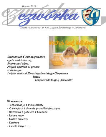 Marzec 2013 Szkoła Podstawowa nr 4 im. Stefana Żeromskiego w Jarosławiu Radosnych Świąt zwycięstwa życia nad śmiercią, Dobra nad złem, Miłych spotkań w gronie rodzinnym I wielu łask od Zmartwychwstałego Chrystusa życzy zespół redakcyjny „Czwórki" W numerze: - Informacje z życia szkoły - O świętach i okresie przedświątecznym - Rozmowa z gościem z Niemiec - Dobre rady - Nasze sukcesy - Konkurs - i wiele innych .... WIOSNA JUŻ SIĘ ZBLIŻA! Witamy w pierwszym w tym półroczu numerze „Czwórki”. Mimo że rozpoczęła się już kalendarzowa wiosna, ciężko jest się jej doczekać. Dla szóstoklasistów natomiast ta pora roku będzie najważniejsza i najcięższa – już niedługo czeka ich test. Ten numer podsumowuje trzy pierwsze miesiące 2013 roku, w których niewątpliwie wydarzyło się wiele. Z pewnością trzeba wspomnieć o Orszaku Trzech Króli, dyskotece walentynkowej czy Szkolnym Dniu Matematyki. Nie zabraknie informacji na temat kolejnego zawodu, porad i Świąt Wielkanocnych. Znajdziecie też podsumowanie konkursów kuratoryjnych. Poza tym będziecie mieli okazję do wzięcia udziału w konkursie z nagrodami. W imieniu zespołu redakcyjnego gorąco zapraszam do lektury i życzę wesołych Świąt Wielkiej Nocy, a zaraz po ... wielkiego sukcesu na sprawdzianie klas szóstych! EMILIA MATREJEK W uroczystość Trzech Króli SZLIŚMY W ORSZAKU Podobnie jak przed rokiem, uczniowie naszej szkoły wzięli udział w Orszaku Trzech Króli, który odbył się 6 stycznia. Przystrojeni w niebieskie szaty, reprezentowaliśmy kontynent afrykański. Każdy uczeń otrzymał specjalny strój. Dziewczęta przebrane były za dwórki afrykańskiego władcy, chłopcy za dzielnych wojów. Nasz orszak wyruszył sprzed kościoła Matki Bożej Bolesnej. Po drodze , przy parafii Trójcy Świętej, dołączyły do nas dzieci ze Szkoły Podstawowej nr 11. W tym samym czasie z innych parafii wyszły orszaki: azjatycki, europejski i Świętej Rodziny. Wszyscy maszerowali raźno, choć pogoda nie sprzyjała. Wspólnym celem był Rynek naszego miasta, gdzie na scenie nasi przedstawiciele oddali hołd Jezusowi, Maryi i św. Józefowi, składając prezenty oraz mówiąc wiersze. Zanim jednak dotarliśmy do „Betlejem:, przechodziliśmy obok zionącego nienawiścią Heroda oraz diabłów, które za wszelką cenę chciały odciągnąć nas od Dzieciątka . Herod był chorobliwie zazdrosny o to, że ktoś może odebrać mu władzę. Szatan zaś oferował wiele atrakcji, które miały zastąpić wizytę w żłóbku. Na szczęście na tej drodze byli też aniołowie, którzy pomogli pokonać trudności. W rolę wymienionych tu postaci wcieliła się jarosławska młodzież. DOMINIKA BZDOŃ Dekanalny etap konkursu biblijnego LISTY ŚW. PAWŁA ZNAJĄ ŚWIETNIE 21 uczniów z 7 szkół podstawowych dekanatu Jarosław I wzięło udział w II etapie konkursu biblijnego, poświęconego listom św. Pawła. Egzamin młodych znawców Pisma Świętego odbył się 27 lutego w Kolegiacie. Etap dekanalny poprzedził w listopadzie szkolny konkurs biblijny, w którym każda placówka wyłoniła 3 najlepszych uczniów. Oni to spotkali się w ostatnią środę lutego w świetlicy przy Kolegiacie. Nad przebiegiem konkursu czuwał ks. dziekan Jan Jagustyn. W ciągu godziny uczniowie musieli odpowiedzieć pisemnie na 39 szczegółowych pytań, odnoszących się do Listów św. Pawła do Rzymian, Galatów i Filipian. Po rozwiązaniu przez dzieci testu, komisja konkursowa przystąpiła do wyłonienia zwycięzców. Natomiast ks. proboszcz Marian Bocho oprowadził uczniów po świątyni, przedstawiając dzieje łaskami słynącego wizerunku Matki Bożej Śnieżnej Królowej Rodzin. Zaprosił także wszystkich na uroczystą koronację obrazu. Po zwiedzaniu przyszedł czas na poczęstunek, a następnie ogłoszenie wyników. Zwycięzcami okazali się : Biliński ze Szkoły Podst. nr 4 (I miejsce), Michał Daria Propola również z SP nr 4 (II miejsce) oraz Monika Czop (także SP 4) i Wiktoria Machała (SP w Wólce Pełkińskiej) - te dwie uczennice zajęły miejsce III. Wymienieni uczniowie będą reprezentować nasz dekanat podczas ostatniego już, diecezjalnego etapu konkursu, który odbędzie się 14 maja w Wyższym Seminarium Duchownym w Przemyślu. Gratulujemy i życzymy powodzenia! Dyskoteka przed feriami KARNAWAŁOWO I WALENTYNKOWO Jak zwykle w naszej szkole uczniowie klas IV – VI mieli okazję uczestniczyć w dyskotece karnawałowo – walentynkowej. Tym razem odbyła się ona 7 lutego. Młodsi uczniowie przed południem mieli zabawę. Wśród atrakcji dyskoteki było rozdawanie kartek walentynkowych. Specjalną pocztę z okazji 14 lutego zorganizowali uczniowie z samorządu. Wiele osób oczekiwało z niecierpliwością na wręczenie im koperty... Równie emocjonujące były wybory miss dyskoteki. Rywalizacja odbyła się w trzech kategoriach wiekowych. Wśród uczennic klas IV zwyciężyła Klaudia Ścibor z IV a. Miss klas V została Katarzyna Cużytek (V a), a klas VI – Marlena Kremer (VI b). Karnawałowe spotkanie było ostatnią w tym roku szkolnym dyskoteką – nie licząc pożegnalnej imprezy szóstoklasistów. JULIA TROJNIAK NA WESOŁO I POWAŻNIE Po raz kolejny wszyscy uczniowie mieli okazję uczestniczyć w Szkolnym Dniu Matematyki, przygotowanym przez nauczycieli tego przedmiotu. Tegoroczne święto królowej nauk odbyło się 5 lutego i, jak zwykle, stało się sposobnością do wesołego i poważnego spojrzenia na przedmiot, bez znajomości którego trudno poradzić sobie w życiu. Dzień ten poprzedziły liczne konkursy związane z matematyką. Klasy czwarte i piąte uczestniczyły np. w zmaganiach dotyczących matematycznych zagadek. We wszystkich oddziałach odbyły się lekcje matematyki w języku niemieckim i angielskim, dzieci wykonały też obcojęzyczne plakaty na ten temat. W ramach techniki piątoklasiści zrobili mozaiki matematyczne, wyeksponowane na korytarzu III piętra. 